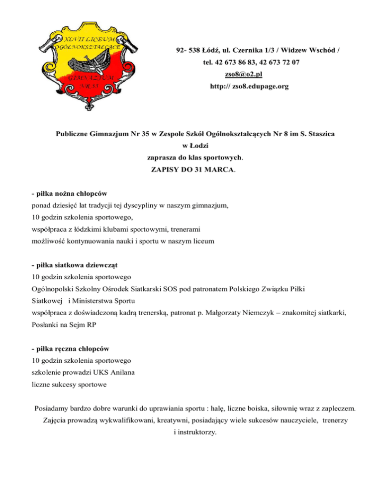 92- 538 Łódź, ul. Czernika 1/3 / Widzew Wschód / tel. 42 673 86 83, 42 673 72 07 [email protected] http:// zso8.edupage.org Publiczne Gimnazjum Nr 35 w Zespole Szkół Ogólnokształcących Nr 8 im S. Staszica w Łodzi zaprasza do klas sportowych. ZAPISY DO 31 MARCA. - piłka nożna chłopców ponad dziesięć lat tradycji tej dyscypliny w naszym gimnazjum, 10 godzin szkolenia sportowego, współpraca z łódzkimi klubami sportowymi, trenerami możliwość kontynuowania nauki i sportu w naszym liceum - piłka siatkowa dziewcząt 10 godzin szkolenia sportowego Ogólnopolski Szkolny Ośrodek Siatkarski SOS pod patronatem Polskiego Związku Piłki Siatkowej i Ministerstwa Sportu współpraca z doświadczoną kadrą trenerską, patronat p. Małgorzaty Niemczyk – znakomitej siatkarki, Posłanki na Sejm RP - piłka ręczna chłopców 10 godzin szkolenia sportowego szkolenie prowadzi UKS Anilana liczne sukcesy sportowe Posiadamy bardzo dobre warunki do uprawiania sportu : halę, liczne boiska, siłownię wraz z zapleczem. Zajęcia prowadzą wykwalifikowani, kreatywni, posiadający wiele sukcesów nauczyciele, trenerzy i instruktorzy. Klasy sportowe działają zgodnie z ROZPORZĄDZENIEM MINISTRA EDUKACJI NARODOWEJ z dnia 15 października 2012 r. w sprawie warunków tworzenia, organizacji oraz działania oddziałów sportowych, szkół sportowych oraz szkół mistrzostwa sportowego. Klasy sportowe finansowane są przez Urząd Miasta Łodzi. Szkoła jest stałym organizatorem zawodów i imprez sportowych na zlecenie Miejskiego Szkolnego Związku Sportowego. Szkoła jest ośrodkiem metodycznym dla nauczycieli wychowania fizycznego. Warunki organizacyjne: - zadaniem edukacji w klasach sportowych jest rozwijanie zainteresowań sportowych w różnych dyscyplinach sportu, łączenie nauki ze sportem, wdrażanie nawyków zdrowego trybu życia, współpraca z klubami i organizacjami sportowymi - kandydaci do klas sportowych muszą posiadać zaświadczenia wydane przez lekarza medycyny sportowej o braku przeciwwskazań do uprawiania sportu - uczniowie realizują 10 godzin wychowania fizycznego tygodniowo / 4 godziny wychowania fizycznego i 6 godzin treningu specjalistycznego/, tj. uczniowie tych klas mają o 6 godzin lekcyjnych więcej niż pozostali - plan lekcji dostosowany jest do planu treningów, zajęcia trwają maksymalnie do godziny 16.30. - liczebność uczniów w klasach sportowych – 20 uczniów, w grupach sportowych – 10-12 uczniów - na terenie szkoły działają bufety, można tam wykupić również obiad w miesięcznym abonamencie - najlepsi uczniowie otrzymują status zawodników klubowych, biorą udział w rozgrywkach ligowych, turniejach regionalnych i ogólnopolskich ZAPRASZAMY DZIECI i RODZICÓW którym ZALEŻY na : SPORTOWYM TRYBIE ŻYCIA ROZWIJANIU ZAINTERESOWAŃ SPORTEM ZORGANIZOWANYM CIEKAWYMI ZAJĘCIAMI CZASIE PO LEKCJACH AKTYWNOŚCI FIZYCZNEJ WSZECHSTRONNYM ROZWOJU DZIECKA.