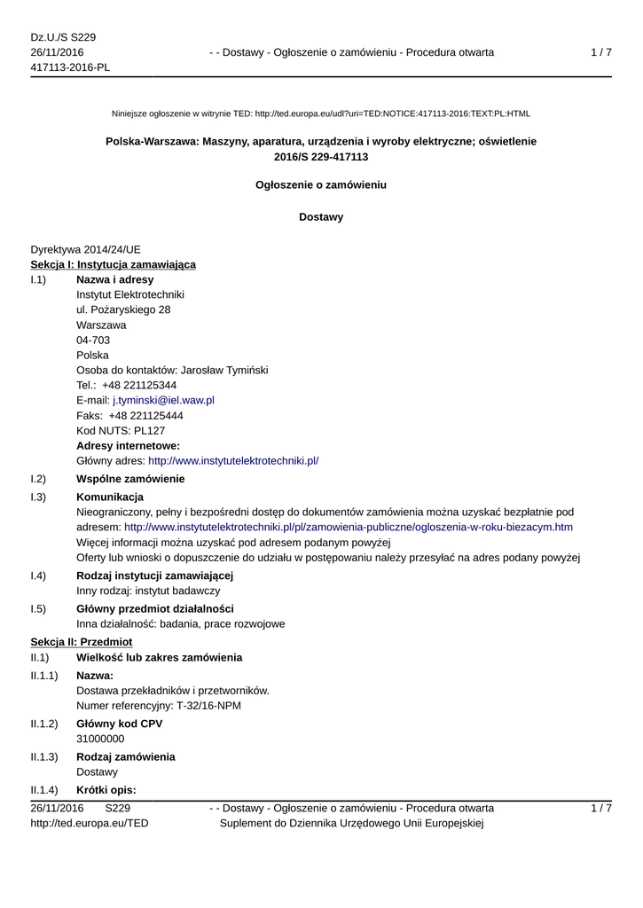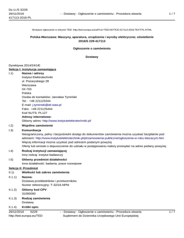 Dz.U./S S229 26/11/2016 417113-2016-PL - - Dostawy - Ogłoszenie o zamówieniu - Procedura otwarta 1/7 Niniejsze ogłoszenie w witrynie TED: http://ted.europa.eu/udl?uri=TED:NOTICE:417113-2016:TEXT:PL:HTML Polska-Warszawa: Maszyny, aparatura, urządzenia i wyroby elektryczne; oświetlenie 2016/S 229-417113 Ogłoszenie o zamówieniu Dostawy Dyrektywa 2014/24/UE Sekcja I: Instytucja zamawiająca I.1) Nazwa i adresy Instytut Elektrotechniki ul. Pożaryskiego 28 Warszawa 04-703 Polska Osoba do kontaktów: Jarosław Tymiński Tel.: +48 221125344 E-mail: [email protected] Faks: +48 221125444 Kod NUTS: PL127 Adresy internetowe: Główny adres: http://www.instytutelektrotechniki.pl/ I.2) Wspólne zamówienie I.3) Komunikacja Nieograniczony, pełny i bezpośredni dostęp do dokumentów zamówienia można uzyskać bezpłatnie pod adresem: http://www.instytutelektrotechniki.pl/pl/zamowienia-publiczne/ogloszenia-w-roku-biezacym.htm Więcej informacji można uzyskać pod adresem podanym powyżej Oferty lub wnioski o dopuszczenie do udziału w postępowaniu należy przesyłać na adres podany powyżej I.4) Rodzaj instytucji zamawiającej Inny rodzaj: instytut badawczy I.5) Główny przedmiot działalności Inna działalność: badania, prace rozwojowe Sekcja II: Przedmiot II.1) Wielkość lub zakres zamówienia II.1.1) Nazwa: Dostawa przekładników i przetworników. Numer referencyjny: T-32/16-NPM II.1.2) Główny kod CPV 31000000 II.1.3) Rodzaj zamówienia Dostawy II.1.4) Krótki opis: 26/11/2016 S229 http://ted.europa.eu/TED - - Dostawy - Ogłoszenie o zamówieniu - Procedura otwarta Suplement do Dziennika Urzędowego Unii Europejskiej 1/7 Dz.U./S S229 26/11/2016 417113-2016-PL - - Dostawy - Ogłoszenie o zamówieniu - Procedura otwarta 2/7 Przedmiotem zamówienia jest dostawa: Część I: przekładników napięciowych izolowanych dwubiegunowych z bezpiecznikami od strony ŚN, Ilość – 4 szt. Część II: przetworników 1. przetworniki napięcia, Ilość – 6 szt, 2. przetworniki prądu, Ilość – 6 szt. II.1.5) Szacunkowa całkowita wartość Wartość bez VAT: 955 000.00 PLN II.1.6) Informacje o częściach To zamówienie podzielone jest na części: tak Oferty można składać w odniesieniu do wszystkich części II.2) Opis II.2.1) Nazwa: Dostawa przekładników napięciowych izolowanych dwubiegunowych z bezpiecznikami od strony ŚN Część nr: 1 II.2.2) Dodatkowy kod lub kody CPV 31700000 II.2.3) Miejsce świadczenia usług Kod NUTS: PL127 Główne miejsce lub lokalizacja realizacji: Instytut Elektrotechniki, ul. Pożaryskiego 28, 04-703 Warszawa, Zakład Przekształtników Mocy, budynek nr 20. II.2.4) Opis zamówienia: Dostawa przekładników napięciowych izolowanych dwubiegunowych z bezpiecznikami od strony ŚN, Ilość – 4 szt. Dane techniczne: Znamionowe napięcie izolacji 12/28/75 kV Znamionowe napięcie pierwotne 11 kV Jedno uzwojeniowe wtórne Znamionowe napięcie wtórne 100 V Moc znamionowa uzwojenia wtórnego 5 VA Klasa dokładności 0,2 Znamionowa częstotliwość 50 Hz Moc graniczna 400 VA Przekładniki powinny mieć aktualną legalizację UM. Wymiary: — długość 390 mm, — szerokość 150 mm, — wysokość łącznie z podstawą bezpiecznikową 335 mm. II.2.5) Kryteria udzielenia zamówienia Kryteria określone poniżej Cena II.2.6) Szacunkowa wartość Wartość bez VAT: 15 000.00 PLN II.2.7) Okres obowiązywania zamówienia, umowy ramowej lub dynamicznego systemu zakupów Okres w dniach: 42 26/11/2016 S229 http://ted.europa.eu/TED - - Dostawy - Ogłoszenie o zamówieniu - Procedura otwarta Suplement do Dziennika Urzędowego Unii Europejskiej 2/7 Dz.U./S S229 26/11/2016 417113-2016-PL - - Dostawy - Ogłoszenie o zamówieniu - Procedura otwarta 3/7 Niniejsze zamówienie podlega wznowieniu: nie II.2.10) Informacje o ofertach wariantowych Dopuszcza się składanie ofert wariantowych: nie II.2.11) Informacje o opcjach Opcje: nie II.2.12) Informacje na temat katalogów elektronicznych II.2.13) Informacje o funduszach Unii Europejskiej Zamówienie dotyczy projektu/programu finansowanego ze środków Unii Europejskiej: nie II.2.14) Informacje dodatkowe II.2) Opis II.2.1) Nazwa: Dostawa przetworników Część nr: 2 II.2.2) Dodatkowy kod lub kody CPV 31700000 II.2.3) Miejsce świadczenia usług Kod NUTS: PL127 Główne miejsce lub lokalizacja realizacji: Instytut Elektrotechniki, ul. Pożaryskiego 28, 04-703 Warszawa, Zakład Przekształtników Mocy, budynek nr 20. II.2.4) Opis zamówienia: 1. przetworniki napięcia, Ilość – 6 szt. Dane techniczne: Znamionowe napięcie pierwotne rms 3000 V Zakres pomiarowy napięcia pierwotnego 0t 5000 V Znamionowy prąd pierwotny wartość skuteczna 3,33 mA Rezystancja pomiarowa: Rmin Rmax dla ± 15 V ± 3000 Vmax 0 210 ± 15 V ± 5000 Vmax 0 102 dla ± 24 V ± 3000 Vmax 100 360 ± 24 V ± 5000 Vmax 100 190 Prąd wtórny rms 50 mA Przekładnia pomiarowa 3000 V, 50 mA Napięcie zasilania ± 15 V, 24 V Całkowita dokładność pomiarowa dla temperatury otoczenia 25C ± 0,9 % Uchyb temperaturowy prądu zerowego Ip = 0 dla temperatury otoczenia 25C ± 0,2 mA Dryft temperaturowy prądu zerowego dla: tip max uchybu prądu zerowego -25C – +70C ±0,3 ±0,6 mA — 40C – +70C ±0,4 ±0,8 mA Czas odpowiedzi dla 90 % napięcia VPN 70 µs Temperatura otoczenia -40 do +85C Całkowita moc pobrana 10 W 26/11/2016 S229 http://ted.europa.eu/TED - - Dostawy - Ogłoszenie o zamówieniu - Procedura otwarta Suplement do Dziennika Urzędowego Unii Europejskiej 3/7 Dz.U./S S229 26/11/2016 417113-2016-PL - - Dostawy - Ogłoszenie o zamówieniu - Procedura otwarta 4/7 Wytrzymałość izolacji na przebicie AC 50 Hz, 1 min 12 kV 2. przetworniki prądu, Ilość – 6 szt. Dane techniczne: Znamionowy prąd pierwotny rms 500 A Zakres pomiarowy prądu pierwotnego 0 ±1500 A Stromość prądowa 10/10 kA/ms Rezystancja pomiarowa: Rmin Rmax dla zasilania ± 15 V Ip ± 500 A 0 70 Ip ± 1200 A 0 5 dla zasilania ± 24 V Ip ± 500 A 0 150 Ip ± 1500 A 0 20 Prąd wtórny