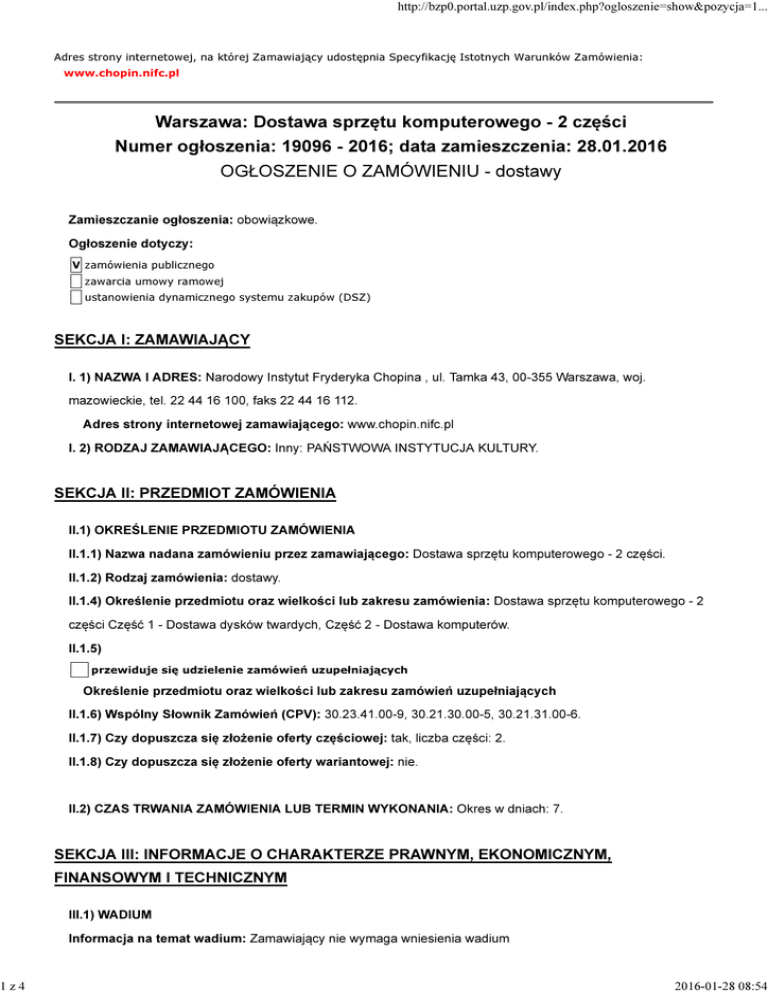 1z4 http://bzp0.portal.uzp.gov.pl/index.php?ogloszenie=show&pozycja=1... Adres strony internetowej, na której Zamawiający udostępnia Specyfikację Istotnych Warunków Zamówienia: www.chopin.nifc.pl Warszawa: Dostawa sprzętu komputerowego - 2 części Numer ogłoszenia: 19096 - 2016; data zamieszczenia: 28.01.2016 OGŁOSZENIE O ZAMÓWIENIU - dostawy Zamieszczanie ogłoszenia: obowiązkowe. Ogłoszenie dotyczy: V zamówienia publicznego zawarcia umowy ramowej ustanowienia dynamicznego systemu zakupów (DSZ) SEKCJA I: ZAMAWIAJĄCY I. 1) NAZWA I ADRES: Narodowy Instytut Fryderyka Chopina , ul. Tamka 43, 00-355 Warszawa, woj. mazowieckie, tel. 22 44 16 100, faks 22 44 16 112. Adres strony internetowej zamawiającego: www.chopin.nifc.pl I. 2) RODZAJ ZAMAWIAJĄCEGO: Inny: PAŃSTWOWA INSTYTUCJA KULTURY. SEKCJA II: PRZEDMIOT ZAMÓWIENIA II.1) OKREŚLENIE PRZEDMIOTU ZAMÓWIENIA II.1.1) Nazwa nadana zamówieniu przez zamawiającego: Dostawa sprzętu komputerowego - 2 części. II.1.2) Rodzaj zamówienia: dostawy. II.1.4) Określenie przedmiotu oraz wielkości lub zakresu zamówienia: Dostawa sprzętu komputerowego - 2 części Część 1 - Dostawa dysków twardych, Część 2 - Dostawa komputerów. II.1.5) przewiduje się udzielenie zamówień uzupełniających Określenie przedmiotu oraz wielkości lub zakresu zamówień uzupełniających II.1.6) Wspólny Słownik Zamówień (CPV): 30.23.41.00-9, 30.21.30.00-5, 30.21.31.00-6. II.1.7) Czy dopuszcza się złożenie oferty częściowej: tak, liczba części: 2. II.1.8) Czy dopuszcza się złożenie oferty wariantowej: nie. II.2) CZAS TRWANIA ZAMÓWIENIA LUB TERMIN WYKONANIA: Okres w dniach: 7. SEKCJA III: INFORMACJE O CHARAKTERZE PRAWNYM, EKONOMICZNYM, FINANSOWYM I TECHNICZNYM III.1) WADIUM Informacja na temat wadium: Zamawiający nie wymaga wniesienia wadium 2016-01-28 08:54 2z4 http://bzp0.portal.uzp.gov.pl/index.php?ogloszenie=show&pozycja=1... III.2) ZALICZKI III.4) INFORMACJA O OŚWIADCZENIACH LUB DOKUMENTACH, JAKIE MAJĄ DOSTARCZYĆ WYKONAWCY W CELU POTWIERDZENIA SPEŁNIANIA WARUNKÓW UDZIAŁU W POSTĘPOWANIU ORAZ NIEPODLEGANIA WYKLUCZENIU NA PODSTAWIE ART. 24 UST. 1 USTAWY III.4.1) W zakresie wykazania spełniania przez wykonawcę warunków, o których mowa w art. 22 ust. 1 ustawy, oprócz oświadczenia o spełnianiu warunków udziału w postępowaniu należy przedłożyć: III.4.2) W zakresie potwierdzenia niepodlegania wykluczeniu na podstawie art. 24 ust. 1 ustawy, należy przedłożyć: oświadczenie o braku podstaw do wykluczenia; aktualny odpis z właściwego rejestru lub z centralnej ewidencji i informacji o działalności gospodarczej, jeżeli odrębne przepisy wymagają wpisu do rejestru lub ewidencji, w celu wykazania braku podstaw do wykluczenia w oparciu o art. 24 ust. 1 pkt 2 ustawy, wystawiony nie wcześniej niż 6 miesięcy przed upływem terminu składania wniosków o dopuszczenie do udziału w postępowaniu o udzielenie zamówienia albo składania ofert; aktualne zaświadczenie właściwego naczelnika urzędu skarbowego potwierdzające, że wykonawca nie zalega z opłacaniem podatków, lub zaświadczenie, że uzyskał przewidziane prawem zwolnienie, odroczenie lub rozłożenie na raty zaległych płatności lub wstrzymanie w całości wykonania decyzji właściwego organu - wystawione nie wcześniej niż 3 miesiące przed upływem terminu składania wniosków o dopuszczenie do udziału w postępowaniu o udzielenie zamówienia albo składania ofert; aktualne zaświadczenie właściwego oddziału Zakładu Ubezpieczeń Społecznych lub Kasy Rolniczego Ubezpieczenia Społecznego potwierdzające, że wykonawca nie zalega z opłacaniem składek na ubezpieczenia zdrowotne i społeczne, lub potwierdzenie, że uzyskał przewidziane prawem zwolnienie, odroczenie lub rozłożenie na raty zaległych płatności lub wstrzymanie w całości wykonania decyzji właściwego organu - wystawione nie wcześniej niż 3 miesiące przed upływem terminu składania wniosków o dopuszczenie do udziału w postępowaniu o udzielenie zamówienia albo składania ofert; III.4.3) Dokumenty podmiotów zagranicznych Jeżeli wykonawca ma siedzibę lub miejsce zamieszkania poza terytorium Rzeczypospolitej Polskiej, przedkłada: III.4.3.1) dokument wystawiony w kraju, w którym ma siedzibę lub miejsce zamieszkania potwierdzający, że: nie otwarto jego likwidacji ani nie ogłoszono upadłości - wystawiony nie wcześniej niż 6 miesięcy przed upływem terminu składania wniosków o dopuszczenie do udziału w postępowaniu o udzielenie zamówienia albo składania ofert; III.4.4) Dokumenty dotyczące przynależności do tej samej grupy kapitałowej 2016-01-28 08:54 3z4 http://bzp0.portal.uzp.gov.pl/index.php?ogloszenie=show&pozycja=1... lista podmiotów należących do tej samej grupy kapitałowej w rozumieniu ustawy z dnia 16 lutego 2007 r. o ochronie konkurencji i konsumentów albo informacji o tym, że nie należy do grupy kapitałowej; SEKCJA IV: PROCEDURA IV.1) TRYB UDZIELENIA ZAMÓWIENIA IV.1.1) Tryb udzielenia zamówienia: przetarg nieograniczony. IV.2) KRYTERIA OCENY OFERT IV.2.1) Kryteria oceny ofert: cena oraz inne kryteria związane z przedmiotem zamówienia: 1 - Cena - 97 2 - Okres gwarancji - 3 IV.2.2) przeprowadzona będzie aukcja elektroniczna, adres strony, na której będzie prowadzona: IV.3) ZMIANA UMOWY przewiduje się istotne zmiany postanowień zawartej umowy w stosunku do treści oferty, na podstawie której dokonano wyboru wykonawcy: Dopuszczalne zmiany postanowień umowy oraz określenie warunków zmian Zamawiający zgodnie z art. 144 ustawy Prawo zamówień publicznych przewiduje możliwość zmiany umowy w sytuacjach opisanych w istotnych postanowieniach do umowy stanowiących załącznik nr 3 do SIWZ IV.4) INFORMACJE ADMINISTRACYJNE IV.4.1) Adres strony internetowej, na której jest dostępna specyfikacja istotnych warunków zamówienia: www.chopin.nifc.pl Specyfikację istotnych warunków zamówienia można uzyskać pod adresem: 