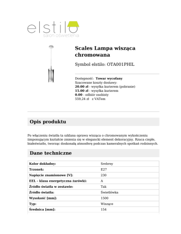 Scales Lampa wisząca chromowana Symbol elstilo: OTA001PHIL Dostępność: Towar wycofany Szacowane koszty dostawy: 20.00 zł - wysyłka kurierem (pobranie) 15.00 zł - wysyłka kurierem 0.00 - odbiór osobisty 559,24 zł z VATem Opis produktu Po włączeniu światła ta szklana oprawa wisząca o chromowanym wykończeniu iimponującym kształcie zmienia się w elegancki element dekoracyjny. Rzuca ciepłe, białeświatło, tworząc doskonałą atmosferę podczas kameralnych spotkań rodzinnych. Dane techniczne Kolor dokładny: Srebrny Trzonek: E27 Napięcie znamionowe [V]: 230 EEL - klasa energetyczna żarówki: A Źródło światła w zestawie: Tak Źródło światła: Świetlówka Wysokość [mm]: 1500 Typ: Wiszące Średnica [mm]: 154 Rodzina: Scales Rodzaj: Wewnętrzne Moc [W]: 60 Kolor: Srebrny Ilość źródeł światła: 1