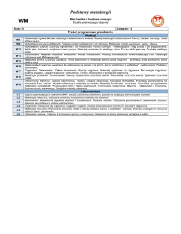 Podstawy metalurgii WM Mechanika i budowa maszyn Studia pierwszego stopnia Rok: III Semestr: 5 Treści programowe przedmiotu Wykład W1 W2 W3 W4 W5 W6 W7 W8 W9 Wiadomości ogólne: Rozwój metalurgii i odlewnictwa w świecie. Rozwój metalurgii i odlewnictwa w Polsce. Metale i ich stopy. Układ Ŝelazo węgiel. Wytwarzanie metali nieŜelaznych: Rodzaje metali nieŜelaznych i ich rafinacja. Metalurgia miedzi, aluminium, cynku i ołowiu. Wytwarzanie surówki: Materiały ogniotrwałe i ich właściwości. Paliwa hutnicze – metalurgiczne. Rudy Ŝelaza i ich przygotowanie. Wielki piec, budowa i urządzenia towarzyszące. Materiały wsadowe do wielkiego pieca. Proces wielkopiecowy. Produkty wielkiego pieca. Stalownictwo: Materiały wsadowe. Mieszalniki. Proces martenowski. Procesy konwertorowe. Elektrometalurgia stali. Metalurgia próŜniowa stali. Odlewanie stali. Metalurgia Ŝeliwa: Materiały wsadowe. Piece stosowane w metalurgii Ŝeliwa (piece szybowe – Ŝeliwiaki), piece płomienne, piece elektryczne). Walcownictwo: Materiały wyjściowe do walcowania na gorąco i na zimno. Zarys wiadomości o walcarkach i walcowniach. Podstawy walcowania. Ciągarstwo: Nazewnictwo. Zakres stosowania. Wyroby ciągnione. Materiały wyjściowe do ciągnienia. Technologia ciągnienia. Budowa ciągadeł. Ciągarki bębnowe i łańcuchowe. Tarcie i smarowanie w procesach ciągnienia. Metalurgia proszków: Zastosowanie. Metody wytwarzania proszków metali. Prasowanie proszków metali. Spiekanie proszków metali. Odlewnictwo: Definicja i podział odlewnictwa. Nazwy i pojęcia odlewnicze. Narzędzia formierskie. Przyrządy przeznaczone do wykonania form i rdzeni. Modele odlewnicze i materiały na modele. Materiały formierskie i rdzeniowe. Przeróbka i przygotowanie materiałów formierskich. Wykonywanie form i rdzeni piaskowych. Formowanie maszynowe. Rdzenie – właściwości i wykonanie. Budowa układu wlewowego. Specjalne metody odlewania. Laboratorium L1 L2 L3 L4 L5 L6 Zajęcia wprowadzające: Szkolenie BHP, zasady zaliczenia przedmiotu, podział na podgrupy, harmonogram ćwiczeń. Metalurgia: wlewnice, odlewanie wlewków, krzepniecie materiału we wlewnicy. Walcowanie: Walcowanie wyrobów płaskich i kształtowych. Budowa walców. Obliczenia podstawowych parametrów procesu. Zjawiska zachodzące w kotlinie walcowniczej. Ciągnienie: Obliczanie siły ciągnienia. Ciągadła i ciągarki. Analiza doświadczalna wybranych procesów ciągnienia. Metalurgia proszków: Prasowanie proszków metali o róŜnej wielkości ziarna, z dodatkiem (lub bez) środków smarujących oraz przy róŜnych siłach prasowania. Odlewanie: Modele. Rdzenie. Formowanie ręczne i maszynowe. Odlewanie do formy piaskowej. Wybijanie modelu.