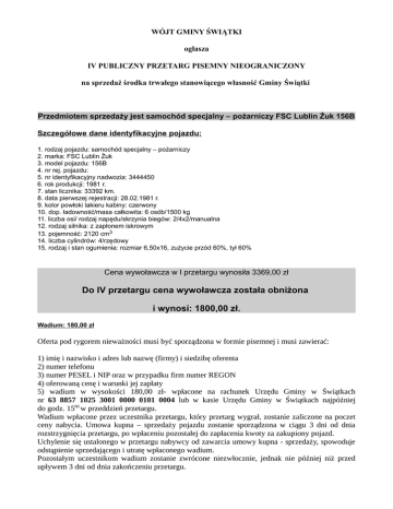 WÓJT GMINY ŚWIĄTKI ogłasza IV PUBLICZNY PRZETARG PISEMNY NIEOGRANICZONY na sprzedaż środka trwałego stanowiącego własność Gminy Świątki Przedmiotem sprzedaży jest samochód specjalny – pożarniczy FSC Lublin Żuk 156B Szczegółowe dane identyfikacyjne pojazdu: 1. rodzaj pojazdu: samochód specjalny – pożarniczy 2. marka: FSC Lublin Żuk 3. model pojazdu: 156B 4. nr rej. pojazdu: 5. nr identyfikacyjny nadwozia: 3444450 6. rok produkcji: 1981 r. 7. stan licznika: 33392 km. 8. data pierwszej rejestracji: 28.02.1981 r. 9. kolor powłoki lakieru kabiny: czerwony 10. dop. ładowność/masa całkowita: 6 osób/1500 kg 11. liczba osi/ rodzaj napędu/skrzynia biegów: 2/4x2/manualna 12. rodzaj silnika: z zapłonem iskrowym 13. pojemność: 2120 cm3 14. liczba cylindrów: 4/rzędowy 15. rodzaj i stan ogumienia: rozmiar 6,50x16, zużycie przód 60%, tył 60% Cena wywoławcza w I przetargu wynosiła 3369,00 zł Do IV przetargu cena wywoławcza została obniżona i wynosi: 1800,00 zł. Wadium: 180,00 zł Oferta pod rygorem nieważności musi być sporządzona w formie pisemnej i musi zawierać: 1) imię i nazwisko i adres lub nazwę (firmy) i siedzibę oferenta 2) numer telefonu 3) numer PESEL i NIP oraz w przypadku firm numer REGON 4) oferowaną cenę i warunki jej zapłaty 5) wadium w wysokości 180,00 zł- wpłacone na rachunek Urzędu Gminy w Świątkach nr 63 8857 1025 3001 0000 0101 0004 lub w kasie Urzędu Gminy w Świątkach najpóźniej do godz. 1500 w przeddzień przetargu. Wadium wpłacone przez uczestnika przetargu, który przetarg wygrał, zostanie zaliczone na poczet ceny nabycia. Umowa kupna – sprzedaży pojazdu zostanie sporządzona w ciągu 3 dni od dnia rozstrzygnięcia przetargu, po wpłaceniu pozostałej do zapłacenia kwoty za zakupiony pojazd. Uchylenie się ustalonego w przetargu nabywcy od zawarcia umowy kupna - sprzedaży, spowoduje odstąpienie sprzedającego i utratę wpłaconego wadium. Pozostałym uczestnikom wadium zostanie zwrócone niezwłocznie, jednak nie później niż przed upływem 3 dni od dnia zakończeniu przetargu. Dowód wniesienia wadium przez uczestnika przetargu podlega przedłożeniu komisji przetargowej przed otwarciem przetargu. 6) oświadczenie oferenta, że przystępując do przetargu zapoznał się ze stanem technicznym pojazdu lub, że ponosi odpowiedzialność za skutki wynikające z rezygnacji z oględzin. Termin, miejsce i tryb złożenia oferty oraz okres, w którym oferta jest wiążąca: 1. Ofertę należy złożyć w zamkniętej kopercie najpóźniej do dnia 5 stycznia 2016 r. do godz. 12:00 Koperta musi być zaadresowana wg poniższego wzoru: Gmina Świątki 11-008 Świątki, Świątki 87 z dopiskiem: „Oferta przetargowa na zakup samochodu strażackiego marki FSC Lublin Żuk 156B – nie otwierać przed 05-01-2016 r. Godz.12:00” 2. Oferty należy składać w godzinach pracy Urzędu Gminy tj. od poniedziałku do czwartku w godz. 7:00-15:00 – oraz w piątki w godz. 7:00-12:00 3. Okres związania ofertą – 14 dni od dnia upływu terminu składania ofert. Organizatorowi przetargu przysługuje prawo zamknięcia przetargu bez wybrania którejkolwiek z ofert. Informacje dodatkowe: 1. Komisja przetargowa wybierze oferenta, który zaoferuje najwyższą cenę. 2. Nabywca jest zobowiązany zapłacić cenę nabycia w terminie nie dłuższym niż 3 dni od daty przetargu na konto bankowe Gminy Świątki. 3. Wydanie przedmiotu sprzedaży nabywcy nastąpi niezwłocznie po dokonaniu wpłaty i podpisaniu umowy sprzedaży. Wójt Gminy Świątki /-/ Słwomir Kowalczyk