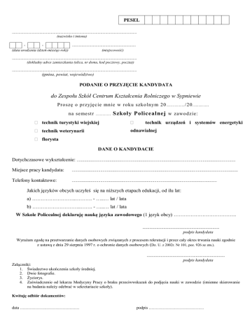 PESEL ................................................................................................................................... (nazwisko i imiona) ................................................................... (data urodzenia (dzień-miesiąc-rok)) (miejscowość) ................................................................................................................................... (dokładny adres zamieszkania (ulica, nr domu, kod pocztowy, poczta)) ................................................................................................................................... (gmina, powiat, województwo) PODANIE O PRZYJĘCIE KANDYDATA do Zespołu Szkół Centrum Kształcenia Rolniczego w Sypniewie Proszę o przyjęcie mnie w roku szko lnym 20 …. . ….. .. /20 . …….… na semest r . .. .. .. . .. . Szkoły Policealnej w zawodzie: technik turystyki wiejskiej technik weterynarii odnawialnej technik urządzeń i systemów energetyki florysta DANE O KANDYDACIE Dotychczasowe wykształcenie: ...................................................................................................................................................... Miejsce pracy kandydata: ............................................................................................................................................................. Telefony kontaktowe: ......................................................................................................................................... Jakich języków obcych uczyłeś się na niższych etapach edukacji, od ilu lat: a) ……………………..………. - …..… lat / lata b) ………………………..……. - …..… lat / lata W Szkole Policealnej deklaruję naukę języka zawodowego (1 język obcy) ………………………………. .................................................................. podpis kandydata Wyrażam zgodę na przetwarzanie danych osobowych związanych z procesem rekrutacji i przez cały okres trwania nauki zgodnie z ustawą z dnia 29 sierpnia 1997 r. o ochronie danych osobowych (Dz. U. z 2002r. Nr 101, poz. 926 ze zm.). ................................................................... podpis kandydata Załączniki: 1. Świadectwo ukończenia szkoły średniej. 2. Dwie fotografie. 3. Życiorys. 4. Zaświadczenie od lekarza Medycyny Pracy o braku przeciwwskazań do podjęcia nauki w zawodzie (imienne skierowanie na badania należy odebrać w sekretariacie szkoły). Kwituję odbiór dokumentów: data …………………………………… podpis …………………………………