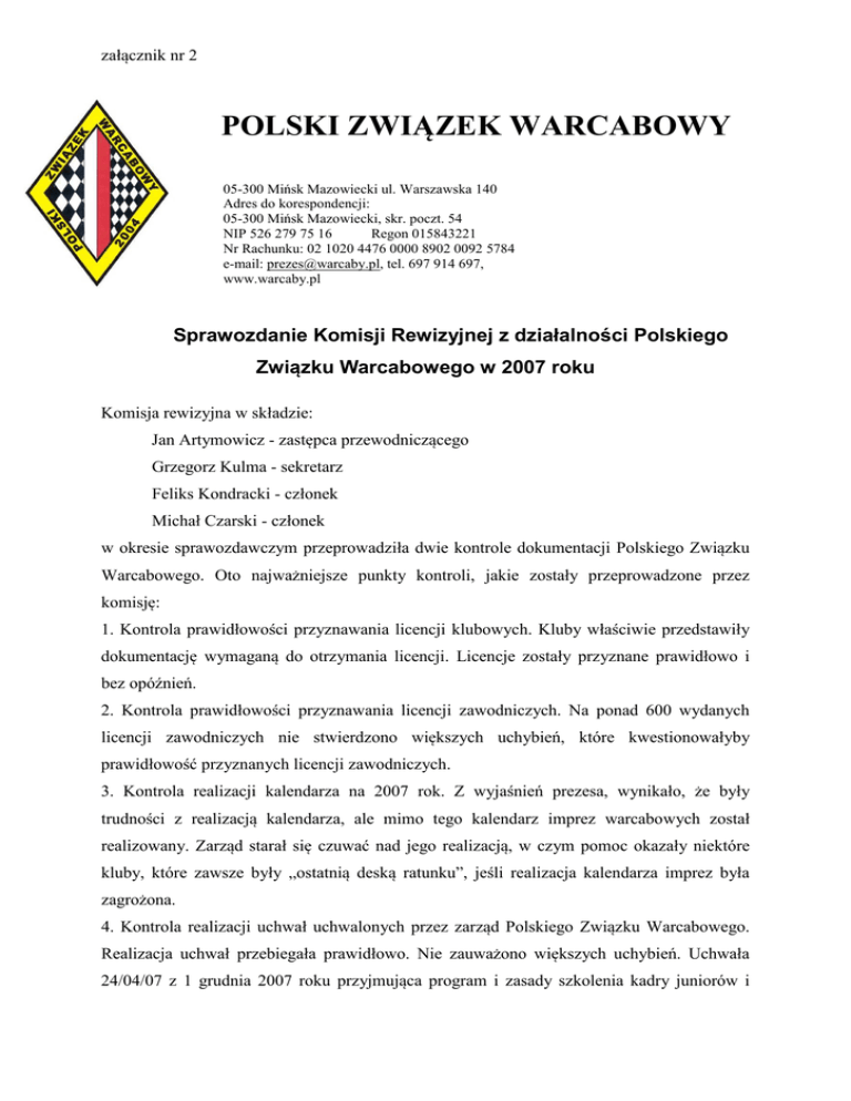 załącznik nr 2 POLSKI ZWIĄZEK WARCABOWY 05-300 Mińsk Mazowiecki ul. Warszawska 140 Adres do korespondencji: 05-300 Mińsk Mazowiecki, skr. poczt. 54 NIP 526 279 75 16 Regon 015843221 Nr Rachunku: 02 1020 4476 0000 8902 0092 5784 e-mail: [email protected], tel. 697 914 697, www.warcaby.pl Mińsk Mazowiecki 31 styczeń 2011 r. Sprawozdanie Komisji Rewizyjnej z działalności Polskiego Związku Warcabowego w 2007 roku Komisja rewizyjna w składzie: Jan Artymowicz - zastępca przewodniczącego Grzegorz Kulma - sekretarz Feliks Kondracki - członek Michał Czarski - członek w okresie sprawozdawczym przeprowadziła dwie kontrole dokumentacji Polskiego Związku Warcabowego. Oto najważniejsze punkty kontroli, jakie zostały przeprowadzone przez komisję: 1. Kontrola prawidłowości przyznawania licencji klubowych. Kluby właściwie przedstawiły dokumentację wymaganą do otrzymania licencji. Licencje zostały przyznane prawidłowo i bez opóźnień. 2. Kontrola prawidłowości przyznawania licencji zawodniczych. Na ponad 600 wydanych licencji zawodniczych nie stwierdzono większych uchybień, które kwestionowałyby prawidłowość przyznanych licencji zawodniczych. 3. Kontrola realizacji kalendarza na 2007 rok. Z wyjaśnień prezesa, wynikało, że były trudności z realizacją kalendarza, ale mimo tego kalendarz imprez warcabowych został realizowany. Zarząd starał się czuwać nad jego realizacją, w czym pomoc okazały niektóre kluby, które zawsze były „ostatnią deską ratunku”, jeśli realizacja kalendarza imprez była zagrożona. 4. Kontrola realizacji uchwał uchwalonych przez zarząd Polskiego Związku Warcabowego. Realizacja uchwał przebiegała prawidłowo. Nie zauważono większych uchybień. Uchwała 24/04/07 z 1 grudnia 2007 roku przyjmująca program i zasady szkolenia kadry juniorów i juniorów młodszych daje dużą nadzieję, ale do tej pory nie zostaliśmy zapoznani ze szczegółami. Zauważa się bardzo dobre opracowanie sprawozdań z posiedzeń zarządu. Znikła gdzieś bezstylowość i niezrozumiałość uchwał. 5. Kontrola dokumentacji finansowej związku. Kontrola wydatkowania środków finansowych związku. Kontrolę dokumentacji finansowej związku przeprowadzono zgodnie z Ustawą o Rachunkowości. Na bieżąco zostały skorygowane drobne braki, które były wynikiem nieuwagi. Zwrócono uwagę na celowość zakupów i na wydatkowanie pozyskanych środków finansowych. Komisja w dalszym ciągu zawsze zwraca uwagę na prowadzenie ewidencji majątku związku pod względem ilościowym i finansowym. Jest to prowadzone właściwie. Nie stwierdzono nieprawidłowości w działalności finansowej związku. Komisja nie przedstawia danych finansowych w swoim sprawozdaniu, bo uważa, że zostanie to przedstawione w innych przygotowywanych sprawozdaniach. Podsumowując działalność komisja rewizyjna nie ma większych zastrzeżeń do działalności Polskiego Związku Warcabowego. Większa część nieprawidłowości wykazywanych w poprzednich protokołach, sprawozdaniach została naprawiona. Komisja chce wskazać bardzo mądrą decyzję zarządu odnośnie zakupu programu do sędziowania od Pana Adama Curyły, dzięki temu sędziowie mają duże ułatwienie podczas swojej pracy. Ten program sprawił dalszy ruch. Funkcjonuje znowu Komisja Techniczna pod przewodnictwem Pana Ptaka. Wykonali wspaniałą pracę. Mamy już na bieżąco kategorie, rankingi i nadzieję, ze to będzie trwać. Pracują również nad udoskonaleniem Kodeksu Warcabowego, do tego przyłączają sie inni, którzy mają doświadczenie i wiedzę. W dalszym ciągu liczymy na pomoc Ministerstwa Sportu, na zrozumienie naszych decyzji. Mamy nadzieję, że nasza dyscyplina wreszcie zostanie włączona do wszelkich klasyfikacji, szczególnie do systemu współzawodnictwa dzieci i młodzieży. Pozycja w świecie naszej dyscypliny jest wysoka, czego dowodem jest udział w Olimpiadzie Sportów Umysłowych w Pekinie. Część związków sportowych zgłasza wnioski odnośnie badań lekarskich, ich częstotliwości. My jako komisja również wskazujemy ten fakt i proponujemy częstotliwość badań uzależnić również od rodzaju dyscypliny. Dla sportów umysłowych nie powinien to był okres 6-miesięczny, ale 12-miesięczny. To my jako związek jesteśmy w tym rygorystyczni i badania lekarskie od lekarza medycyny sportowej maja wszyscy a inne dyscypliny nie zawsze to przestrzegają. Nawet w tak „kontuzyjnej” dyscyplinie jak piłka nożna w niższych ligach omijają ten problem. Proponujemy zarządowi zwrócić uwagę na organizację imprez ogólnopolskich pod względem medialnym. Wprowadzić ocenianie zawodów uwzględniając przygotowanie, oprawę, sędziowanie – wszystko to, o czym zawsze uczono nas na kursach sędziowskich. Nie zawsze jest to możliwe, bo często organizuje się zawody również w ośrodkach, gdzie nie ma warcabistów, ale zawsze powinny być zakończone rozdaniem medali z wykorzystaniem podium i hymnu. Musimy dotrzeć wszędzie poprzez wszelkie media, więc musimy dążyć do osiągnięcia jak najwyższego stanu „medialności”. Nie wiemy, jaki jest stan przygotowań do Młodzieżowych Mistrzostw Europy, ale organizator powinien zrobić wszystko, żeby wspaniała opinia zagranicznych zawodników o imprezach organizowanych w Polsce również po MME była taka sama. Myślę, że działacze organizując wcześniej MME w Kluczborku postawili bardzo wysoko poprzeczkę i będzie trudno ich wyprzedzić. Komisja rewizyjna Polskiego Związku Warcabowego, kończąc swoje sprawozdanie stwierdza dużą poprawę prowadzenia działalności związku z poprzednim okresem sprawozdawczym. Zostało wykonanych wiele nowych przedsięwzięć, dzięki którym wzrasta ranga naszej dyscypliny. Przy pełnym wykorzystaniu zarządu, zaangażowaniu ludzi spoza władz związku dyscyplina będzie mocna organizacyjnie. Na pewno im więcej pracy to będzie więcej błędów, ale to już jest naturalne. Lenie i