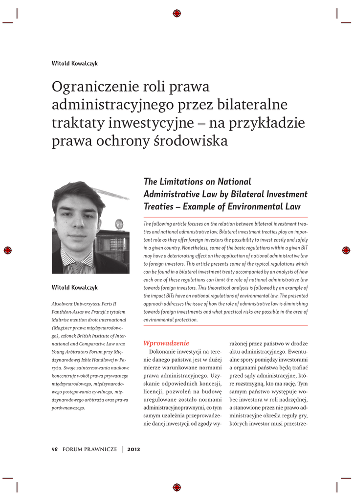 Witold Kowalczyk Ograniczenie roli prawa administracyjnego przez bilateralne traktaty inwestycyjne – na przykładzie prawa ochrony środowiska The Limitations on National Administrative Law by Bilateral Investment Treaties – Example of Environmental Law Witold Kowalczyk Absolwent Uniwersytetu Paris II Panthéon-Assas we Francji z tytułem Maîtrise mention droit international The following article focuses on the relation between bilateral investment treaties and national administrative law. Bilateral investment treaties play an important role as they offer foreign investors the possibility to invest easily and safely in a given country. Nonetheless, some of the basic regulations within a given BIT may have a deteriorating effect on the application of national administrative law to foreign investors. This article presents some of the typical regulations which can be found in a bilateral investment treaty accompanied by an analysis of how each one of these regulations can limit the role of national administrative law towards foreign investors. This theoretical analysis is followed by an example of the impact BITs have on national regulations of environmental law. The presented approach addresses the issue of how the role of administrative law is diminishing towards foreign investments and what practical risks are possible in the area of environmental protection. (Magister prawa międzynarodowego), członek British Institute of International and Comparative Law oraz Wprowadzenie Young Arbitrators Forum przy Mię- Dokonanie inwestycji na terenie danego państwa jest w dużej mierze warunkowane normami prawa administracyjnego. Uzyskanie odpowiednich koncesji, licencji, pozwoleń na budowę uregulowane zostało normami administracyjnoprawnymi, co tym samym uzależnia przeprowadzenie danej inwestycji od zgody wy- dzynarodowej Izbie Handlowej w Paryżu. Swoje zainteresowania naukowe koncentruje wokół prawa prywatnego międzynarodowego, międzynarodowego postępowania cywilnego, międzynarodowego arbitrażu oraz prawa porównawczego. 48 FORUM PR AWNICZE | 2013 rażonej przez państwo w drodze aktu administracyjnego. Ewentualne spory pomiędzy inwestorami a organami państwa będą trafiać przed sądy administracyjne, które rozstrzygną, kto ma rację. Tym samym państwo występuje wobec inwestora w roli nadrzędnej, a stanowione przez nie prawo administracyjne określa reguły gry, których inwestor musi przestrze- artykuły gać. Dalsza analiza tego, jak prawo administracyjne oddziałuje na proces inwestycyjny, wydaje się tutaj zbędna, wystarczy jedynie przypomnienie, że ma ono istotny wpływ na proces inwestycyjny, co zresztą można zaobserwować w wielu dziedzinach gospodarki. Podstawowym celem tego artykułu jest pokazanie, jak ta klasyczna rola prawa administracyjnego – a co za tym idzie przewaga państwa nad inwestorem – jest ograniczona w stosunku do inwestycji zagranicznych dokonywanych na podstawie bilateralnych traktatów inwestycyjnych (dalej: BTI)1. Polskę4. Głównym celem bilateralnych traktatów inwestycyjnych jest faworyzowanie inwestora zagranicznego i zachęcenie go do inwestowania na terenie danego państwa. Przewidują one różne gwarancje ochrony inwestycji i uproszczenia procedur wewnętrznych, z których inwestor zagraniczny może skorzystać – inwestując tym samym na warunkach bardziej przystępnych niż przewidziane przez wewnętrzne prawo administracyjne. Treść każdego BTI jest różna, gdyż zależy od woli podpisujących go państw. Większość z nich jednak zawiera pewne tradycyjnie powtarzające Głównym celem bilateralnych traktatów inwestycyjnych jest faworyzowanie inwestora zagranicznego i zachęcenie go do inwestowania na terenie danego państwa. Bilateralny traktat inwestycyjny (bilateral investment treaty) to – w najprostszym ujęciu – umowa międzynarodowa pomiędzy dwoma państwami, określająca zasady i warunki, na których osoby fizyczne i prawne z jednego państwa mogą inwestować na terenie drugiego. Bilateralne traktaty inwestycyjne są podstawowym źródłem międzynarodowego prawa inwestycyjnego, a ich interpretacja stanowi przedmiot powtarzających się sporów arbitrażowych pomiędzy państwami a międzynarodowymi inwestorami. Jednym z pierwszych traktatów tego rodzaju był podpisany w 1959 roku traktat pomiędzy Pakistanem a ówczesną Republiką Federalną Niemiec2. Dziś ich liczba sięga prawie 25003, z czego 60 zostało zawartych przez 1 W polskiej nauce używane jest także określenie „dwustronna umowa inwestycyjna”, jednak pojęcie bilateralnych trakta- się elementy, takie jak: definicja pojęcia „inwestycja”, zobowiązanie państwa do niepodejmowania działań mających na celu wywłaszczenie lub nacjonalizację, zobowiązanie do tzw. sprawiedliwego i równego traktowania, klauzula „parasolowa”, klauzula najwyższego uprzywilejowania oraz gwarancja zapewnienia inwestycjom pełnej ochrony i bezpieczeństwa. Wymienione klauzule zobowiązują tym samym państwo do traktowania inwestora zagranicznego w sposób uprzywilejowany i umożliwiają mu prowadzenie inwestycji na warunkach korzystniejszych niż te, które przysługują inwestorom lokalnym. Istota BTI opiera się zatem na „umiędzynarodowieniu” relacji inwestora zagranicznego z państwem5, co tym samym zwiększa ochronę jego inwestycji. Przykładowym elementem takiej zwiększonej ochrony, o czym będzie mowa poniżej, jest przyznanie inwestorowi możliwości rozstrzyg- tów inwestycyjnych i skrót BTI są bliższe pojęciom używanym w języku angielskim (BIT dla bilateral investment treaty) oraz francuskim (TBI dla traité bilatéral d’investissement). 2 A. Beviglia Zampetti, P. Sauvé, International Investment, „Research Handbook in International Economic Law” 2007, s. 215. 3 R. Dolzer, C. Schreuer, Principles of International Investment Law, Oxford 2008, s. 2; United Nations Conference on Trade and Development (UNCTAD), World In