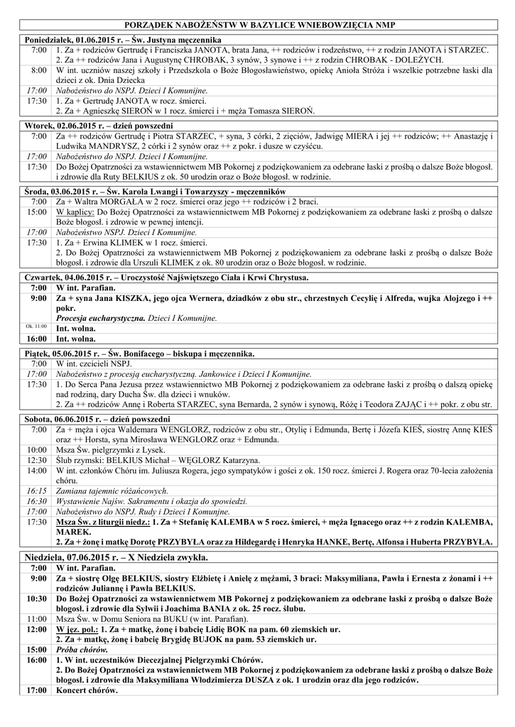 PORZĄDEK NABOŻEŃSTW W BAZYLICE WNIEBOWZIĘCIA NMP Poniedziałek, 01.06.2015 r. – Św. Justyna męczennika 7:00 1. Za + rodziców Gertrudę i Franciszka JANOTA, brata Jana, ++ rodziców i rodzeństwo, ++ z rodzin JANOTA i STARZEC. 2. Za ++ rodziców Jana i Augustynę CHROBAK, 3 synów, 3 synowe i ++ z rodzin CHROBAK - DOLEŻYCH. 8:00 W int. uczniów naszej szkoły i Przedszkola o Boże Błogosławieństwo, opiekę Anioła Stróża i wszelkie potrzebne łaski dla dzieci z ok. Dnia Dziecka 17:00 Nabożeństwo do NSPJ. Dzieci I Komunijne. 17:30 1. Za + Gertrudę JANOTA w rocz. śmierci. 2. Za + Agnieszkę SIEROŃ w 1 rocz. śmierci i + męża Tomasza SIEROŃ. Wtorek, 02.06.2015 r. – dzień powszedni 7:00 Za ++ rodziców Gertrudę i Piotra STARZEC, + syna, 3 córki, 2 zięciów, Jadwigę MIERA i jej ++ rodziców; ++ Anastazję i Ludwika MANDRYSZ, 2 córki i 2 synów oraz ++ z pokr. i dusze w czyśćcu. 17:00 Nabożeństwo do NSPJ. Dzieci I Komunijne. 17:30 Do Bożej Opatrzności za wstawiennictwem MB Pokornej z podziękowaniem za odebrane łaski z prośbą o dalsze Boże błogosł. i zdrowie dla Ruty BELKIUS z ok. 50 urodzin oraz o Boże błogosł. w rodzinie. Środa, 03.06.2015 r. – Św. Karola Lwangi i Towarzyszy - męczenników 7:00 Za + Waltra MORGAŁA w 2 rocz. śmierci oraz jego ++ rodziców i 2 braci. 15:00 W kaplicy: Do Bożej Opatrzności za wstawiennictwem MB Pokornej z podziękowaniem za odebrane łaski z prośbą o dalsze Boże błogosł. i zdrowie w pewnej intencji. 17:00 Nabożeństwo NSPJ. Dzieci I Komunijne. 17:30 1. Za + Erwina KLIMEK w 1 rocz. śmierci. 2. Do Bożej Opatrzności za wstawiennictwem MB Pokornej z podziękowaniem za odebrane łaski z prośbą o dalsze Boże błogosł. i zdrowie dla Urszuli KLIMEK z ok. 80 urodzin oraz o Boże błogosł. w rodzinie. Czwartek, 04.06.2015 r. – Uroczystość Najświętszego Ciała i Krwi Chrystusa. 7:00 W int. Parafian. 9:00 Za + syna Jana KISZKA, jego ojca Wernera, dziadków z obu str., chrzestnych Cecylię i Alfreda, wujka Alojzego i ++ pokr. Procesja eucharystyczna. Dzieci I Komunijne. Ok. 11:00 Int. wolna. 16:00 Int. wolna. Piątek, 05.06.2015 r. – Św. Bonifacego – biskupa i męczennika. 7:00 W int. czcicieli NSPJ. 17:00 Nabożeństwo z procesją eucharystyczną. Jankowice i Dzieci I Komunijne. 17:30 1. Do Serca Pana Jezusa przez wstawiennictwo MB Pokornej z podziękowaniem za odebrane łaski z prośbą o dalszą opiekę nad rodziną, dary Ducha Św. dla dzieci i wnuków. 2. Za ++ rodziców Annę i Roberta STARZEC, syna Bernarda, 2 synów i synową, Różę i Teodora ZAJĄC i ++ pokr. z obu str. Sobota, 06.06.2015 r. – dzień powszedni 7:00 Za + męża i ojca Waldemara WENGLORZ, rodziców z obu str., Otylię i Edmunda, Bertę i Józefa KIEŚ, siostrę Annę KIEŚ oraz ++ Horsta, syna Mirosława WENGLORZ oraz + Edmunda. 10:00 Msza Św. pielgrzymki z Lysek. 12:30 Ślub rzymski: BELKIUS Michał – WĘGLORZ Katarzyna. 14:00 W int. członków Chóru im. Juliusza Rogera, jego sympatyków i gości z ok. 150 rocz. śmierci J. Rogera oraz 70-lecia założenia chóru. 16:15 Zamiana tajemnic różańcowych. 16:30 Wystawienie Najśw. Sakramentu i okazja do spowiedzi. 17:00 Nabożeństwo do NSPJ. Rudy i Dzieci I Komunjne. 17:30 Msza Św. z liturgii niedz.: 1. Za + Stefanię KALEMBA w 5 rocz. śmierci, + męża Ignacego oraz ++ z rodzin KALEMBA, MAREK. 2. Za + żonę i matkę Dorotę PRZYBYŁA oraz za Hildegardę i Henryka HANKE, Bertę, Alfonsa i Huberta PRZYBYŁA. Niedziela, 07.06.2015 r. – X Niedziela zwykła. 7:00 9:00 10:30 11:00 12:00 15:00 16:00 17:00 W int. Parafian. Za + siostrę Olgę BELKIUS, siostry Elżbietę i Anielę z mężami, 3 braci: Maksymiliana, Pawła i Ernesta z żonami i ++ rodziców Juliannę i Pawła BELKIUS. Do Bożej Opatrzności za wstawiennictwem MB Pokornej z podziękowaniem za odebrane łaski z prośbą o dalsze Boże błogosł. i zdrowie dla Sylwii i Joachima BANIA z ok. 25 rocz. ślubu. Msza Św. w Domu Seniora na BUKU (w int. Parafian). W jęz. pol.: 1. Za + matkę, żonę i babcię Lidię BOK na pam. 60 ziemskich ur. 2. Za + matkę, żonę i babcię Brygidę BUJOK na pam. 53 ziemskich ur. Próba chórów. 1. W int. uczestników Diecezjalnej Pielgrzymki Chórów. 2. Do Bożej Opatrzności za wstawiennictwem MB Pokornej z podziękowaniem za odebrane łaski z prośbą o dalsze Boże błogosł. i zdrowie dla Maksymiliana Włodzimierza DUSZA z ok. 1 urodzin oraz dla jego rodziców. Koncert chórów. Ogłoszenia Duszpasterskie 1. Dziś w naszej wspólnocie Parafialnej przeżywamy Uroczystość I Komunii. Przez cały tydzień Dzieci I Komunijne uczestniczą w białych strojach w nabożeństwie g. 17:00 oraz Mszy Św. g. 17:30. 2. W poniedziałek dzieci I Komunijne przynoszą dobrowolne ofiary jako pomoc dla dzieci z Misji. 3. Dzieciom życzymy wielu łaska, dużo radości i pragnienia pójścia z Panem Jezusem przez całe życie. 4. Wybór i zamówienie zdjęć z I Komunii odbędzie się w poniedziałek 8 czerwca po Mszy Świętej w salce nad zakrystią. 5. Dzisiejsza Uroczystość Najświętszej Trójcy kończy czas przyjęcie Komunii Św. wielkanocnej. 6. W czwartek przeżywamy uroczystość Najśw. Ciała i Krwi Pańskiej. Procesja Eucharystyczna po Mszy g. 9:00. Weźmy w niej udział jak najliczniej. Bardzo proszę o przygotowania ołtarzy. 7. W tym tygodniu I czwartek, piątek i sobota m-ca. 8. Odwiedziny chorych zarówno z rejonu wikarego jak i proboszcza w piątek od 8:30. 9. Bóg Zapłać rodzicom dzieci kl. II oraz kościelnym za gruntowne mycie kościoła. 10. Za tydz. Diecezjalna Pielgrzymka Chórów do naszego Sanktuarium, nieszporów nie będzie, Msza g. 16:00., koncert o 17:00. 11. Za tydz. Pielgrzymka Mniejszości Narodowych na Górę Św. Anny. 12. Za tydz. Zbiórka do puszek na budowę Świątyni Opatrzności. 13. Parafia otrzymała pisemną zgodę na umieszczenie w kościele figur: św. Huberta – patron leśników, myśliwych i miłośników środowiska naturalnego, które