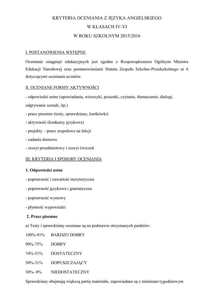KRYTERIA OCENIANIA Z JĘZYKA ANGIELSKIEGO W KLASACH IV-VI W ROKU SZKOLNYM 2015/2016 I. POSTANOWIENIA WSTĘPNE Ocenianie osiągnięć edukacyjnych jest zgodne z Rozporządzeniem Ogólnym Ministra Edukacji Narodowej oraz postanowieniami Statutu Zespołu Szkolno-Przedszkolnego nr 6 dotyczącymi oceniania uczniów. II. OCENIANE FORMY AKTYWNOŚCI - odpowiedzi ustne (opowiadania, wierszyki, piosenki, czytanie, tłumaczenie, dialogi, odgrywanie scenek, itp.) - prace pisemne (testy, sprawdziany, kartkówki) - aktywność (konkursy językowe) - projekty – prace zespołowe na lekcji - zadania domowe - zeszyt przedmiotowy i zeszyt ćwiczeń III. KRYTERIA I SPOSOBY OCENIANIA 1. Odpowiedzi ustne - poprawność i zawartość merytoryczna - poprawność językowa i gramatyczna - poprawność wymowy - płynność wypowiedzi 2. Prace pisemne a) Testy i sprawdziany oceniane są na podstawie otrzymanych punktów: 100%-91% BARDZO DOBRY 90%-75% DOBRY 74%-51% DOSTATECZNY 50%-31% DOPUSZCZAJĄCY 30%- 0% NIEDOSTATECZNY Sprawdziany obejmują większą partię materiału, zapowiadane są z minimum tygodniowym wyprzedzeniem i zawsze są poprzedzone powtórką materiału. Nieobecność ucznia na teście czy sprawdzianie zobowiązuje go do zaliczenia danej partii materiału w terminie wyznaczonym przez nauczyciela. b) Kartkówki niezapowiedziane mogą obejmować materiał z trzech ostatnich lekcji. Kartkówki zapowiedziane z lekcji na lekcję mogą obejmować szerszy zakres materiału (w zależności od potrzeb). 3. Przygotowanie do lekcji Przez przygotowanie do lekcji rozumie się odrobienie zadania domowego oraz przygotowanie do odpowiedzi ustnej z wyznaczonego zakresu materiału. Uczeń ma prawo do zgłoszenia nieprzygotowania do zajęć na początku lekcji 2 razy w danym semestrze. Niewykorzystane nieprzygotowania nie przechodzą na kolejny semestr. Każde kolejne nieprzygotowanie skutkuje otrzymaniem oceny niedostatecznej. 4. Prace domowe Minimum 3 razy w semestrze wszyscy uczniowie oceniani są za pracę domową. Brak pracy pisanej na oddzielnej kartce na zadany przez nauczyciela temat, do napisania której został wyznaczony konkretny termin, jest równoznaczny z otrzymaniem oceny niedostatecznej. Za pracę oddaną po terminie uczeń może uzyskać maksymalnie ocenę bardzo dobrą. Pozostałe prace domowe ( w zeszycie, zeszycie ćwiczeń, na kserokopiach dodatkowych materiałów) nauczyciel sprawdza u wybranych uczniów oceniając je bądź sprawdza z całą klasą. W przypadku braku tego typu zadania, uczeń może zgłosić „nieprzygotowanie” na początku lekcji (patrz: punkt 3). Brak zeszytu ćwiczeń lub zeszytu przedmiotowego, w których miało być odrobione zadanie jest równoznaczny z brakiem tego zadania. Zadania domowe oceniane są pod kątem: - poprawności i zawartości merytorycznej, - poprawności językowej i gramatycznej, - sposobu prezentacji i estetyki. 5. Aktywność Uczeń w trakcie całego roku oceniany jest za aktywność na lekcji. Czynny udział w wykonywaniu zadań podanych przez nauczyciela wyraża się otrzymaniem „+”. W wypadku gdy uczeń nie bierze udziału w lekcji (nie uważa, nie wykonuje zadanych ćwiczeń, nie robi notatek podawanych przez nauczyciela, nie posiada zeszytu, ćwiczeń lub podręcznika) otrzymuje „-”. Za pięć „plusów” uczeń otrzymuje ocenę bardzo dobrą, za pięć „minusów” ocenę niedostateczną. Udział w konkursach języka angielskiego organizowanych w szkole i poza szkołą nagradzany jest osobną oceną z aktywności. W zależności od rangi konkursu i odniesionych sukcesów może to być ocena: celująca, bardzo dobra lub dobra. 6. Zeszyt przedmiotowy, zeszyt ćwiczeń Uczeń zobowiązany jest do starannego prowadzenia zeszytu przedmiotowego oraz zeszytu ćwiczeń i wykonywania w nich zadań i ćwiczeń zadanych przez nauczyciela. Ćwiczenia zadane w ramach zadania domowego mogą być oceniane (patrz punkt: prace domowe). IV. POPRAWA OSIĄGNIĘĆ EDUKACYJNYCH Uczeń ma prawo do poprawy oceny w terminie 2-ch tygodni od daty jej otrzymania. 1. Odpowiedzi ustne i kartkówki Formą poprawy kartkówki jest odpowiedź ustna z tego samego zakresu materiału. 2. Testy i sprawdziany W przypadku testów i sprawdzianów uczeń zobowiązany jest do poprawy tylko w przypadku otrzymania oceny niedostatecznej. Ocenę taką należy poprawiać w terminie podanym przez nauczyciela. Formą poprawy jest napisanie testu pisemnego z tego samego zakresu materiału. W wyjątkowych przypadkach nauczyciel może wyrazić zgodę na poprawę w formie ustnej odpowiedzi. Zarówno ocena niedostateczna, którą uczeń otrzymał za pierwszym razem, jak i ewentualna wyższa ocena uzyskana za „poprawę” brane są pod uwagę do tzw. „średniej ważonej”. 3. Prace domowe Jeżeli uczeń otrzymał za zadanie lub jego brak ocenę niedostateczną (dotyczy prac pisemnych oddawanych przez uczniów na kartkach) może poprawić tę ocenę w terminie wyznaczonym przez nauczyciela. W przypadku oceny niedostatecznej otrzymanej za brak zadań domowych w zeszycie, czy zeszycie ćwiczeń, po wykorzystaniu dopuszczalnych braków zadania – nie ma możliwości poprawy tej oceny ze względu na charakter owych zadań, jakim jest sprawdzenie stopnia bieżącego przygotowania się ucznia do zajęć. W sytuacjach losowych, dodatkowo, nieprzygotowanie ucznia do lekcji może zostać usprawiedliwione przez rodziców – pisemna informacja od rodziców w zeszycie ucznia w danym dniu. 4. Aktywność Oceny z aktywności nie podlegają poprawie. 5. Nieobecność ucznia W przypadku nieobecności uczeń ma obowiązek uzupełnić wiadomości w określonym przez nauczyciela terminie. Sposób sprawdzenia tego materiału określa nauczyciel. V. KRYTERIA OCENY SEMESTRALNEJ I KOŃCOWOROCZNEJ 1. Ocena semestralna / końcoworoczna wystawiana jest na podstawie wszystkich ocen uzyskanych w semestrze/roku szkolnym. Jest to tzw. „średnia ważona”. Przeliczenie ocen uzyskanych z poszczególnych o
