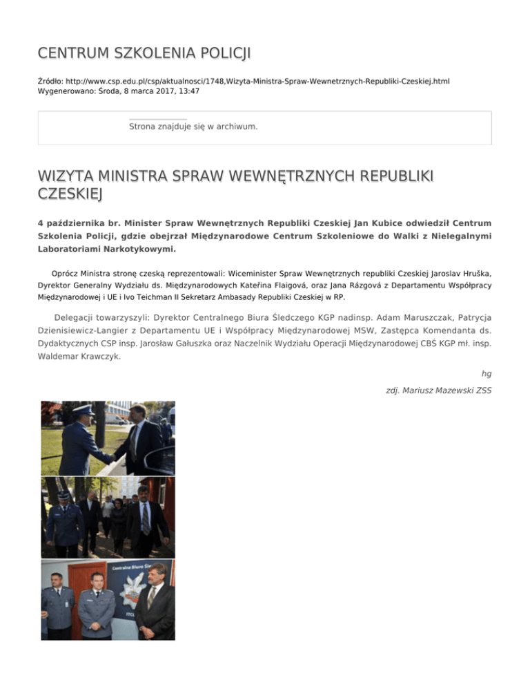 CENTRUM SZKOLENIA POLICJI Źródło: http://www.csp.edu.pl/csp/aktualnosci/1748,Wizyta-Ministra-Spraw-Wewnetrznych-Republiki-Czeskiej.html Wygenerowano: Środa, 8 marca 2017, 13:47 Strona znajduje się w archiwum. WIZYTA MINISTRA SPRAW WEWNĘTRZNYCH REPUBLIKI CZESKIEJ 4 października br. Minister Spraw Wewnętrznych Republiki Czeskiej Jan Kubice odwiedził Centrum Szkolenia Policji, gdzie obejrzał Międzynarodowe Centrum Szkoleniowe do Walki z Nielegalnymi Laboratoriami Narkotykowymi. Oprócz Ministra stronę czeską reprezentowali: Wiceminister Spraw Wewnętrznych republiki Czeskiej Jaroslav Hruška, Dyrektor Generalny Wydziału ds. Międzynarodowych Kateřina Flaigová, oraz Jana Rázgová z Departamentu Współpracy Międzynarodowej i UE i Ivo Teichman II Sekretarz Ambasady Republiki Czeskiej w RP. Delegacji towarzyszyli: Dyrektor Centralnego Biura Śledczego KGP nadinsp. Adam Maruszczak, Patrycja Dzienisiewicz-Langier z Departamentu UE i Współpracy Międzynarodowej MSW, Zastępca Komendanta ds. Dydaktycznych CSP insp. Jarosław Gałuszka oraz Naczelnik Wydziału Operacji Międzynarodowej CBŚ KGP mł. insp. Waldemar Krawczyk. hg zdj. Mariusz Mazewski ZSS Ocena: 0/5 (0) Tweetnij