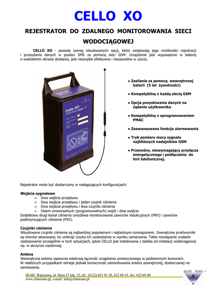 CELLO XO REJESTRATOR DO ZDALNEGO MONITOROWANIA SIECI WODOCIĄGOWEJ CELLO XO - posiada szereg wbudowanych opcji, które zwiększają jego możliwości rejestracji i przesyłania danych w postaci SMS za pomocą sieci GSM. Urządzenie jest wyposażone w baterię o wieloletnim okresie działania, jest niezwykle efektywne i niezawodne w użyciu. ● Zasilanie za pomocą wewnętrznej baterii (5 lat żywotności) ● Kompatybilny z każdą siecią GSM ● Opcja pozyskiwania danych na żądanie użytkownika ● Kompatybilny z oprogramowaniem PMAC ● Zaawansowana funkcja alarmowania ● Tryb pomiaru mocy sygnału najbliższych nadajników GSM ● Przenośny, niewymagający przyłącza energetycznego i podłączenia do linii telefonicznej. Rejestrator może być dostarczony w następujących konfiguracjach: Wejścia sygnałowe • Dwa wejścia przepływu • Dwa wejścia przepływu i jeden czujnik ciśnienia • Dwa wejścia przepływu i dwa czujniki ciśnienia • Osiem uniwersalnych (programowalnych) wejść i dwa wyjścia Dodatkowy drugi kanał ciśnienia umożliwia monitorowanie zaworów redukcyjnych (PRV) i zaworów podtrzymujących ciśnienie (PSV). Czujniki ciśnienia Wbudowane czujniki ciśnienia są najbardziej popularnym i najtańszym rozwiązaniem. Zewnętrzne przetworniki są również stosowane, by uniknąć ryzyka ich uszkodzenia w wyniku zamarzania. Takie rozwiązanie znalazło zastosowanie szczególnie w tych sytuacjach, gdzie CELLO jest instalowane z daleka od instalacji wodociągowej np. w skrzynce naziemnej. Antena Wewnętrzna antena zapewnia właściwą łączność urządzenia umieszczonego w podziemnych komorach. W niektórych przypadkach istnieje jednak konieczność zamontowania anteny zewnętrznej, dostarczanej na zamówienie. DANE TECHNICZNE: Wejścia: Kanał Kanał Kanał Kanał 1 2 3 4 – – – – tylko ciśnienie (opcja) przepływ przepływ tylko ciśnienie (opcja) Przetwornik ciśnienia: Zakres wejściowy: 0-100 m lub 0-200 m Temperatury pracy: +1oC do + 20oC (woda) Dokładność/rozdzielczość: ± 0,5% zakresu Port ciśnieniowy: standardowa „męska” szybkozłączka Wejścia przepływu: Zliczanie impulsów i rejestracja w zaprogramowanych przedziałach czasowych Modem GSM: Częstotliwość: 900 MHz, 1800 MHz, 1900 MHz Antena: Wbudowana lub zewnętrzna Port szeregowy: Typ: pełny duplex, asynchroniczny Przesyłanie danych: 1200, 2400, 4800, 9600 bps Pamięć: Typ: stała, nie ulotna Rozmiar: 128Kb, przydzielana dla poszczególnych kanałów odpowiednio do wymagań (max 64Kb/kanał) Zegar: Typ: kwarcowy, z kalendarzem uwzględniającym lata przestępne Dokładność: 100 sekund na miesiąc, maksymalny błąd przy przekroczeniu zakresu temperatur pracy. Synchronizacja: Opcja umożliwiająca synchronizację zegara z sieci GSM Zasilanie: Typ: zasilany z wewnętrznej, pojedynczej baterii litowej wymienianej przez użytkownika Żywotność baterii: typowo do 5 lat w zależności od ustawień Dodatkowo wbudowana bateria podtrzymująca rejestrację i lokalną komunikację w czasie gdy główna bateria ulegnie rozładowaniu. Rejestracja: Przedziały rejestracji: programowane w przedziałach od 1 sekundy do 1 godziny Przechowywanie danych: rotacyjne lub do zapełnienia pamięci. Alarmy: Programowane niezależnie dla każdego kanału alarmy przekroczenia niskiego/wysokiego stanu. Ciągłe, okno czasowe i zmienne tryby pracy . Możliwość częstszego pozyskiwania danych po wystąpieniu alarmu Obudowa: IP 68, możliwość zanurzenia do głębokości 1 m Temperatura pracy: -20oC do + 50oC Złącza: Typu wojskowego, zgodne z MIL-C-26482