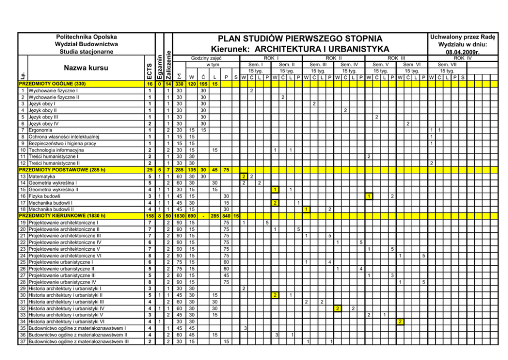 PRZEDMIOTY OGÓLNE (330) 1 Wychowanie fizyczne I 2 Wychowanie fizyczne II 3 Język obcy I 4 Język obcy II 5 Język obcy III 6 Język obcy IV 7 Ergonomia 8 Ochrona własności intelektualnej 9 Bezpieczeństwo i higiena pracy 10 Technologia informacyjna 11 Treści humanistyczne I 12 Treści humanistyczne II PRZEDMIOTY PODSTAWOWE (285 h) 13 Matematyka 14 Geometria wykreślna I 15 Geometria wykreślna II 16 Fizyka budowli 17 Mechanika budowli I 18 Mechanika budowli II PRZEDMIOTY KIERUNKOWE (1830 h) 19 Projektowanie architektoniczne I 20 Projektowanie architektoniczne II 21 Projektowanie architektoniczne III 22 Projektowanie architektoniczne IV 23 Projektowanie architektoniczne V 24 Projektowanie architektoniczne VI 25 Projektowanie urbanistyczne I 26 Projektowanie urbanistyczne II 27 Projektowanie urbanistyczne III 28 Projektowanie urbanistyczne IV 29 Historia architektury i urbanistyki I 30 Historia architektury i urbanistyki II 31 Historia architektury i urbanistyki III 32 Historia architektury i urbanistyki IV 33 Historia architektury i urbanistyki V 34 Historia architektury i urbanistyki VI 35 Budownictwo ogólne z materiałoznawstwem I 36 Budownictwo ogólne z materiałoznawstwem II 37 Budownictwo ogólne z materiałoznawstwem III 16 1 1 1 1 1 2 1 1 1 2 2 2 25 5 5 4 3 4 4 158 7 7 7 6 7 8 6 5 5 8 3 5 4 4 3 4 4 4 2 Egzamin Zaliczenie Lp. Nazwa kursu ECTS Politechnika Opolska Wydział Budownictwa Studia stacjonarne Uchwalony przez Radę Wydziału w dniu: 08.04.2009r. PLAN STUDIÓW PIERWSZEGO STOPNIA Kierunek: ARCHITEKTURA I URBANISTYKA Godziny zajęć w tym ROK I ROK II ROK III ROK IV Sem. I Sem. II Sem. III Sem. IV Sem. V Sem. VI Sem. VII 15 tyg. 15 tyg. 15 tyg. 15 tyg. 15 tyg. 15 tyg. 15 tyg. S W Ć L P W Ć L P W Ć L P W Ć L P W Ć L P W Ć L P W Ć L P S S W Ć L P 0 14 330 120 195 15 1 30 30 2 1 30 30 1 30 30 1 30 30 1 30 30 1 30 30 2 30 15 15 1 15 15 1 15 15 2 30 15 15 1 30 30 1 30 30 5 7 285 135 30 45 75 1 1 60 30 30 2 2 2 60 30 30 2 1 1 30 15 15 1 1 45 15 30 1 1 45 30 15 1 1 45 15 30 8 50 1830 690 - 285 840 15 2 90 15 75 1 2 90 15 75 2 90 15 75 2 90 15 75 2 90 15 75 2 90 15 75 2 75 15 60 2 75 15 60 2 60 15 45 2 90 15 75 1 30 30 2 1 1 45 30 15 2 60 30 30 1 1 60 30 30 2 45 30 15 1 30 30 1 45 45 3 2 60 45 15 2 30 15 15 2 2 2 2 2 1 1 1 1 1 2 2 2 1 1 2 1 2 1 5 1 1 2 1 5 5 1 5 1 1 5 1 5 1 5 4 1 2 1 4 3 1 2 2 2 2 2 1 2 3 1 1 1 1 38 Budownictwo ogólne z materiałoznawstwem IV 39 Instalacje budowlane 40 Konstrukcje budowlane I 41 Konstrukcje budowlane II 42 Konstrukcje budowlane III 43 Techniki plastyczne (rys. odręczny, model. arch.) I 44 Techniki plastyczne (rys. odręczny, model. arch.) II 45 Techniki plastyczne (rys. odręczny, model. arch.) III 46 Techniki plastyczne (rys. odręczny, model.arch.) IV 47 Organizacja i ekonomika procesu inwestycyjnego 48 Prawo budowlane 49 Projektowanie architektoniczne wsp. komputerem 50 Rewitalizacja osiedli mieszkaniowych. 51 Rewitalizacja terenów poprzemysłowych 52 Etyka i specyfika zawodu architekta 53 Seminarium dyplomowe 54 Praca dyplomowa 55 Praktyka dyplomowa PRZEDMIOTY FAKULTATYWNE (120 h) 56 Przedmiot fakultatywny I 57 Przedmiot fakultatywny II 58 Przedmiot fakultatywny III 59 Projekt specjalistyczny I 60 Projekt specjalistyczny II Razem Liczba egzaminów Liczba zaliczeń Liczba punktów ECTS 4 3 3 3 3 4 4 3 2 2 1 3 2 2 2 3 15 0 11 2 2 2 2 3 1 1 1 1 1 1 1 1 1 1 1 1 1 1 1 2 2 2 1 1 60 30 45 45 45 45 45 45 30 30 15 45 45 30 15 15 30 30 30 30 30 120 30 30 30 15 15 2565 30 15 15 30 2 2 2 15 15 15 2 2 1 2 45 45 45 30 30 15 15 15 15 15 1 1 3 3 3 2 2 1 30 30 1 2 1 2 15 1 1 1 15 1 4 tygodnie 0 7 2 2 1 1 1 210 13 78 0 15 15 75 15 30 15 15 975 225 360 990 15 10 4 5 2565 24 13 1 78 9 210 29 1 1 1 1 2 1 5 10 2 7 25 3 11 31 6 8 2 5 13 10 2 5 14 10 2 1 16 7 28 31 29 2 3 2 12 13 14 30 30 30 1 2 0 12 10 1 1 0 21 13 2 0 8 11 30 30 1 PRZEDMIOTY OBIERALNE Grupa I: Przedmioty fakultatywne: Przedmiot fakultatywny I a) Teoria projektowania b) Teoria architektury i urbanistyki c) Socjologia miasta Przedmiot fakultatywny II a) Komunikacja b) Strategie projektowania c) Projektowanie elewacji a rozwiązania przestrzenne Przedmiot fakultatywny III a) Obiekty wielkoskalowe – estetyka a konstrukcja b) Architektura krajobrazu c) Architektura wnętrz Grupa II: Projekty specjalistyczne Projekt specjalistyczny I a) Konstrukcje drewniane b) Konstrukcje metalowe c) Konstrukcje żelbetowe d) Technologia budownictwa ogólnego Projekt specjalistyczny II a) Instalacje budowlane b) Wyposażenie techniczne budynków c) Zagadnienia komunikacyjne d) Ochrona środowiska Grupa III: Treści humanistyczne Treści humanistyczne I a) Podstawy filozofii b) Historia Sztuki Treści humanistyczne II a) Psychologia b) Socjologia 0 0 0 0