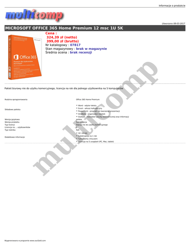 Informacje o produkcie Utworzono 08-03-2017 MICROSOFT OFFICE 365 Home Premium 12 msc 1U 5K Cena : 324,39 zł (netto) 399,00 zł (brutto) m p Nr katalogowy : 07817 Stan magazynowy : brak w magazynie Średnia ocena : brak recenzji Pakiet biurowy nie do użytku komercyjnego, licencja na rok dla jednego użytkownika na 5 komputerów Office 365 Home Premium ti co Rodzina oprogramowania • Word - edytor tekstu • Excel - arkusz kalkulacyjny • PowerPoint - program do tworzenia prezentacji • OneNote - organizator notatek • Outlook - menedżer poczty elektronicznej oraz informacji Składowe pakietu Wersja językowa Wersja produktu Typ licencji Licencja na … użytkowników Typ nośnika polska Subskrypcja Edycja nie do użytku komercyjnego 1 N/A • 32 i 64-bit • Subskrypcja na 1 rok • Tylko karta z kluczem • Licencja na 5 urządzeń (PC, Mac, tablet) m ul Dodatkowe informacje Wygenerowano w programie www.oscGold.com