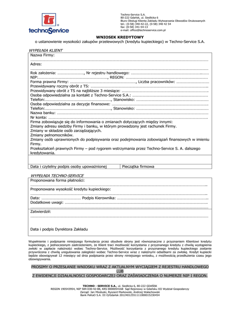 Techno-Service S.A. 80-222 Gdańsk, ul. Siedlicka 6 Biuro Obsługi Klienta Zakładu Wytwarzania Obwodów Drukowanych tel.: (0-58) 340-42-22, (0-58) 340 42 54 fax: (0-58) 341-54-13 e-mail: [email protected] WNIOSEK KREDYTOWY o ustanowienie wysokości zakupów przelewowych (kredytu kupieckiego) w Techno-Service S.A. WYPEŁNIA KLIENT Nazwa Firmy: ……………………………………………………………………………………………………………………………………………… Adres: ……………………………………………………………………………………………………………………………………………… Rok załoŜenia: ……………………, Nr rejestru handlowego: ………………………………………………………..…… NIP:………………………………………………………, REGON: ………………………………………………………………… Forma prawna Firmy: ……………………………………………………, Liczba pracowników: ………………………… Przewidywany roczny obrót z TS: …………………………………………………………………………………………….. Przewidywany obrót z TS na najbliŜsze 3 miesiące: ……………………………………………………………………. Osoba odpowiedzialna za kontakt z Techno-Service S.A.: …………………………………………………………… Telefon:……………………………………………………, Stanowisko: ………………………………………………………… Osoba odpowiedzialna za decyzje finansowe: ……………………………………………………………………………. Telefon:……………………………………………………, Stanowisko: ………………………………………………………… Nazwa banku: ………………………………………………………………………………………………………………………… Nr konta: ………………………………………………………………………………………………………………………………. Firma zobowiązuje się do informowania o zmianach dotyczących między innymi: Zmiany adresu siedziby Firmy i banku, w którym prowadzony jest rachunek Firmy. Zmiany w składzie osób zarządzających. Zmiany pełnomocników. Zmiany osób uprawnionych do podpisywania oraz podejmowania zobowiązań finansowych w imieniu Firmy. Przekształceń prawnych Firmy – pod rygorem wstrzymania przez Techno-Service S. A. dalszego kredytowania. Data i czytelny podpis osoby upowaŜnionej Pieczątka firmowa WYPEŁNIA TECHNO-SERVICE Proponowana forma płatności: …………………………………………………………………………………………………………………………………………….. Proponowana wysokość kredytu kupieckiego: …………………………………………………………………………………………………………………………………………….. Data: ……………………………… Podpis Kierownika: ……………………………………………………………………….. Dodatkowe uwagi: …………………………………………………………………………………………………………………. ……………………………………………………………………………………………………………………………………………… Zatwierdził: ……………………………………………………………………………………………………………………………………………… Data i podpis Dyrektora Zakładu Wypełnienie i podpisanie niniejszego formularza przez obydwie strony jest równoznaczne z przyznaniem Klientowi kredytu kupieckiego, z jednoczesnym zastrzeŜeniem, Ŝe Klient traci moŜliwość korzystania z przyznanego kredytu z chwilą wystąpienia zwłoki w zapłacie naleŜności wobec Techno-Service. MoŜliwość korzystania z przyznanego kredytu kupieckiego zostanie przywrócona z chwilą uregulowania zaległości wobec Techno-Service wraz z naleŜnymi odsetkami za zwłokę. Kredyt kupiecki będzie obowiązywał 12 miesięcy od dnia podpisania przez strony niniejszego wniosku, z moŜliwością przedłuŜenia czasu jego obowiązywania. PROSIMY O PRZESŁANIE WNIOSKU WRAZ Z AKTUALNYM WYCIĄGIEM Z REJESTRU HANDLOWEGO LUB Z EWIDENCJI DZIAŁALNOSCI GOSPODARCZEJ ORAZ ZAŚWIADCZENIA O NUMERZE NIP I REGON. TECHNO - SERVICE S.A., ul. Siedlicka 6, 80-222 GDAŃSK REGON 190543954, NIP 584-030-42-88, KRS 0000054168 Sąd Rejonowy w Gdańsku XII Wydział Gospodarczy Zarząd: Jan Mioduski, Ryszard Markowski, Andrzej Wałachowski Bank PeKaO S.A. III O/Gdańsk 20124012551111000015230454
