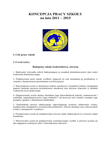 KONCEPCJA PRACY SZKOŁY na lata 2011 – 2015 I. Cele pracy szkoły Cel nadrzędny: Budujemy szkołę środowiskową -otwartą 1. Budowanie wizerunku szkoły funkcjonującej na zasadach demokratycznych, jako części środowiska demokratycznego. 2. Podejmowanie przez szkołę wysiłków mających na celu nieustanną jej przebudowę w związku z dynamicznymi przemianami cywilizacyjnymi. 3. Wprowadzenie ucznia w dziedzictwo kultury narodowej w kontekście kultury europejskiej poprzez budzenie poczucia przynależności narodowej oraz aktywne włączenie w aktualne wydarzenia życia społecznego. 4. Diagnozowanie ucznia służące określaniu jego indywidualnych potrzeb, zainteresowań i uzdolnień, napotykanych przez niego trudności i ich przyczyn oraz rzetelne ocenianie jego postępów zgodnie z określonymi standardami. 5. Doskonalenie procesu edukacyjnego zapewniającego uczniowi zdobywanie wiedzy, kształtowanie umiejętności rozwiązywania problemów, twórcze działanie oraz wykorzystanie wiedzy i umiejętności w praktyce. 6. Przygotowanie ucznia do podejmowania nowych zadań edukacyjnych na wyższym etapie kształcenia. 7. Motywowanie ucznia do podejmowania systematycznego wysiłku w procesie uczenia się dla osiągnięcia osobistych celów i doświadczenia sukcesów. 8. Podejmowanie działań mających na celu psychiczne wzmacnianie dziecka w sytuacji stresu oraz zapobieganie zachowaniom agresywnym. 9. Kształtowanie postawy odpowiedzialności za siebie i innych, bezinteresownego działania na rzecz innych oraz nawiązywania i utrzymywania poprawnych kontaktów z dziećmi, zwłaszcza niepełnosprawnymi. 10. Zapewnienie opieki i wspomaganie rozwoju dziecka w przyjaznym i bezpiecznym środowisku w ścisłej współpracy z rodziną. 11.Zapewnieniem uczniom poprzez uczestnictwo w zajęciach wychowania fizycznego i zawodach sportowych solidnych fundamentów zdrowia fizycznego, psychicznego i społecznego a także radość z regularnej aktywności ruchowej. II. Kierunki rozwoju szkoły 1. Dbałość o systematyczne podnoszenie poziomu uwzględnieniem nauczania języków obcych i matematyki. kształcenia, ze szczególnym 2. Stałe podnoszenie, jakości kształcenia poprzez wdrażanie programów własnych, innowacji pedagogicznych, stosowanie nowoczesnych metod pracy oraz szersze wykorzystanie nowych technologii informacyjno – komunikacyjnych w nauczaniu. 3. Dostosowywanie szkolnego zestawu programów nauczania, metod pracy i bazy szkoły do nowej podstawy programowej. 4. Tworzenie przyjaznego i bezpiecznego środowiska wychowawczego w szkole, np. poprzez bogatą ofertę zajęć pozalekcyjnych, wychowawczych i sportowych. 5. Zaspakajanie zróżnicowanych potrzeb edukacyjnych, w tym uczniów o specjalnych potrzebach edukacyjnych. 6. Wprowadzenie systemu wspomagania, motywowania ucznia do osiągania coraz lepszych wyników w nauce. 7. Rozwijanie zainteresowań i talentów dzieci poprzez szeroką ofertę zajęć pozalekcyjnych. 8. Łagodzenie progów edukacyjnych. 9. Rozwijanie aktywności fizycznej uczniów. 10. Kształtowanie postaw i zachowań prozdrowotnych. 11. Kształcenie postaw proekologicznych. 12. Kreowanie pozytywnego wizerunku ucznia w szkole i środowisku. 13. Promowanie i premiowanie innowacyjności, kreatywności i pracy zespołowej. 14. Przygotowanie uczniów do czynnego, świadomego udziału w kulturze. 15. Przeciwdziałanie wykluczeniu społecznemu, patologiom i uzależnieniom wśród dzieci. 16. Wzmacnianie więzi szkoły z jej otoczeniem, zwłaszcza poprzez współpracę z rodzicami, społecznością lokalną. 17. Współpraca z instytucjami wspierającymi szkołę we wszystkich obszarach. 18. Dostosowanie organizacji pracy, bazy szkoły do potrzeb dzieci sześcioletnich. 19. Stałe uzupełnianie i polepszanie bazy szkoły. 20.Sprawne zarządzanie szkołą. 21.Promowanie szkoły poprzez uczestnictwo w sportowej rywalizacji międzyszkolnej z udziałem drużyn z terenu powiatu, województwa, kraju i zagranicy. III. MODEL ABSOLWENTA Najwyższym dobrem dla naszej szkoły jest uczeń, który w atmosferze i przy wzajemnej akceptacji zwiększa swoje szanse na osiągnięcie sukcesów w przebiegu kariery szkolnej. Przygotowujemy do aktywnego i świadomego funkcjonowania we współczesnym świecie, kierując się uniwersalnymi wartościami takimi jak: dobro, miłość, uczciwość, odpowiedzialność. Spełniając oczekiwanie środowiska, kształcimy w duchu uniwersalnych wartości absolwenta kreatywnego i przedsiębiorczego, aby mógł aktywnie, świadomie i pięknie żyć we współczesnym świecie. Organizujemy nauczanie i wychowanie zgodnie z duchem czasu w celu dobrego przygotowania młodego człowieka do samodzielnego funkcjonowania we współczesnej rzeczywistości. Naszym przesłaniem jest wykreowanie absolwenta o wszechstronnie wykształconej osobowości i umiejętnościach takich, które zapewniają mu odpowiednie miejsce w otaczającej rzeczywistości. Jesteśmy po to, aby wychowywać, uczyć i przygotowywać do zdobywania wiedzy i realizacji w dorosłym życiu. Kierujemy się wiedzą, doświadczeniem i intuicją w dążeniu do osiągnięcia celu, którym jest człowiek aktywny, otwarty, samodzielny, potrafiący odnaleźć się w otaczającym świecie. Absolwent naszej szkoły powinien: 1. Skutecznie porozumiewać się. 2. Poprawnie posługiwać się językiem polskim. 3. Samodzielnie się uczyć i odkrywać swoje zainteresowania. 4. Prezentować własny punkt widzenia. 5. Planować, organizować i ocenia własną pracę. 6. Wykorzystywać praktycznie zdobytą wiedzę. 7. Posiadać wiedzę i umiejętności niezbędne do dalszego kształcenia 8. Posługiwać się w zakresie podstawowym językiem obcym. 9. Korzystać z różnorodnych źródeł informacji. 10. Posługiwać się technologią komunikacyjną i informacyjną 11. Selekcjonować informacje ze środków społecznego przekazu 12. Rozumieć, kochać i dbać o środowisko. 13. Odznaczać się wrażliwością na pi