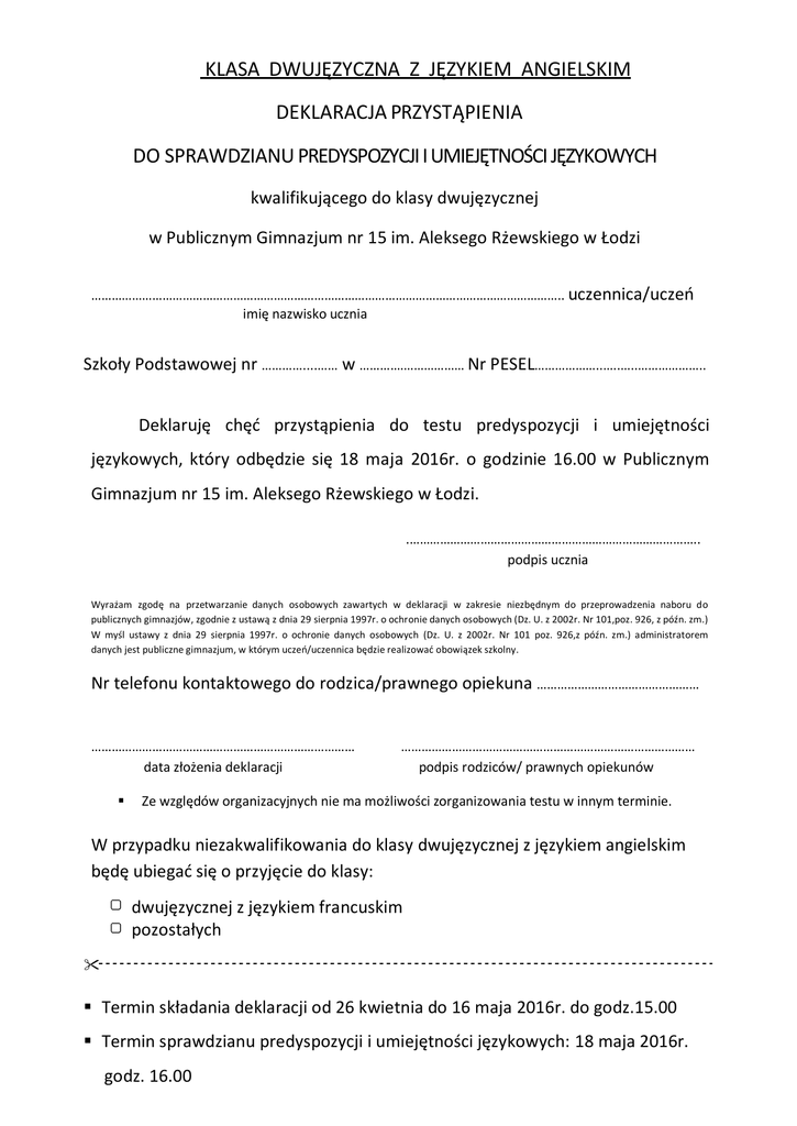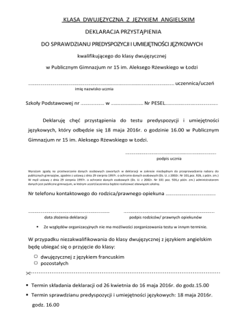 KLASA DWUJĘZYCZNA Z JĘZYKIEM ANGIELSKIM DEKLARACJA PRZYSTĄPIENIA DO SPRAWDZIANU PREDYSPOZYCJI I UMIEJĘTNOŚCI JĘZYKOWYCH kwalifikującego do klasy dwujęzycznej w Publicznym Gimnazjum nr 15 im. Aleksego Rżewskiego w Łodzi ………………………………………………………………………………………………………………………….. uczennica/uczeń imię nazwisko ucznia Szkoły Podstawowej nr …………....…… w ……….………………… Nr PESEL………………..…..…..……………….. Deklaruję chęć przystąpienia do testu predyspozycji i umiejętności językowych, który odbędzie się 18 maja 2016r. o godzinie 16.00 w Publicznym Gimnazjum nr 15 im. Aleksego Rżewskiego w Łodzi. .………………………………………………………………………….. podpis ucznia Wyrażam zgodę na przetwarzanie danych osobowych zawartych w deklaracji w zakresie niezbędnym do przeprowadzenia naboru do publicznych gimnazjów, zgodnie z ustawą z dnia 29 sierpnia 1997r. o ochronie danych osobowych (Dz. U. z 2002r. Nr 101,poz. 926, z późn. zm.) W myśl ustawy z dnia 29 sierpnia 1997r. o ochronie danych osobowych (Dz. U. z 2002r. Nr 101 poz. 926,z późn. zm.) administratorem danych jest publiczne gimnazjum, w którym uczeń/uczennica będzie realizować obowiązek szkolny. Nr telefonu kontaktowego do rodzica/prawnego opiekuna ………………………………………… …………………………………………………………………… data złożenia deklaracji …………………………………………………………………………… podpis rodziców/ prawnych opiekunów Ze względów organizacyjnych nie ma możliwości zorganizowania testu w innym terminie. W przypadku niezakwalifikowania do klasy dwujęzycznej z językiem angielskim będę ubiegać się o przyjęcie do klasy: dwujęzycznej z językiem francuskim pozostałych Termin składania deklaracji od 26 kwietnia do 16 maja 2016r. do godz.15.00 Termin sprawdzianu predyspozycji i umiejętności językowych: 18 maja 2016r. godz. 16.00