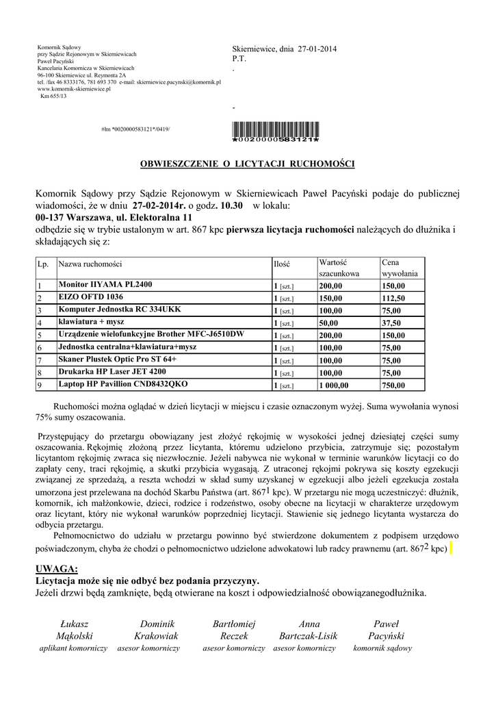 Komornik Sądowy przy Sądzie Rejonowym w Skierniewicach Paweł Pacyński Kancelaria Komornicza w Skierniewicach 96-100 Skierniewice ul. Reymonta 2A tel. /fax 46 8333176, 781 693 370 e-mail: [email protected] www.komornik-skierniewice.pl Km 655/13 Skierniewice, dnia 27-01-2014 P.T. . #łm *0020000583121*/0419/ *0020000583121* OBWIESZCZENIE O LICYTACJI RUCHOMOŚCI Komornik Sądowy przy Sądzie Rejonowym w Skierniewicach Paweł Pacyński podaje do publicznej wiadomości, że w dniu 27-02-2014r. o godz. 10.30 w lokalu: 00-137 Warszawa, ul. Elektoralna 11 odbędzie się w trybie ustalonym w art. 867 kpc pierwsza licytacja ruchomości należących do dłużnika i składających się z: Lp. Nazwa ruchomości Ilość 1 2 3 4 5 6 7 8 9 Monitor IIYAMA PL2400 EIZO OFTD 1036 Komputer Jednostka RC 334UKK klawiatura + mysz Urządzenie wielofunkcyjne Brother MFC-J6510DW Jednostka centralna+klawiatura+mysz Skaner Plustek Optic Pro ST 64+ Drukarka HP Laser JET 4200 Laptop HP Pavillion CND8432QKO 1 [szt.] 1 [szt.] 1 [szt.] 1 [szt.] 1 [szt.] 1 [szt.] 1 [szt.] 1 [szt.] 1 [szt.] Wartość szacunkowa 200,00 150,00 100,00 50,00 200,00 100,00 100,00 100,00 1 000,00 Cena wywołania 150,00 112,50 75,00 37,50 150,00 75,00 75,00 75,00 750,00 Ruchomości można oglądać w dzień licytacji w miejscu i czasie oznaczonym wyżej. Suma wywołania wynosi 75% sumy oszacowania. Przystępujący do przetargu obowiązany jest złożyć rękojmię w wysokości jednej dziesiątej części sumy oszacowania. Rękojmię złożoną przez licytanta, któremu udzielono przybicia, zatrzymuje się; pozostałym licytantom rękojmię zwraca się niezwłocznie. Jeżeli nabywca nie wykonał w terminie warunków licytacji co do zapłaty ceny, traci rękojmię, a skutki przybicia wygasają. Z utraconej rękojmi pokrywa się koszty egzekucji związanej ze sprzedażą, a reszta wchodzi w skład sumy uzyskanej w egzekucji albo jeżeli egzekucja została umorzona jest przelewana na dochód Skarbu Państwa (art. 8671 kpc). W przetargu nie mogą uczestniczyć: dłużnik, komornik, ich małżonkowie, dzieci, rodzice i rodzeństwo, osoby obecne na licytacji w charakterze urzędowym oraz licytant, który nie wykonał warunków poprzedniej licytacji. Stawienie się jednego licytanta wystarcza do odbycia przetargu. Pełnomocnictwo do udziału w przetargu powinno być stwierdzone dokumentem z podpisem urzędowo poświadczonym, chyba że chodzi o pełnomocnictwo udzielone adwokatowi lub radcy prawnemu (art. 8672 kpc) UWAGA: Licytacja może się nie odbyć bez podania przyczyny. Jeżeli drzwi będą zamknięte, będą otwierane na koszt i odpowiedzialność obowiązanegodłużnika. Łukasz Mąkolski aplikant komorniczy Dominik Krakowiak asesor komorniczy Bartłomiej Reczek Anna Bartczak-Lisik asesor komorniczy asesor komorniczy Paweł Pacyński komornik sądowy Do wiadomości: 1. a/a