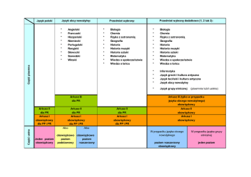Język polski Język obcy nowożytny: Angielski Francuski Hiszpański Niemiecki Portugalski Rosyjski Słowacki Szwedzki Włoski * * * * * * * * * * Część pisemna * * * * * * * * * Biologia Chemia Fizyka z astronomią Geografia Historia Historia muzyki Historia sztuki Matematyka Wiedza o społeczeństwie Wiedza o tańcu Arkusz III dla PR Część ustna Arkusz II dla PR Arkusz I obowiązkowy dla PP i PR Jeden poziom obowiązkowy * * * * * * * * * * Biologia Chemia Fizyka z astronomią Geografia Historia Historia muzyki Historia sztuki Matematyka Wiedza o społeczeństwie Wiedza o tańcu * * * * Informatyka Język grecki i kultura antyczna Język łaciński i kultura antyczna Język obcy nowożytny * Język grupy etnicznej (pisemnie lub/i ustnie) Arkusz III (tylko w przypadku języka obcego nowożytnego) obowiązkowy Arkusz II dla PR Arkusz I obowiązkowy dla PP i PR Albo Przedmiot wybrany dodatkowo (1, 2 lub 3): Przedmiot wybrany: Arkusz II dla PR Arkusz I obowiązkowy dla PP i PR Arkusz II obowiązkowy Arkusz I obowiązkowy Albo obowiązkowo obowiązkowo poziom poziom podstawowy rozszerzony W przypadku języka obcego nowożytnego W przypadku języka grupy etnicznej poziom rozszerzony obowiązkowy jeden poziom Język mniejszości narodowej Język obcy nowożytny będący drugim językiem nauczania dla absolwen-tów szkół lub oddziałów dwujęzycznych oraz dla absolwentów klas niedwujęzycznych: Część ustna Część pisemna ∗ ∗ ∗ ∗ Przedmiot wybrany dla absolwentów szkół lub oddziałów dwujęzycznych (I) oraz dla absolwentów szkół lub oddziałów z językiem nauczania danej mniejszości lub grupy etnicznej (II): ∗ ∗ ∗ ∗ ∗ ∗ ∗ ∗ ∗ ∗ Angielski Francuski Hiszpański Niemiecki dla absolwentów szkół lub oddziałów z nauczaniem języka danej mniejszości Biologia Chemia Fizyka z astronomią Geografia (z wyjątkiem treści dotyczących geografii Polski) Historia (z wyjątkiem treści dotyczących historii Polski) Historia muzyki Historia sztuki Matematyka Wiedza o społeczeństwie Wiedza o tańcu I. Arkusz III obowiązkowy dla PP i PR w języku ob cym Arkusz II dla PR Arkusz II obowiązkowy Arkusz I obowiązkowy dla PP i PR Arkusz I obowiązkowy dla PP i PR Jeden Jeden poziom obowiązkowy poziom obowiązkowy Arkusz II dla PR po polsku Arkusz I obowiązkowy dla PP i PR po polsku II. Arkusz II dla PR w języku mniejszości/grupy Arkusz I obowiązkowy dla PP i PR w języku mniejszości/grupy