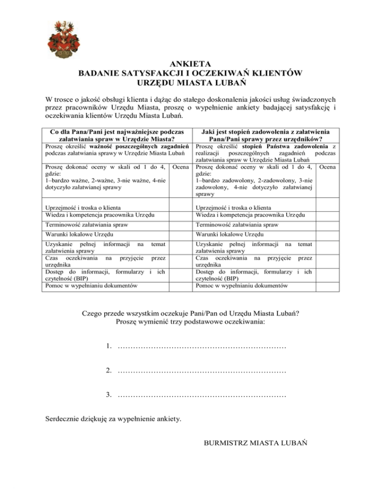 ANKIETA BADANIE SATYSFAKCJI I OCZEKIWAŃ KLIENTÓW URZĘDU MIASTA LUBAŃ W trosce o jakość obsługi klienta i dążąc do stałego doskonalenia jakości usług świadczonych przez pracowników Urzędu Miasta, proszę o wypełnienie ankiety badającej satysfakcję i oczekiwania klientów Urzędu Miasta Lubań. Co dla Pana/Pani jest najważniejsze podczas załatwiania spraw w Urzędzie Miasta? Jaki jest stopień zadowolenia z załatwienia Pana/Pani sprawy przez urzędników? Proszę określić ważność poszczególnych zagadnień podczas załatwiania sprawy w Urzędzie Miasta Lubań Proszę określić stopień Państwa zadowolenia z realizacji poszczególnych zagadnień podczas załatwiania spraw w Urzędzie Miasta Lubań Proszę dokonać oceny w skali od 1 do 4, Ocena gdzie: 1–bardzo zadowolony, 2-zadowolony, 3-nie zadowolony, 4-nie dotyczyło załatwianej sprawy Proszę dokonać oceny w skali od 1 do 4, gdzie: 1–bardzo ważne, 2-ważne, 3-nie ważne, 4-nie dotyczyło załatwianej sprawy Ocena Uprzejmość i troska o klienta Wiedza i kompetencja pracownika Urzędu Uprzejmość i troska o klienta Wiedza i kompetencja pracownika Urzędu Terminowość załatwiania spraw Terminowość załatwiania spraw Warunki lokalowe Urzędu Warunki lokalowe Urzędu Uzyskanie pełnej informacji na temat załatwienia sprawy Czas oczekiwania na przyjęcie przez urzędnika Dostęp do informacji, formularzy i ich czytelność (BIP) Pomoc w wypełnianiu dokumentów Uzyskanie pełnej informacji na temat załatwienia sprawy Czas oczekiwania na przyjęcie przez urzędnika Dostęp do informacji, formularzy i ich czytelność (BIP) Pomoc w wypełnianiu dokumentów Czego przede wszystkim oczekuje Pani/Pan od Urzędu Miasta Lubań? Proszę wymienić trzy podstawowe oczekiwania: 1. ………………………………………………………… 2. ………………………………………………………… 3. ………………………………………………………… Serdecznie dziękuję za wypełnienie ankiety. BURMISTRZ MIASTA LUBAŃ
