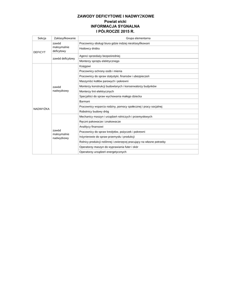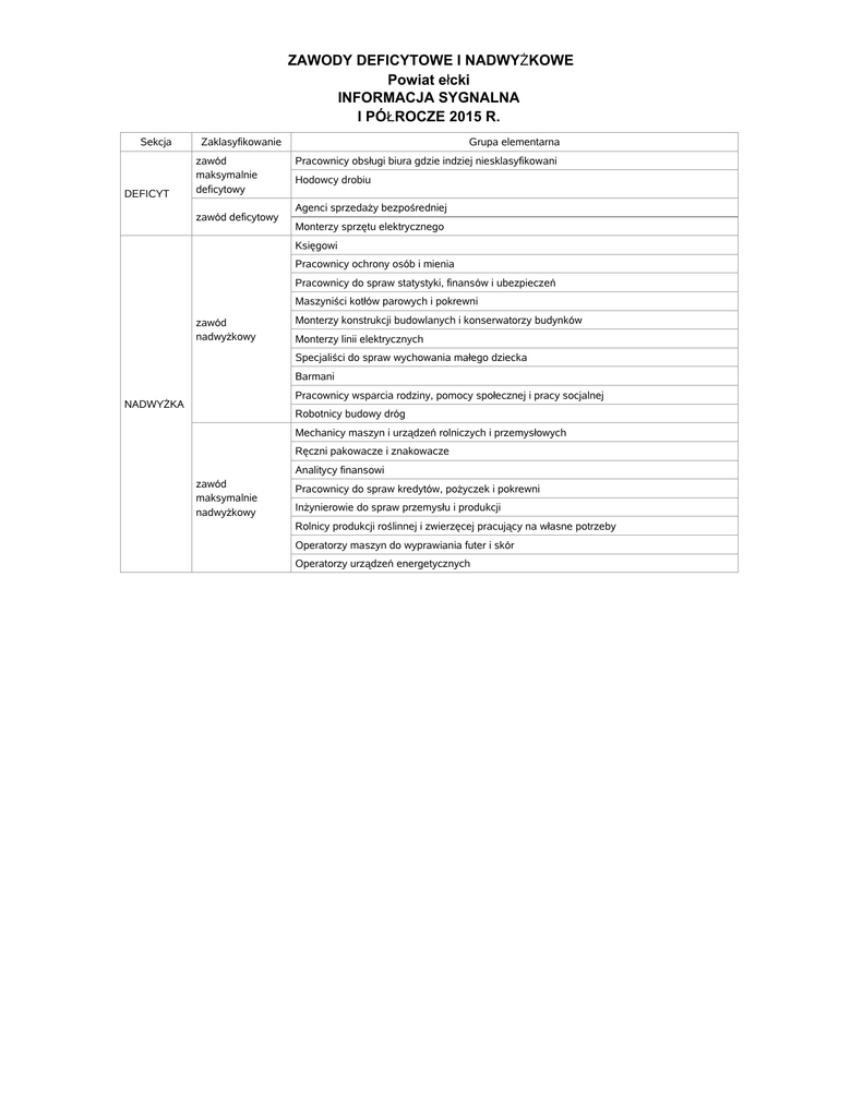 ZAWODY DEFICYTOWE I NADWYŻKOWE Powiat ełcki INFORMACJA SYGNALNA I PÓŁROCZE 2015 R. Sekcja DEFICYT Zaklasyfikowanie zawód maksymalnie deficytowy zawód deficytowy Grupa elementarna Pracownicy obsługi biura gdzie indziej niesklasyfikowani Hodowcy drobiu Agenci sprzedaży bezpośredniej Monterzy sprzętu elektrycznego Księgowi Pracownicy ochrony osób i mienia Pracownicy do spraw statystyki, finansów i ubezpieczeń Maszyniści kotłów parowych i pokrewni zawód nadwyżkowy Monterzy konstrukcji budowlanych i konserwatorzy budynków Monterzy linii elektrycznych Specjaliści do spraw wychowania małego dziecka Barmani Pracownicy wsparcia rodziny, pomocy społecznej i pracy socjalnej NADWYŻKA Robotnicy budowy dróg Mechanicy maszyn i urządzeń rolniczych i przemysłowych Ręczni pakowacze i znakowacze zawód maksymalnie nadwyżkowy Analitycy finansowi Pracownicy do spraw kredytów, pożyczek i pokrewni Inżynierowie do spraw przemysłu i produkcji Rolnicy produkcji roślinnej i zwierzęcej pracujący na własne potrzeby Operatorzy maszyn do wyprawiania futer i skór Operatorzy urządzeń energetycznych