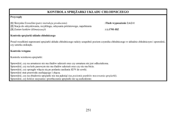 KONTROLA SPRĘśARKI UKŁADU CHŁODNICZEGO Przyrządy [1] Skrzynka Exxoclim (patrz instrukcja producenta) [2] Stacja do odzyskiwania, recyklingu, odsysania próŜniowego, napełniania [3] Zestaw korków (klimatyzacji) : Flash wyposaŜenie 2.4.2-1 : (-).1701-HZ Kontrola spręŜarki układu chłodniczego Przed wszelkimi naprawami spręŜarki układu chłodniczego naleŜy uzupełnić poziom czynnika chłodniczego w układzie chłodniczym i sprawdzić, czy usterka zniknęła. Kontrola wstępna Kontrola wzrokowa spręŜarki: Sprawdzić, czy na armaturze nie ma śladów uderzeń oraz czy armatura nie jest odkształcona. Sprawdzić, czy na kole pasowym nie ma śladów uderzeń oraz czy nie ma bicia. Sprawdzić, czy sprzęgło włącza się po podaniu zasilania 12 V do cewki. Sprawdzić stan przewodu zasilającego i złącza. Sprawdzić, czy na obudowie spręŜarki nie ma pęknięć (na poziomie punktów mocowania spręŜarki). Sprawdzić, czy króćce zasysania i przetłaczania spręŜarki nie są uszkodzone. 251 KONTROLA SPRĘśARKI UKŁADU CHŁODNICZEGO Usterka spowodowana przez wyciek MoŜliwe przyczyny Zbyt wysokie ciśnienie w spręŜarce w wyniku Wyciek pomiędzy obudową spręŜarki i głowicą napełnienia zbyt duŜej ilości czynnika chłodniczego Objawy Rozwiązania Przestrzeganie danych technicznych podczas napełniania układu chłodniczego Zanieczyszczenie obcymi ciałami Przestrzeganie czystości podczas montaŜu przewodów Nieprawidłowe dokręcenie przewodów Przestrzeganie momentów dokręcania ŁoŜysko kulkowe koła pasowego uszkodzone Wymiana koła pasowego Uderzenia na poziomie tarczy napędowej (stykanie się tarczy napędowej z kołem pasowym) Wymiana tarczy napędowej (i ewentualnie koła pasowego) Znaczny hałas podczas działania (przy włączonym sprzęgle) Zbyt duŜa ilość gazu Przestrzeganie danych technicznych podczas napełniania układu chłodniczego Hałas podczas działania i drgania we wnętrzu pojazdu Przewody obwodu chłodniczego dotykają innych elementów pojazdu Sprawdzić, czy inne elementy nie nachodzą na przewody Hałas generowany przez poślizg sprzęgła spręŜarki Obecność oleju lub smaru na poziomie sprzęgła Sprawdzić czystość tarczy napędowej i koła pasowego spręŜarki DłuŜsze kliknięcia występujące przez chwilę lub przez cały czas Obecność obcych ciał pod zaworem ssania lub zaworem odciąŜającym Sprawdzić czystość układu klimatyzacji Wyciek gazu/oleju na poziomie przewodu ssącego i odciąŜającego Hałas spręŜarki przy wyłączonym sprzęgle 252 KONTROLA SPRĘśARKI UKŁADU CHŁODNICZEGO Objawy Usterka działania MoŜliwe przyczyny Nieprawidłowy styk na poziomie złączy Sprzęgło nie włącza się po włączeniu klimatyzacji Nieprawidłowe zasilanie Sprzęgło włącza się, ale nie jest wytwarzane zimno Nieprawidłowe napełnienie układu chłodniczego 253 Rozwiązania Sprawdzić połączenia Sprawdzić, czy zasilanie po stronie wiązki przewodów silnika jest prawidłowe: 12 V, brak nadmiernego napięcia, brak nadmiernego natęŜenia Sprawdzić ilość czynnika chłodniczego KONTROLA SPRĘśARKI UKŁADU CHŁODNICZEGO Interpretacje ciśnień zmierzonych w układzie chłodniczym Wysokie ciśnienie Temperatura otoczenia = 20°C od 8 do 9 barów > 11 barów Wysokie ciśnienie Temperatura otoczenia = 25°C od 9 do 10 barów > 12 barów Niskie ciśnienie 3 bary > 4,2 bara Objawy Nie wytwarza zimna Temperatura przewodu ssącego jest niŜsza od temperatury parownika Wysokie i niskie ciśnienie wyrównują się natychmiast po zatrzymaniu spręŜarki i wartości tych ciśnień zmieniają się, gdy spręŜarka jest włączona 254 MoŜliwe przyczyny Rozwiązania Nadmiar oleju w obwodzie Zmniejszyć ilość czynnika chłodniczego. Usunąć cały olej z układu. Wytworzyć Powietrze lub wilgoć w próŜnię w układzie. obwodzie Napełnić układ czynnikiem chłodniczym. Nadmierne otwarcie reduktora Wymienić reduktor Zawór ssący lub odciąŜający zablokowany w otwartym połoŜeniu przez jakąś cząsteczkę/ zanieczyszczenie lub jest pęknięty Wymienić spręŜarkę KONTROLA SPRĘśARKI UKŁADU CHŁODNICZEGO Interpretacje ciśnień zmierzonych w układzie chłodniczym Wysokie ciśnienie Temperatura otoczenia = 20°C Wysokie ciśnienie Temperatura otoczenia = 25°C Niskie ciśnienie Objawy Nie wytwarza zimna < 6 barów > 11 barów < 7 barów > 12 barów MoŜliwe przyczyny Niewystarczająca ilość czynnika chłodniczego Zmniejszyć ilość czynnika chłodniczego. Wykonać test wykrywania wycieku. Wytworzyć próŜnię. Napełnić układ czynnikiem chłodniczym Zapchanie układu po stronie niskiego ciśnienia Wymienić przewód Zapchanie linii cieczy. Filtr osuszający zablokowany Wymienić przewód. Wymienić filtr osuszający < 2,4 bara < 2,4 bara Temperatura przewodu ssącego jest niŜsza od temperatury parownika Linia cieczy (filtr osuszający) zamarznięty 255 Rozwiązania KONTROLA SPRĘśARKI UKŁADU CHŁODNICZEGO Kontrola za pomocą exxoclim Wykonać kontrolę spręŜarki układu chłodniczego, za pomocą przyrządu [1]. UWAGA: Patrz instrukcja obsługi: przyrządy. Kontrola poziomu oleju WAśNE: Ze względu na fakt, Ŝe środek smarowy do spręŜarek jest niezwykle higroskopijny, przy kaŜdej interwencji naleŜy stosować nowe opakowania. NaleŜy rozróŜniać 3 przypadki: Naprawa obwodu (bez wycieku). Wyciek powolny. Wyciek raptowny. Naprawa obwodu (bez wycieku) UŜycie stacji [2] do napełniania i odzyskiwania bez osadnika oleju. OpróŜnić obwód niskiego ciśnienia czynnika chłodniczego moŜliwie jak najwolniej, aby olej nie został wyciągnięty z układu. Napełnianie układu czynnikiem chłodniczym odbywa się bez dodawania oleju. UŜycie stacji [2] do napełniania i odzyskiwania z osadnikiem oleju. OpróŜnić układ czynnika chłodniczego, postępując zgodnie z instrukcją obsługi stacji. Zmierzyć ilość odzyskanego oleju. Wlać taką samą ilość odzyskanego oleju. 256 KONTROLA SPRĘśARKI UKŁ