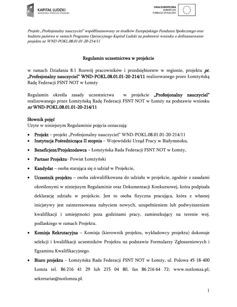 Projekt „Profesjonalny nauczyciel” współfinansowany ze środków Europejskiego Funduszu Społecznego oraz budżetu państwa w ramach Programu Operacyjnego Kapitał Ludzki na podstawie wniosku o dofinansowanie projektu nr WND-POKL.08.01.01-20-214/11 Regulamin uczestnictwa w projekcie w ramach Działania 8.1 Rozwój pracowników i przedsiębiorstw w regionie, projektu pt. „Profesjonalny nauczyciel” WND-POKL.08.01.01-20-214/11 realizowanego przez Łomżyńską Radę Federacji FSNT NOT w Łomży Regulamin określa zasady uczestnictwa w projekcie „Profesjonalny nauczyciel” realizowanego przez Łomżyńską Radę Federacji FSNT NOT w Łomży na podstawie wniosku nr WND-POKL.08.01.01-20-214/11 Słownik pojęć Użyte w niniejszym Regulaminie pojęcia oznaczają: Projekt – projekt „Profesjonalny nauczyciel” WND-POKL.08.01.01-20-214/11 Instytucja Pośrednicząca II stopnia – Wojewódzki Urząd Pracy w Białymstoku, Beneficjent/Projektodawca – Łomżyńska Rada Federacji FSNT NOT w Łomży, Partner Projektu- Powiat Łomżyński Kandydat – osoba starająca się o udział w Projekcie, Uczestnik projektu – osoba zakwalifikowana do udziału w projekcie, zgodnie z zasadami określonymi w niniejszym Regulaminie oraz Dokumentacji Konkursowej, która podpisała deklarację udziału w projekcie. Jest to osoba fizyczna pracująca, która z własnej inicjatywy jest zainteresowana nabyciem nowych, uzupełnieniem lub podwyższeniem kwalifikacji i umiejętności poza godzinami pracy, zamieszkujący na terenie woj. podlaskiego w ramach Projektu. Komisja Rekrutacyjna – Komisja (kierownik projektu, wykładowcy projektu) dokonuje selekcji i kwalifikacji uczestników Projektu na podstawie Formularzy Zgłoszeniowych i Egzaminu Kwalifikacyjnego. Biuro projektu – Łomżyńska Rada Federacji FSNT NOT w Łomży, ul. Polowa 45 18-400 Łomża tel. 86 216 41 29 lub 215 04 80, fax 86 216 64 72; www.notlomza.pl; [email protected]. 1 Projekt „Profesjonalny nauczyciel” współfinansowany ze środków Europejskiego Funduszu Społecznego oraz budżetu państwa w ramach Programu Operacyjnego Kapitał Ludzki na podstawie wniosku o dofinansowanie projektu nr WND-POKL.08.01.01-20-214/11 § 1. Miejsce i termin realizacji projektu 1. Projekt realizowany jest na terenie woj. podlaskiego w okresie od 01.03.2012 r. do 28.02.2014 r. 2. Biuro projektu znajduje się siedzibie Beneficjenta – Łomżyńska Rada Federacji FSNT NOT w Łomży, ul. Polowa 45 18-400 Łomża tel. 86 216 41 29 lub 215 04 80, fax 86 216 64 72; www.notlomza.pl. Biuro projektu pok. 208 czynne od poniedziałku do piątku, w godzinach: 7.30 – 18.00. § 2. Rekrutacja Beneficjentów pomocy 1. Uczestnicy projektu to osoby pracujące, fizyczne zamieszkałe na terenie woj. podlaskiego, która z własnej inicjatywy jest zainteresowana nabyciem nowych, uzupełnieniem lub podwyższeniem kwalifikacji i umiejętności poza godzinami pracy w ramach Projektu. 2. Grupy docelowe Projektu to osoby pracujące w zawodach: nauczyciel przedszkola/klas I-III szkół podstawowych i /lub nauczyciel czynny zawodowo z uprawnieniami do nauczania wczesnoszkolnego nauczyciel szkoły podstawowej, gimnazjum, szkoły ponadgimnazjalnej 95 kobiet i 57 mężczyzn zamieszkujących na terenie woj. podlaskiego. 3. Zakłada się, iż do grupy docelowej zakwalifikuje się 95 kobiet i 57 mężczyzn. 4. W projekcie nie mogą uczestniczyć pracownicy pozostający w stosunku pracy lub innym (umowa zlecenie, umowa o dzieło lub inne) z Beneficjentem, lub wykonawcą w ramach projektu. 5. Osoby zainteresowane udziałem w projekcie, spełniające powyższe kryteria, zobowiązane są do złożenia wypełnionego i podpisanego formularza zgłoszeniowego w wersji papierowej, stanowiącego Załącznik nr 1 do niniejszego regulaminu, w biurze projektu. Za datę otrzymania dokumentów rozumie się datę faktycznego wpływu 2 Projekt „Profesjonalny nauczyciel” współfinansowany ze środków Europejskiego Funduszu Społecznego oraz budżetu państwa w ramach Programu Operacyjnego Kapitał Ludzki na podstawie wniosku o dofinansowanie projektu nr WND-POKL.08.01.01-20-214/11 formularza do biura projektu, a nie datę stempla pocztowego. Formularz rekrutacyjny musi być wypełniony w języku polskim, własnoręcznie. 6. a.) Na podstawie otrzymanych formularzy rekrutacyjnych (załączniki nr 1,2,3) Biuro Projektu zarejestruje osoby ubiegające się o udział w projekcie w szkoleniu: Nauczyciel języka angielskiego w szkole podstawowej (nauczyciele przedszkoli lub klas I – III szkół podstawowych), a następnie zostanie przeprowadzony Test Kwalifikacyjny na podstawie którego Komisja (kierownik projektu, wykładowcy projektu) wyłoni 80 osób z najwyższą punktacją i dokona selekcji uczestników. Podczas weryfikacji formularzy zgłoszeniowych pod uwagę brane będzie spełnienie warunków określonych w § 2 pkt 1 - 4. Oprócz listy głównej, utworzone zostaną dodatkowo listy rezerwowe. b.) Na podstawie otrzymanych formularzy rekrutacyjnych (załączniki nr 1,2,3) Biuro Projektu zarejestruje osoby ubiegające się o udział w projekcie w szkoleniu: Ratownik medyczny (nauczyciel z uprawnieniami do prowadzenia zajęć dydaktycznych z zakresu pierwszej pomocy), a następnie na podstawie wypełnionej przez Kandydata/kę ankietę przygotowaną przez doradcę zawodowego badająca predyspozycję do wykonywania zawodu i prowadzenia zajęć w zakresie pierwszej pomocy przedmedycznej w szczególności z przedmiotu Edukacja dla bezpieczeństwa - zostanie przeprowadzona ocena punktowa złożonych dokumentów, co pozwoli na selekcję uczestników. Podczas weryfikacji formularzy zgłoszeniowych pod uwagę brane będzie spełnienie warunków określonych w § 2 pkt 1 - 4. Oprócz listy głównej, utworzone zostaną dodatkowo listy rezerwowe. 7. Ocena formularzy i wybór uczestników nie podlegają procedurze odwoławczej. 8. a.) Kolejność składania Formularzy Zgłoszeniowych nie ma wpływu na o