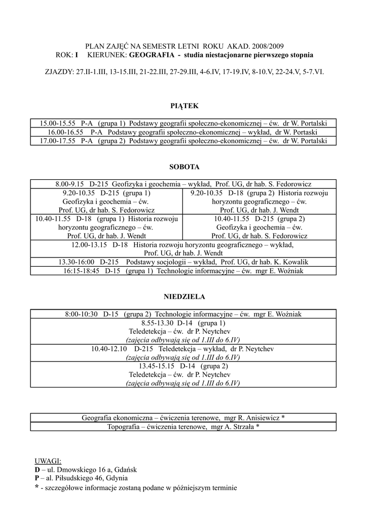 PLAN ZAJĘĆ NA SEMESTR LETNI ROKU AKAD. 2008/2009 ROK: I KIERUNEK: GEOGRAFIA - studia niestacjonarne pierwszego stopnia ZJAZDY: 27.II-1.III, 13-15.III, 21-22.III, 27-29.III, 4-6.IV, 17-19.IV, 8-10.V, 22-24.V, 5-7.VI. PIĄTEK 15.00-15.55 P-A (grupa 1) Podstawy geografii społeczno-ekonomicznej – ćw. dr W. Portalski 16.00-16.55 P-A Podstawy geografii społeczno-ekonomicznej – wykład, dr W. Portaski 17.00-17.55 P-A (grupa 2) Podstawy geografii społeczno-ekonomicznej – ćw. dr W. Portalski SOBOTA 8.00-9.15 D-215 Geofizyka i geochemia – wykład, Prof. UG, dr hab. S. Fedorowicz 9.20-10.35 D-215 (grupa 1) 9.20-10.35 D-18 (grupa 2) Historia rozwoju Geofizyka i geochemia – ćw. horyzontu geograficznego – ćw. Prof. UG, dr hab. S. Fedorowicz Prof. UG, dr hab. J. Wendt 10.40-11.55 D-18 (grupa 1) Historia rozwoju 10.40-11.55 D-215 (grupa 2) horyzontu geograficznego – ćw. Geofizyka i geochemia – ćw. Prof. UG, dr hab. J. Wendt Prof. UG, dr hab. S. Fedorowicz 12.00-13.15 D-18 Historia rozwoju horyzontu geograficznego – wykład, Prof. UG, dr hab. J. Wendt 13.30-16:00 D-215 Podstawy socjologii – wykład, Prof. UG, dr hab. K. Kowalik 16:15-18:45 D-15 (grupa 1) Technologie informacyjne – ćw. mgr E. Woźniak NIEDZIELA 8:00-10:30 D-15 (grupa 2) Technologie informacyjne – ćw. mgr E. Woźniak 8.55-13.30 D-14 (grupa 1) Teledetekcja – ćw. dr P. Neytchev (zajęcia odbywają się od 1.III do 6.IV) 10.40-12.10 D-215 Teledetekcja – wykład, dr P. Neytchev (zajęcia odbywają się od 1.III do 6.IV) 13.45-15.15 D-14 (grupa 2) Teledetekcja – ćw. dr P. Neytchev (zajęcia odbywają się od 1.III do 6.IV) Geografia ekonomiczna – ćwiczenia terenowe, mgr R. Anisiewicz * Topografia – ćwiczenia terenowe, mgr A. Strzała * UWAGI: D – ul. Dmowskiego 16 a, Gdańsk P – al. Piłsudskiego 46, Gdynia * - szczegółowe informacje zostaną podane w późniejszym terminie ROK: II PLAN ZAJĘĆ NA SEMESTR LETNI ROKU AKAD. 2008/2009 KIERUNEK: GEOGRAFIA - studia niestacjonarne pierwszego stopnia ZJAZDY: 27.II-1.III, 13-15.III, 27-29.III, 17-19.IV, 8-10.V, 22-24.V. PIĄTEK 15.00-19.00 D-15 Geograficzne Systemy Informacyjne – ćwiczenia, mgr B. Pępek (w tym 15 min. przerwy, zajęcia odbędą się 8.V. i 22.V.) SOBOTA 8:00-13:30 D-17 Lektorat z języka angielskiego, mgr A. Karaś (w tym 15 min. przerwy) 8.00-9.30 Odrabiane zajęcia z sem. zimowego 13:45-15:00 D-18 Geografia polityczna – wykład, Prof. UG, dr hab. J. Wendt 15:05-17:00 D-18 Geografia polityczna – ćwiczenia, Prof. UG, dr hab. J. Wendt 17.05-21.00 D-15 Geograficzne Systemy Informacyjne – ćwiczenia, mgr B. Pępek (w tym 10 min. przerwy, zajęcia odbędą się 28.II., 14.III., 28.III., 18.IV.) NIEDZIELA 8.00-9.15 D-18 Geograficzne Systemy Informacyjne – wykład, dr J. Czochański 9.25-10.40 D-18 Kształtowanie i ochrona środowiska – wykład, dr J. Czochański 10.45-12.40 D-18 Kształtowanie i ochrona środowiska – ćwiczenia, dr J. Czochański 12.55-14.10 D-18 Gleboznawstwo i geografia gleb – wykład, dr R. Wróblewski 14.15-15.30 D-18 Gleboznawstwo i geografia gleb – ćwiczenia, dr R. Wróblewski 15:30-17:00 D-18 Lektorat z języka angielskiego, mgr A. Karaś Odrabiane zajęcia z sem. zimowego Geomorfologia – ćwiczenia terenowe, dr E. Zawadzka * Hydrologia – ćwiczenia terenowe, dr M. Borowiak * Meteorologia i klimatologia – ćwiczenia terenowe, dr A. Wyszkowski * Ćwiczenia regionalne – ćwiczenia terenowe, dr A. Wyszkowski * UWAGI: D – ul. Dmowskiego 16 a, Gdańsk * - szczegółowe informacje zostaną podane w późniejszym terminie PLAN ZAJĘĆ NA SEMESTR LETNI ROKU AKAD. 2008/2009 ROK: III KIERUNEK: GEOGRAFIA - studia niestacjonarne pierwszego stopnia ZJAZDY: 28.II-1.III, 14-15.III, 9-10.V, 23-24.V, 6-7.VI. SOBOTA 9.00-12.10 P-2 Geografia regionalna świata – wykład, dr M. Pacuk (w tym 10 min. przerwy) 12.15-13.45 P-3 (grupa 1) 14.00-15.30 P-3 (grupa 2) Geografia regionalna świata – ćwiczenia, Geografia regionalna świata – ćwiczenia, dr M. Pacuk dr M. Pacuk 14.00-17.00 P-8 Seminarium dyplomowe* dr M. Czepczyński NIEDZIELA 8.00-12.30 P-8 Pracownia dyplomowa dr M. Czepczyński 8.00-12.30 D-17 Pracownia dyplomowa dr K. Jereczek-Korzeniewska, dr W. Maślanka 12.45-15.45 D-17 Seminarium dyplomowe dr K. Jereczek-Korzeniewska, dr W. Maślanka UWAGI: D – ul. Dmowskiego 16 a, Gdańsk P – al. Piłsudskiego 46, Gdynia * Seminarium dyplomowe z dr M. Czepczyńskim nie odbędzie się 09.05.2009. Zajęcia zostały przeniesione na 18.04.2009.