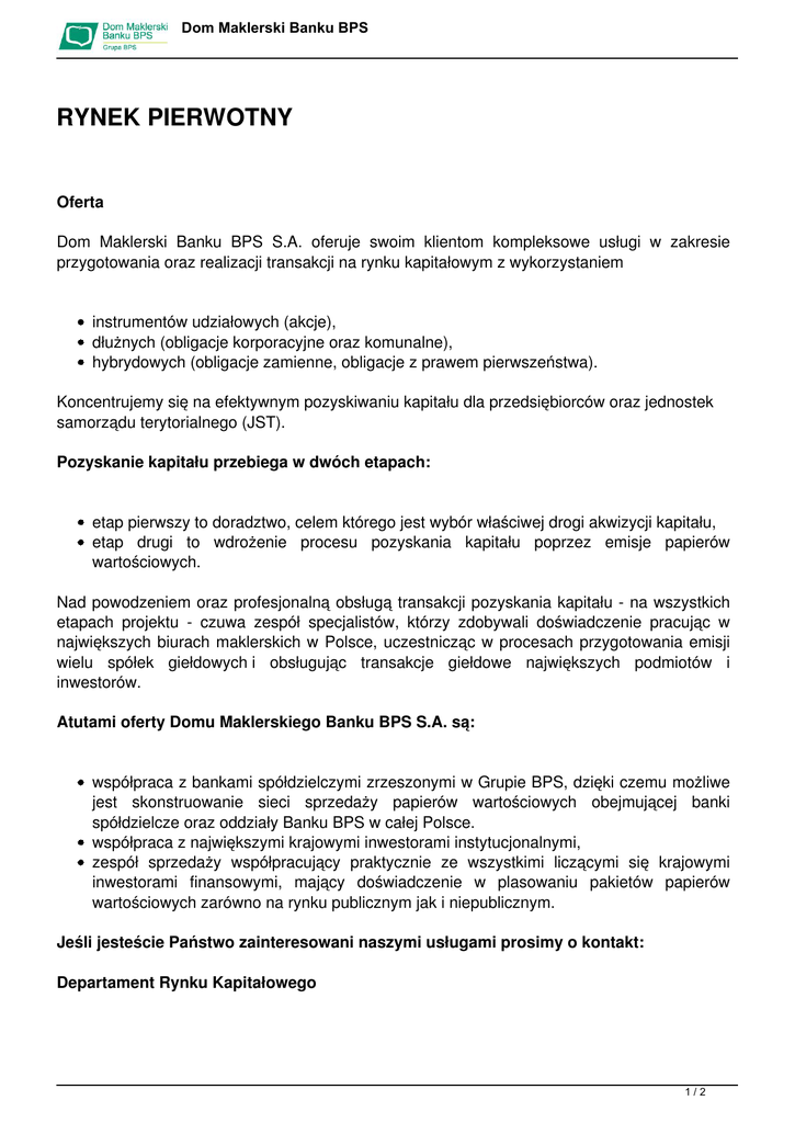 Dom Maklerski Banku BPS RYNEK PIERWOTNY Oferta Dom Maklerski Banku BPS S.A. oferuje swoim klientom kompleksowe usługi w zakresie przygotowania oraz realizacji transakcji na rynku kapitałowym z wykorzystaniem instrumentów udziałowych (akcje), dłużnych (obligacje korporacyjne oraz komunalne), hybrydowych (obligacje zamienne, obligacje z prawem pierwszeństwa). Koncentrujemy się na efektywnym pozyskiwaniu kapitału dla przedsiębiorców oraz jednostek samorządu terytorialnego (JST). Pozyskanie kapitału przebiega w dwóch etapach: etap pierwszy to doradztwo, celem którego jest wybór właściwej drogi akwizycji kapitału, etap drugi to wdrożenie procesu pozyskania kapitału poprzez emisje papierów wartościowych. Nad powodzeniem oraz profesjonalną obsługą transakcji pozyskania kapitału - na wszystkich etapach projektu - czuwa zespół specjalistów, którzy zdobywali doświadczenie pracując w największych biurach maklerskich w Polsce, uczestnicząc w procesach przygotowania emisji wielu spółek giełdowych i obsługując transakcje giełdowe największych podmiotów i inwestorów. Atutami oferty Domu Maklerskiego Banku BPS S.A. są: współpraca z bankami spółdzielczymi zrzeszonymi w Grupie BPS, dzięki czemu możliwe jest skonstruowanie sieci sprzedaży papierów wartościowych obejmującej banki spółdzielcze oraz oddziały Banku BPS w całej Polsce. współpraca z największymi krajowymi inwestorami instytucjonalnymi, zespół sprzedaży współpracujący praktycznie ze wszystkimi liczącymi się krajowymi inwestorami finansowymi, mający doświadczenie w plasowaniu pakietów papierów wartościowych zarówno na rynku publicznym jak i niepublicznym. Jeśli jesteście Państwo zainteresowani naszymi usługami prosimy o kontakt: Departament Rynku Kapitałowego 1/2 Dom Maklerski Banku BPS Domu Maklerskiego Banku BPS S.A. Tel. (+4822) 539-55-30 2/2