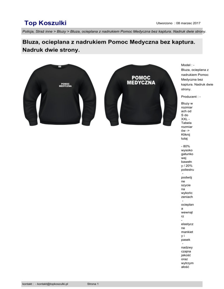 Top Koszulki Utworzono : 08 marzec 2017 Policja, Straż inne > Bluzy > Bluza, ocieplana z nadrukiem Pomoc Medyczna bez kaptura. Nadruk dwie strony. Bluza, ocieplana z nadrukiem Pomoc Medyczna bez kaptura. Nadruk dwie strony. Model : Bluza, ocieplana z nadrukiem Pomoc Medyczna bez kaptura. Nadruk dwie strony. Producent : Bluzy w rozmiar ach od S do XXL Tabela rozmiar ów -> Kliknij tutaj - 80% wysoko gatunko wej bawełn y / 20% poliestru podwój ne szycie na wykońc zeniach ocieplan a wewnąt rz elastycz ne mankiet yi pasek nadzwy czajna jakość oraz wytrzym ałość kontakt : - [email protected] Strona 1 Top Koszulki Utworzono : 08 marzec 2017 Policja, Straż inne > Bluzy > Bluza, ocieplana z nadrukiem Pomoc Medyczna bez kaptura. Nadruk dwie strony. Bluza, ocieplana z nadrukiem Pomoc Medyczna bez kaptura. Nadruk dwie strony. Jakość pierwsz a Wyjątko wy nadruk trwałe, żywe kolory! Nadruk na bluzach jest bardzo trwały, posiada zawsze „ żywe kolory&r dquo; � Bluzy wysyła my codzien nie od poniedzi ałku do piątku w ciągu: �- 24 godzin od moment u wpływu należ ności na konto bankow e - przy kupnie z przedpł atą �- 24 godzin od chwili zamów kontakt : - [email protected] Strona 2 Top Koszulki Utworzono : 08 marzec 2017 Policja, Straż inne > Bluzy > Bluza, ocieplana z nadrukiem Pomoc Medyczna bez kaptura. Nadruk dwie strony. Bluza, ocieplana z nadrukiem Pomoc Medyczna bez kaptura. Nadruk dwie strony. ienia koszule kz płatno ścią przy odbiorz e - przy kupnie za pobrani em W razie jakichko lwiek pytań zaprasz amy do kontakt u: kontakt @topko szulki.pl Cena : 69,99 zł Brutto ( 56,90 zł Netto) Dostępne opcje Bluza, ocieplana z nadrukiem Pomoc Medyczna bez kaptura. Nadruk dwie strony. : Wybierz rozmiar bluzy S, M, L, XL, XXL. Dostępność: Produkt dostępny w naszym sklepie od 07 listopad 2012 kontakt : - [email protected] Strona 3