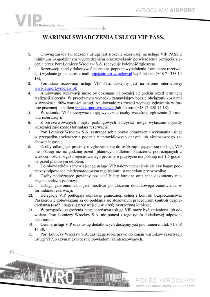 WARUNKI ŚWIADCZENIA USŁUGI VIP PASS. Główną zasadą świadczenia usługi jest złoŜenie rezerwacji na usługę VIP PASS z minimum 24-godzinnym wyprzedzeniem oraz uzyskanie potwierdzenia przyjęcia zlecenia przez Port Lotniczy Wrocław S.A. (decyduje kolejność zgłoszeń). 2. Rezerwacji naleŜy dokonywać pisemnie, poprzez wypełnienie formularza rezerwacji i wysłanie go na adres e-mail: [email protected] bądź faksem (+48 71 358 14 18); 3. Formularz rezerwacji usługi VIP Pass dostępny jest na stronie internetowej www.airport.wroclaw.pl; 4. Anulowanie rezerwacji moŜe by dokonane najpóźniej 12 godzin przed terminem realizacji zlecenia. W przeciwnym wypadku zamawiający będzie obciąŜony kosztami w wysokości 50% wartości usługi. Anulowanie rezerwacji wymaga zgłoszenia w formie pisemnej – mailem [email protected] faksem (+48 71 358 14 18); 5. W saloniku VIP przebywać mogą wyłącznie osoby wcześniej zgłoszone (formularz rezerwacji); 6. Z zarezerwowanych miejsc parkingowych korzystać mogą wyłącznie pojazdy wcześniej zgłoszone (formularz rezerwacji); 7. Port Lotniczy Wrocław S.A. zastrzega sobie prawo odmówienia wykonania usługi w przypadku stwierdzenia podania nieprawidłowych danych lub niestosownego zachowania gości; Osoby odlatujące prosimy o zgłaszanie się do osób zajmujących się obsługą VIP 8. nie później niŜ na godzinę przed planowym odlotem. PasaŜerów podróŜujących z większą ilością bagaŜu rejestrowanego prosimy o przybycie nie później niŜ 1,5 godziny przed planowym odlotem; 9. Do obowiązków zamawiającego usługę VIP naleŜy upewnienie się czy bagaŜ podręczny odpowiada międzynarodowym regulacjom i standardom przewoźnika; 10. Osoby podróŜujące powinny posiadać bilety lotnicze oraz inne dokumenty niezbędne podczas podróŜy; 11. Usługa gastronomiczna jest moŜliwa po złoŜeniu dodatkowego zamówienia w formularzu rezerwacji; Delegacje VIP podlegają odprawie granicznej, celnej i kontroli bezpieczeństwa. 12. PasaŜerowie zobowiązani są do poddania się stosownym procedurom kontroli bezpieczeństwa (osób i bagaŜu) przy wejściu w strefę zastrzeŜoną lotniska; 13. W przypadku zagroŜenia bezpieczeństwa usługa VIP moŜe być zmieniona lub odwołana. Port Lotniczy Wrocław S.A. nie ponosi z tego tytułu dodatkowej odpowiedzialności; 14. Cennik usługi VIP oraz usług dodatkowych dostępny jest pod numerem tel. 71 358 14 38; 15. Port Lotniczy Wrocław S.A. zastrzega sobie prawo do zmian warunków rezerwacji usługi VIP, o czym niezwłocznie powiadomi zainteresowanych. 1.