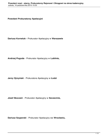 Powołani nowi - starzy, Prokuratorzy Rejonowi i Okręgowi na okres kadencyjny. sobota, 16 października 2010 10:33 Powołani Prokuratorzy Apelacyjni Dariusz Korneluk - Prokurator Apelacyjny w Warszawie Andrzej Pogoda - Prokurator Apelacyjny w Lublinie, Jerzy Ojrzyński - Prokuratora Apelacyjny w Łodzi Józef Skoczeń - Prokurator Apelacyjny w Szczecinie, Dariusz Szyperski - Prokurator Apelacyjny we Wrocławiu, 1/8 Powołani nowi - starzy, Prokuratorzy Rejonowi i Okręgowi na okres kadencyjny. sobota, 16 października 2010 10:33 Zastępcy Prokuratorów Apelacyjnych: Andrzej Kózka- prokurator Prokuratury Apelacyjnej w Katowicach, Marek Wójcik - prokurator Prokuratury Apelacyjnej w Katowicach. Dariusz Popieniuk – Zastępca Prokuratora Apelacyjnego w Gdańsku, Zbigniew Niemczyk - Zastępca Prokuratora Apelacyjnego w Gdańsku, 2/8 Powołani nowi - starzy, Prokuratorzy Rejonowi i Okręgowi na okres kadencyjny. sobota, 16 października 2010 10:33 I. Prokuratorzy Okręgowi : Apelacja Białostocka Hanna Lewczuk - Prokuratura Okręgowa w Suwałkach Tadeusz Marek - Prokuratura Okręgowa w Białymstoku Jan Przybyłek - Prokuratura Okręgowa w Olsztynie Tomasz Wilk - Prokuratura Okręgowa w Łomży Apelacja Katowicka: 3/8 Powołani nowi - starzy, Prokuratorzy Rejonowi i Okręgowi na okres kadencyjny. sobota, 16 października 2010 10:33 Ewa Świercz - Dydak - Prokuratura Okręgowa w Częstochowie Dorota Wacławowicz - Prokuratura Okręgowa w Gliwicach Katarzyna Kuklis - Prokuratura Okręgowa w Bielsko- Białej Krzysztof Kołaczek - Prokuratura Okręgowa w Katowicach. Marian Burczyk - Prokurator Okręgowy w Tarnobrzegu, Bogdan Gunia - Prokurator Okręgowy w Rzeszowie, Adam Kownacki - Prokurator Okręgowy w Przemyślu, Dariusz Różycki - Prokurator Okręgowy w Gdańsku, 4/8 Powołani nowi - starzy, Prokuratorzy Rejonowi i Okręgowi na okres kadencyjny. sobota, 16 października 2010 10:33 Jan Stawicki - Prokurator Okręgowy we Włocławku, Marcin Włodarczyk - Prokurator Okręgowy w Słupsku, Wiesława Zyman - Prokurator Okręgowy w Toruniu, Zbigniew Więckiewicz - Prokurator Okręgowy w Elblągu, Piotr Grzegorek - Prokurator Okręgowy w Bydgoszczy 5/8 Powołani nowi - starzy, Prokuratorzy Rejonowi i Okręgowi na okres kadencyjny. sobota, 16 października 2010 10:33 Anna Huzarska - Zastępca Prokuratura Okręgowego w Zielonej Górze Marian Orlicki - Zastępca Prokuratura Okręgowego w Poznaniu Roman Szymanowski - Zastępca Prokuratura Okręgowego w Poznaniu Wiesław Szerszeń - Zastępca Prokuratura Okręgowego w Koninie II. Prokuratorów Rejonowych nominowani kadencyjnie 36 miastach: Pan Tadeusz Cebo - w Gorlicach Pan Zbigniew Cegieła - we Włoszczowie Pani Lucyna Czechowicz - Kraków – Śródmieście Zachód w Krakowie 6/8 Powołani nowi - starzy, Prokuratorzy Rejonowi i Okręgowi na okres kadencyjny. sobota, 16 października 2010 10:33 Pani Elżbieta Doniec - Kraków – Nowa Huta w Krakowie Pani Anna Dukielska - w Chrzanowie Pan Mieczysław Dzięgiel - w Bochni Pan Artur Feigel - Kielce – Zachód w Kielcach Pan Piotr Gładysiewicz - w Końskich Pani Renata Golińska–Worosz - w Tarnowie Pan Piotr Grądzki - w Wieliczce Pan Krzysztof Grudniewski - w Starachowicach Pan Ludwik Huzior - w Muszynie Pan Cezary Kiszka –w Busku -Zdroju Pani Krystyna Kowalczyk - Kraków – Śródmieście Wschód w Krakowie 7/8 Powołani nowi - starzy, Prokuratorzy Rejonowi i Okręgowi na okres kadencyjny. sobota, 16 października 2010 10:33 Pan Jerzy Kutera - w Skarżysku Kamiennej Pan Andrzej Lewandowski - w Dąbrowie Tarnowskiej Pan Zbigniew Lis - w Zakopanem Pan Tomasz Moskwa - w Miechowie Pani Ewa Nowak - w Pińczowie Pan Wiesław Nowak - Staszowie Pani Renata Orłowska - Opatowie Pan Józef Palenik - w Nowym Targu Pan Jacek Para - Kraków – Podgórze w Krakowie Pan Waldemar Pionka - w Ostrowcu Świętokrzyskim Pani Grażyna Pniak - w Oświęcimiu Pan Jerzy Procner - w Suchej Beskidzkiej 8/8