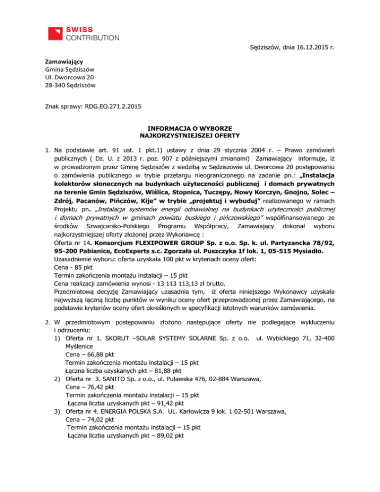 Sędziszów, dnia 16.12.2015 r. Zamawiający Gmina Sędziszów Ul. Dworcowa 20 28‐340 Sędziszów Znak sprawy: RDG.EO.271.2.2015 INFORMACJA O WYBORZE NAJKORZYSTNIEJSZEJ OFERTY 1. Na podstawie art. 91 ust. 1 pkt.1) ustawy z dnia 29 stycznia 2004 r. – Prawo zamówień publicznych ( Dz. U. z 2013 r. poz. 907 z późniejszymi zmianami) Zamawiający informuje, iż w prowadzonym przez Gminę Sędziszów z siedzibą w Sędziszowie ul. Dworcowa 20 postępowaniu o zamówienia publicznego w trybie przetargu nieograniczonego na zadanie pn.: „Instalacja kolektorów słonecznych na budynkach użyteczności publicznej i domach prywatnych na terenie Gmin Sędziszów, Wiślica, Stopnica, Tuczępy, Nowy Korczyn, Gnojno, Solec – Zdrój, Pacanów, Pińczów, Kije” w trybie „projektuj i wybuduj” realizowanego w ramach Projektu pn. „Instalacja systemów energii odnawialnej na budynkach użyteczności publicznej i domach prywatnych w gminach powiatu buskiego i pińczowskiego” współfinansowanego ze środków Szwajcarsko-Polskiego Programu Współpracy, Zamawiający dokonał wyboru najkorzystniejszej oferty złożonej przez Wykonawcę : Oferta nr 14. Konsorcjum FLEXIPOWER GROUP Sp. z o.o. Sp. k. ul. Partyzancka 78/92, 95-200 Pabianice, EcoExperts s.c. Zgorzała ul. Puszczyka 1f lok. 1, 05-515 Mysiadło. Uzasadnienie wyboru: oferta uzyskała 100 pkt w kryteriach oceny ofert: Cena - 85 pkt Termin zakończenia montażu instalacji – 15 pkt Cena realizacji zamówienia wynosi - 13 113 113,13 zł brutto. Przedmiotową decyzję Zamawiający uzasadnia tym, iż oferta niniejszego Wykonawcy uzyskała najwyższą łączną liczbę punktów w wyniku oceny ofert przeprowadzonej przez Zamawiającego, na podstawie kryteriów oceny ofert określonych w specyfikacji istotnych warunków zamówienia. 2. W przedmiotowym postępowaniu złożono następujące oferty nie podlegające wykluczeniu i odrzuceniu: 1) Oferta nr 1. SKORUT –SOLAR SYSTEMY SOLARNE Sp. z o.o. ul. Wybickiego 71, 32-400 Myślenice Cena – 66,88 pkt Termin zakończenia montażu instalacji – 15 pkt Łączna liczba uzyskanych pkt – 81,88 pkt 2) Oferta nr 3. SANITO Sp. z o.o., ul. Puławska 476, 02-884 Warszawa, Cena – 76,42 pkt Termin zakończenia montażu instalacji – 15 pkt Łączna liczba uzyskanych pkt – 91,42 pkt 3) Oferta nr 4. ENERGIA POLSKA S.A. UL. Karłowicza 9 lok. 1 02-501 Warszawa, Cena – 74,02 pkt Termin zakończenia montażu instalacji – 15 pkt Łączna liczba uzyskanych pkt – 89,02 pkt 4) Oferta nr 5. Konsorcjum Piotr Machalewski i Witold Świtkowski Przedsiębiorstwo BudowlanoUsługowe „ WIKTOR” Sp. j ul. Kolejowa 8, 97- 500 Radomsko ADJUS Jerzy Pałuszka, Wierzchowisko, ul. Prosta 11, 42-233 Mykanów, Cena – 68,61 pkt Termin zakończenia montażu instalacji – 15 pkt Łączna liczba uzyskanych pkt – 83,61 pkt 5) Oferta nr 8. NOVUM Centrum Techniki Grzewczej i Sanitarnej Stanisław Markiewicz ul. Michała Mięsowicza 2, 38-400 Krosno Cena – 62,78 pkt Termin zakończenia montażu instalacji – 7,26 pkt Łączna liczba uzyskanych pkt – 70,04 pkt 6) Oferta nr 11. CALDORIS POLSKA Sp. z o.o. ul. Armii Krajowej 220, 43-316 Bielsko-Biała Cena – 71,66 pkt Termin zakończenia montażu instalacji – 15 pkt Łączna liczba uzyskanych pkt – 86,66 pkt 7) Oferta nr 13. ANTINUS Sp. z o.o. z siedzibą w Skierniewicach, ul. Sobieskiego 39 B5, 96-100 Skierniewice Cena – 71,45 pkt Termin zakończenia montażu instalacji – 15 pkt Łączna liczba uzyskanych pkt – 86,45 pkt 3. Na podstawie art. 92 ust. 1 pkt. 2 ustawy Prawo zamówień publicznych Zamawiający informuje, iż w prowadzonym postępowaniu odrzucona została: 1) Oferta nr 2. EKO PROGRAM Sp. z o.o. Sp. k. ul. Oświęcimska 99, 32-651 Nowa Wieś. Uzasadnienie faktyczne: Zamawiający zgodnie z dyspozycją Rozdziału XI pkt C SIWZ wymagał złożenia oferty zawierającej dokumenty tam wyliczone. Wykonawca złożył ofertę niekompletną. Zamawiający wezwał stosownie do treści art. 26 ust. 3 i 4 ustawy Wykonawcę do uzupełnienia dokumentów potwierdzających spełnianie przez Wykonawcę warunków udziału w postępowaniu. Pomimo otrzymanego wezwania do uzupełnienia oferty, Wykonawca w wyznaczonym przez Zamawiającego terminie nie dokonał pełnego uzupełnienia dokumentu tj . nie uzupełnił opisu typu budynków pod proponowanymi schematami, - co spowodowało odrzucenie złożonej oferty jako nie odpowiadającej treści SIWZ. Uzasadnienie prawne: W związku z tym Wykonawca nie wykazał, że spełnia warunki udziału w postępowaniu, jego oferta zostaje odrzucona (art. 89 ust. 1 pkt 2 i 5 ustawy Pzp). 2) Oferta nr 6. PPHU PION-BUD Katarzyna Rej ul. Jagiełły 15, 82-200 Malbork. Uzasadnienie faktyczne: Zamawiający zwrócił się z wnioskiem do Wykonawcy o wyrażenie zgody na przedłużenie terminu związania z ofertą z jednoczesnym przedłużeniem okresu ważności wadium, na co Wykonawca nie wyraził zgody. Uzasadnienie prawne: Oferta została złożona przez Wykonawcę wykluczonego z udziału w postępowaniu o udzielenie zamówienia na podstawie art. 89 ust. 1 pkt 5 ustawy Pzp. 3) Oferta nr 7. GLOBECO Adam Nowak ul. Kwartowa 22/37, 31-419 Kraków. Uzasadnienie faktyczne: Zamawiający zgodnie z dyspozycją Rozdziału XI pkt A.4. SIWZ zał. nr 3 wymagał wykazania: - doświadczenia zawodowego kierownika robót budowlanych, co najmniej pięcioletniego doświadczenia zawodowego, w tym co najmniej dwuletnie doświadczenie w kierowaniu od mm /rr do mm/ rr robotami w specjalności instalacyjnej w zakresie sieci, instalacji i urządzeń wodociągowych, kanalizacyjnych, ciepłowniczych, wentylacyjnych, (doświadczenia w instalacji kolektorów słonecznych ), - doświadczenia zawodowego projektanta, co najmniej trzyletnie doświadczenie zawodowe, w tym co najmniej dwuletnie doświadczenie w projektowaniu robót budowlanych związanych z instalacjami solarnymi ( kolektory słoneczne). Wykonawca złożył ofertę niekompletną. Zamawiający wezwał stos