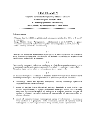 R E G U LA M I N w sprawie określenia obowiązków Spółdzielni i członków w zakresie napraw wewnątrz lokali w Gdańskiej Spółdzielni Mieszkaniowej (tekst jednolity wg stanu prawnego na 18.11.2016r.) ---------------------------------------------------Podstawa prawna: - Ustawa z dnia 15.12.2000r. o spółdzielniach mieszkaniowych (Dz. U. z 2001r. nr 4, poz. 27 z późn. zm.) - Rozp. Ministra Spraw Wewnętrznych i Administracji z dn.16.08.1999r. w sprawie warunków technicznych użytkowania budynków mieszkalnych (Dz. U. nr 74, poz. 836) - statut Gdańskiej Spółdzielni Mieszkaniowej. § 1. Obowiązkiem Spółdzielni oraz członków wynikającym ze statutu Spółdzielni jest utrzymanie stanu technicznego budynków mieszkalnych na poziomie zapewniającym bezpieczeństwo ludzi i mienia w okresie ich użytkowania. § 2. Naprawami w rozumieniu niniejszego regulaminu są roboty konserwacyjne, remontowe oraz wymiana zużytych lub uszkodzonych elementów budynku i wyposażenia wewnątrz lokali. Nie zalicza się do wnętrza lokalu zewnętrznej strony drzwi wejściowych. § 3. Do zakresu obowiązków Spółdzielni w dziedzinie napraw wewnątrz lokali finansowanych środkami pochodzącymi z odpisów pobieranych w opłatach czynszowych zalicza się: 1. konserwację, remont lub wymianę wewnętrznej instalacji centralnego ogrzewania, z wyjątkiem instalacji typu etażowego. 2. remont lub wymianę instalacji kanalizacji sanitarnej do trójnika w pionie instalacyjnym łącznie z tym trójnikiem oraz tych przewodów odpływowych od wanien, które przechodzą przez strop do mieszkania poniżej lub ułożone są w stropie (z wyjątkiem remontu lub wymiany wynikającej z przeróbek dokonanych przez członka lub jego domowników we własnym zakresie). 3. remont lub wymianę instalacji wodociągowej, łącznie z wodomierzem i zaworem od strony zasilania, a w przypadku braku wodomierza, remont lub wymianę instalacji wodociągowej do pierwszego zaworu od strony zasilania, łącznie z tym zaworem. 4. remont lub wymianę instalacji cyrkulacji ciepłej wody 5. konserwację, remont lub wymianę instalacji gazowej do urządzeń odbiorczych (kuchenka gazowa i piecyk gazowy) 6. remont lub wymianę instalacji i urządzeń elektrycznych do pierwszego zabezpieczenia przedlicznikowego bez tablicy licznikowej i licznika, który jest własnością Zakładu Energetycznego 7. udrażnianie oraz uszczelnianie przewodów spalinowych i wentylacyjnych 8. konserwację zewnętrznej strony standardowych drzwi wejściowych do lokalu 9. naprawę instalacji domofonowej przejętej przez Spółdzielnię w konserwację z wyjątkiem osprzętu w mieszkaniach. 10. naprawy polegające na usunięciu zniszczeń wewnątrz lokali powstałych na skutek niewykonania napraw obciążających Spółdzielnię (np. usunięcie zacieków powstałych na skutek nieszczelności dachu, płyt ściennych, awarii instalacji centralnego ogrzewania itp.). Naprawy te obejmują standardowe wykończenie mieszkań. 11. wymianę wodomierzy. § 4. - skreślony § 5. 1. Członek Spółdzielni i właściciel lokalu niebędący członkiem obowiązany jest do utrzymania jego właściwego stanu technicznego, higieniczno-sanitarnego i estetycznego oraz dokonywania we własnym zakresie i na własny koszt napraw określonych w niniejszym regulaminie. 2. Do obowiązków wymienionych w ust.1 należą między innymi: 1) konserwacja, naprawa, wymiana posadzek i podłóg oraz naprawa i wymiana podłoży 2) konserwacja, naprawa i wymiana stolarki okiennej i drzwiowej 3) konserwacja, naprawa i wymiana urządzeń techniczno-sanitarnych z osprzętem w postaci sedesów, syfonów, baterii, wężyków do spłuczek łącznie 4) naprawa i wymiana instalacji ogrzewania etażowego 4¹) pierwszy montaż wodomierzy 5) naprawa i wymiana przewodów odpływowych do urządzeń sanitarnych, z wyjątkiem wymienionych w § 3 pkt. 2 oraz podejść wodnych do urządzeń sanitarnych, w tym niezwłoczne usuwanie ich niedrożności i przecieków 6) naprawa i wymiana osprzętu oraz instalacji elektrycznej wraz z zabezpieczeniami znajdującymi się w mieszkaniu 7) malowanie lub tapetowanie ścian i sufitów oraz naprawa uszkodzeń tynków 8) malowanie obustronne stolarki drewnianej, wbudowanych mebli, rur instalacyjnych i grzewczych oraz malowanie loggii i balkonów łącznie z barierkami i płytami osłonowymi (od strony mieszkania). Malowanie loggii powinno być zgodne z kolorystyką elewacji. 9) zabezpieczenie drzwi wejściowych do lokali i innych samodzielnie użytkowanych pomieszczeń (piwnice, pomieszczenia gospodarcze) przed włamaniem i usuwanie skutków włamań. 10) usunięcie zabudowy lub obudowy instalacji c.o., c.w., wodn.-kan., wykonanej przez członka we własnym zakresie w przypadku awarii, remontu lub modernizacji wykonywanych przez Spółdzielnię. Koszty związane z usunięciem zabudowy lub obudowy i ewentualnych zniszczeń pokrywa członek Spółdzielni niezależnie od posiadanego prawa do lokalu. 11) natychmiastowe odłączenie urządzeń gazowych (kuchenka, piecyk) od instalacji, w przypadku niesprawności lub uszkodzenia, przeprowadzenie ich konserwacji, naprawy lub wymiany przez osoby do tego uprawnione oraz zgłoszenie powyższego do administracji osiedla. 3. Członek Spółdzielni zobowiązany jest również: 1) niezwłocznie udostępnić swój lokal w celu usunięcia awarii wywołującej szkodę lub zagrażającej bezpośrednio powstaniem szkody, pod rygorem wejścia Spółdzielni do lokalu w obecności funkcjonariusza Policji, a gdy wymaga to pomocy straży pożarnej – także przy jej udziale, 2) po wcześniejszym uzgodnieniu terminu udostępnić także lokal w celu: a) dokonania okresowego, a w szczególnie uzasadnionych wypadkach również doraźnego przeglądu stanu wyposażenia technicznego lokalu oraz ustalenia zakresu niezbędnych prac i ich wykonania, b) przeprowadzenia remontu, przebudowy lub modernizacji budynku, jego części lub poszczególnych lokali albo wypo