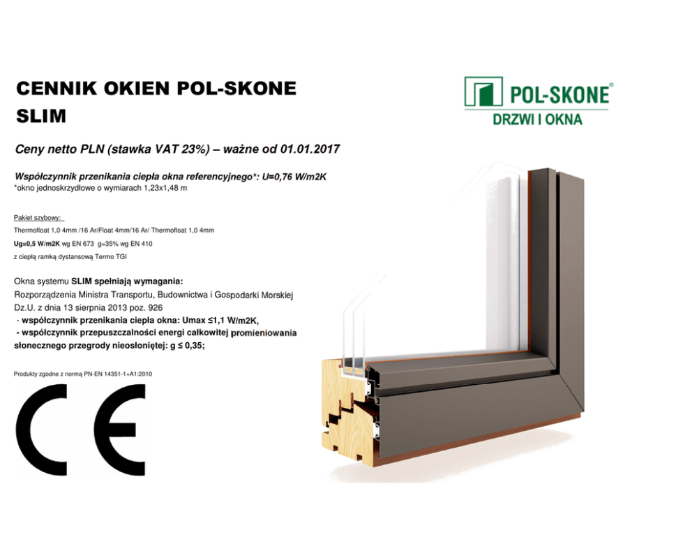 CENNIK OKIEN POL-SKONE SLIM Ceny netto PLN (stawka VAT 23%) – ważne od 01.01.2017 Współczynnik przenikania ciepła okna referencyjnego*: U=0,76 W/m2K *okno jednoskrzydłowe o wymiarach 1,23x1,48 m Pakiet szybowy: Thermofloat 1,0 4mm /16 Ar/Float 4mm/16 Ar/ Thermofloat 1,0 4mm Ug=0,5 W/m2K wg EN 673 g=35% wg EN 410 z ciepłą ramką dystansową Termo TGI Okna systemu SLIM spełniają wymagania: Rozporządzenia Ministra Transportu, Budownictwa i Gospodarki Morskiej Dz.U. z dnia 13 sierpnia 2013 poz. 926 - współczynnik przenikania ciepła okna: Umax ≤1,1 W/m2K, - współczynnik przepuszczalności energi całkowitej promieniowania słonecznego przegrody nieosłoniętej: g ≤ 0,35; Produkty zgodne z normą PN-EN 14351-1+A1:2010 CENNIK DETALICZNY OKIEN POL-SKONE SLIM Okno FIX stałe w skrzydle Ceny netto PLN (stawka VAT 23%) – ważne od 01.01.2017 5 6 7 8 9 10 11 12 13 6 599 644 689 741 792 845 896 948 999 7 644 689 743 795 849 903 956 1010 1064 8 687 741 795 851 906 962 1017 1073 1128 9 735 792 849 906 963 1020 1077 1134 1191 10 785 843 902 962 1020 1079 1139 1197 1256 11 834 896 956 1017 1077 1139 1199 1260 1320 12 884 947 1010 1071 1134 1197 1259 1322 1385 13 933 998 1062 1127 1191 1256 1320 1385 1449 14 983 1050 1116 1182 1248 1314 1380 1446 1512 15 1101 1169 1238 1305 1373 1442 1509 1577 16 1152 1223 1292 1362 1431 1502 1571 1641 17 1205 1275 1347 1419 1491 1562 1634 1706 18 1256 1329 1403 1476 1550 1623 1697 1770 19 1307 1382 1458 1533 1608 1683 1758 1833 20 1359 1436 1512 1590 1667 1743 1821 1898 21 1490 1568 1647 1725 1805 1883 1962 22 1542 1623 1704 1784 1865 1946 2027 23 1596 1679 1761 1844 1926 2009 2091 24 1649 1733 1818 1902 1986 2070 2154 25 1703 1788 1875 1961 2046 2133 2219 Nr modułu oznacza zakres odpowiadający kolejnemu decymetrowi wymiaru (szerokość, wysokość). Np. moduł 7 oznacza zakres wymiarów 6,01 – 7,00 dm 14 1050 1116 1182 1248 1314 1380 1448 1514 1580 1646 1712 1778 1844 1910 1976 2042 2108 2174 2240 2306 15 1103 1170 1238 1307 1374 1442 1509 1577 1646 1713 1781 1848 1917 1985 2052 2120 2187 2256 2324 2391 16 1154 1224 1293 1364 1433 1502 1572 1641 1712 1781 1851 1920 1989 2060 2129 2199 2268 2339 2408 2477 Standard wykonania: 1. Okno jednoramowe w systemie SLIM 2. Drewno sosnowe klejone warstwowo 3. Malowanie: biały (NCS s 0500-N); brąz (NCS s8010-Y90R), kolory opcjonalne - za dopłatą 4. Okładzina aluminiowa na zewnątrz 5. Kolor standardowy dla okładziny aluminiowej: RAL 9010, RAL 9016; inne dostępne kolory - patrz dopłaty 6. Pakiet szybowy: Thermofloat 1,0 4mm/16 Ar/Float 4mm/16 Ar/ Thermofloat 1,0 4mm z ramką dystansową Termo TGI RAL Ug=0,5 W/m2K wg EN 673 g=0,35 wg EN 410 7. Kolor ramki dystansowej Termo TGI - szary (RAL 7040) 17 18 19 20 1277 1349 1421 1491 1563 1635 1706 1778 1850 1920 1992 2063 2135 2207 2277 2349 2421 2492 1331 1404 1478 1551 1623 1697 1770 1844 1917 1991 2064 2136 2210 2283 2357 2430 1385 1460 1535 1610 1685 1760 1835 1910 1985 2060 2135 2210 2285 2360 2436 1437 1515 1592 1668 1745 1823 1899 1976 2054 2130 2207 2283 2361 2438 CENNIK DETALICZNY OKIEN POL-SKONE SLIM Okno rozwierne Ceny netto PLN (stawka VAT 23%) – ważne od 01.01.2017 od 470 6 7 8 9 10 11 12 13 6 786 834 887 941 7 833 888 942 999 1052 1118 8 831 885 942 999 1058 1112 1179 9 881 939 998 1056 1116 1173 1242 1301 10 932 992 1053 1113 1176 1233 1304 1364 1425 11 990 1052 1115 1176 1241 1299 1373 1434 1497 12 1041 1104 1169 1233 1298 1359 1434 1499 1562 13 1092 1158 1224 1290 1358 1421 1497 1563 1629 14 1143 1211 1278 1346 1416 1481 1559 1626 1694 15 1266 1337 1406 1476 1544 1623 1692 1763 16 1319 1391 1461 1535 1604 1686 1757 1829 17 1382 1455 1527 1602 1673 1757 1829 1902 18 1434 1509 1584 1661 1733 1818 1893 19 1488 1565 1641 1719 1794 1881 20 1541 1619 1698 1778 1854 Nr modułu oznacza zakres odpowiadający kolejnemu decymetrowi wymiaru (szerokość, wysokość). Np. moduł 7 oznacza zakres wymiarów 6,01 – 7,00 dm 14 15 1485 1559 1626 1694 1761 1832 1899 1620 1689 1760 1829 1901 Standard wykonania: 1. Okno jednoramowe w systemie SLIM 2. Drewno sosnowe klejone warstwowo 3. Malowanie: biały (NCS s 0500-N); brąz (NCS s8010-Y90R), kolory opcjonalne - za dopłatą 4. Okładzina aluminiowa na zewnątrz 5. Kolor standardowy dla okładziny aluminiowej: RAL 9010, RAL 9016; inne dostępne kolory - patrz dopłaty 6. Pakiet szybowy: Thermofloat 1,0 4mm/16 Ar/Float 4mm/16 Ar/ Thermofloat 1,0 4mm z ramką dystansową Termo TGI RAL Ug=0,5 W/m2K wg EN 673 g=0,35 wg EN 410 7. Kolor ramki dystansowej Termo TGI - szary (RAL 7040) 8. Okucia kryte Roto Royal 9. Klamki (kolor biały R 07.2 lub brąz R 04.4) w komplecie, kolory opcjonalne - za dopłatą 10. System potrójnego uszczelkowania: dwie uszczelki główne i jedna krawędziowa, w kolorze białym lub brązowym 11. Uszczelki przyszybowe w kolorze szarym CENNIK DETALICZNY OKIEN POL-SKONE SLIM Okno rozwierno-uchylne Ceny netto PLN (stawka VAT 23%) – ważne od 01.01.2017 od 470 6 7 8 9 10 11 12 13 6 788 834 888 942 7 834 890 944 1001 1053 1119 8 833 887 944 1001 1059 1113 1181 9 882 941 999 1058 1118 1173 1244 1301 10 933 993 1055 1115 1176 1235 1305 1365 1442 11 992 1053 1116 1178 1242 1301 1374 1436 1514 12 1041 1106 1170 1233 1299 1361 1436 1499 1578 13 1094 1160 1226 1292 1359 1422 1499 1563 1646 14 1145 1212 1280 1347 1416 1482 1560 1628 1710 15 1268 1337 1406 1478 1544 1625 1694 1778 16 1320 1392 1463 1536 1605 1686 1758 1844 17 1382 1455 1529 1604 1674 1758 1830 1919 18 1434 1511 1584 1662 1734 1820 1893 19 1488 1566 1643 1721 1794 1883 20 1541 1620 1698 1779 1854 Nr modułu oznacza zakres odpowiadający kolejnemu decymetrowi wymiaru (szerokość, wysokość). Np. moduł 7 oznacza zakres wymiarów 6,01 – 7,00 dm 14 15 1502 1575 1643 1710 1778 1847 1916 1637 1706 1776 1845 1917 Standard wykonania: 1. Okno jednoramowe w systemie SLIM 2. Drewno sosnowe klejone warstwowo 3. Malowanie: biały (NCS s 0500-N); brąz (NCS s8010-Y90R), kolory opcjonalne - za dopłatą 4. Okładzina aluminiowa na zewnątrz 