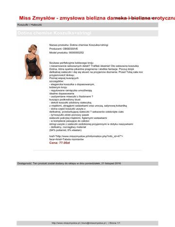 Utworzono:iśroda, 23 listopad 2016 Miss Zmysłów - zmysłowa bielizna damska bielizna erotyczna Koszulki i Haleczki Dotina chemise Koszulka+stringi Nazwa produktu: Dotina chemise Koszulka+stringi Producent: OBSESSIVE Model produktu: 0000000252 Szukasz perfekcyjnie kobiecego kroju i niesamowicie seksownych detali? Trafiłaś idealnie! Oto seksowna koszulka Dotina, która spełnia pikantne pragnienia i słodkie fantazje. Poczuj dotyk delikatnej siateczki i daj się skusić na przyjemne doznania. Przed Tobą cała noc przyjemności! Poznaj więcej kuszących szczegółów: - elegancka koszulka o dopasowanym, kobiecym kroju - regulowane ramiączka umożliwiają idealne dopasowanie - usztywniane miseczki z fiszbinami ? kusząco podkreślony biust - dekolt koszulki zdobiony siateczką z miękkimi, okrągłymi wstawkami oraz uroczą, satynową kokardką - dolna część koszulki uszyta z delikatnej. prześwitującej siateczki ? seksownie odsłonięte ciało - tył koszulki zdobi pionowy pasek siateczki pokrytej miękkimi, figlarnymi wstawkami - w komplecie pasujące do całości stringi uszyte z siateczki ozdobionej przyjemnymi w dotyku naszywkami - delikatny, rozciągliwy materiał (94% poliamid, 6% elastan) href="http://www.misszmyslow.pl/information.php?info_id=47"> face=Arial>Tabela rozmiarów Cena: 77.00zł Dostępność: Ten produkt został dodany do sklepu w dniu poniedziałek, 21 listopad 2016 http://www.misszmyslow.pl | [email protected] | | Strona 1/1