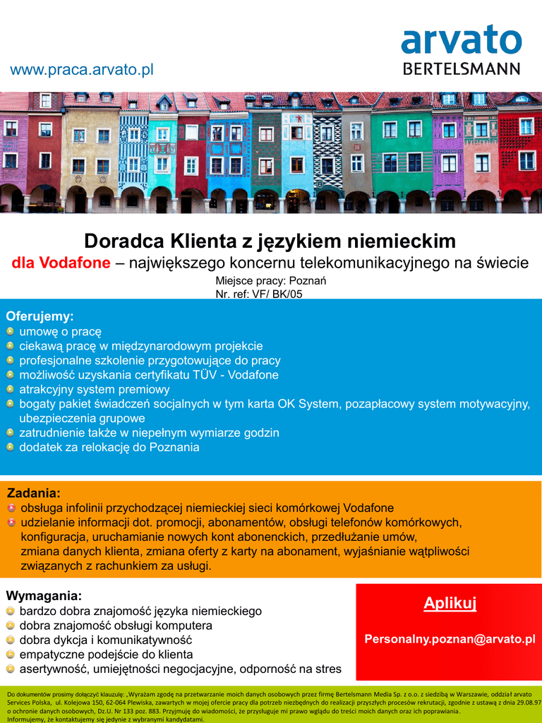 www.praca.arvato.pl Doradca Klienta z językiem niemieckim dla Vodafone – największego koncernu telekomunikacyjnego na świecie Miejsce pracy: Poznań Nr. ref: VF/ BK/05 Oferujemy: umowę o pracę ciekawą pracę w międzynarodowym projekcie profesjonalne szkolenie przygotowujące do pracy możliwość uzyskania certyfikatu TÜV - Vodafone atrakcyjny system premiowy bogaty pakiet świadczeń socjalnych w tym karta OK System, pozapłacowy system motywacyjny, ubezpieczenia grupowe zatrudnienie także w niepełnym wymiarze godzin dodatek za relokację do Poznania Zadania: obsługa infolinii przychodzącej niemieckiej sieci komórkowej Vodafone udzielanie informacji dot. promocji, abonamentów, obsługi telefonów komórkowych, konfiguracja, uruchamianie nowych kont abonenckich, przedłużanie umów, zmiana danych klienta, zmiana oferty z karty na abonament, wyjaśnianie wątpliwości związanych z rachunkiem za usługi. Wymagania: bardzo dobra znajomość języka niemieckiego dobra znajomość obsługi komputera dobra dykcja i komunikatywność empatyczne podejście do klienta asertywność, umiejętności negocjacyjne, odporność na stres Aplikuj [email protected] Do dokumentów prosimy dołączyć klauzulę: „ Wyrażam zgodę na przetwarzanie moich danych osobowych przez firmę Bertelsmann Media Sp. z o.o. z siedzibą w Warszawie, oddział arvato Services Polska, ul. Kolejowa 150, 62-064 Plewiska, zawartych w mojej ofercie pracy dla potrzeb niezbędnych do realizacji przyszłych procesów rekrutacji, zgodnie z ustawą z dnia 29.08.97 o ochronie danych osobowych, Dz.U. Nr 133 poz. 883. Przyjmuję do wiadomości, że przysługuje mi prawo wglądu do treści moich danych oraz ich poprawiania. Informujemy, że kontaktujemy się jedynie z wybranymi kandydatami.