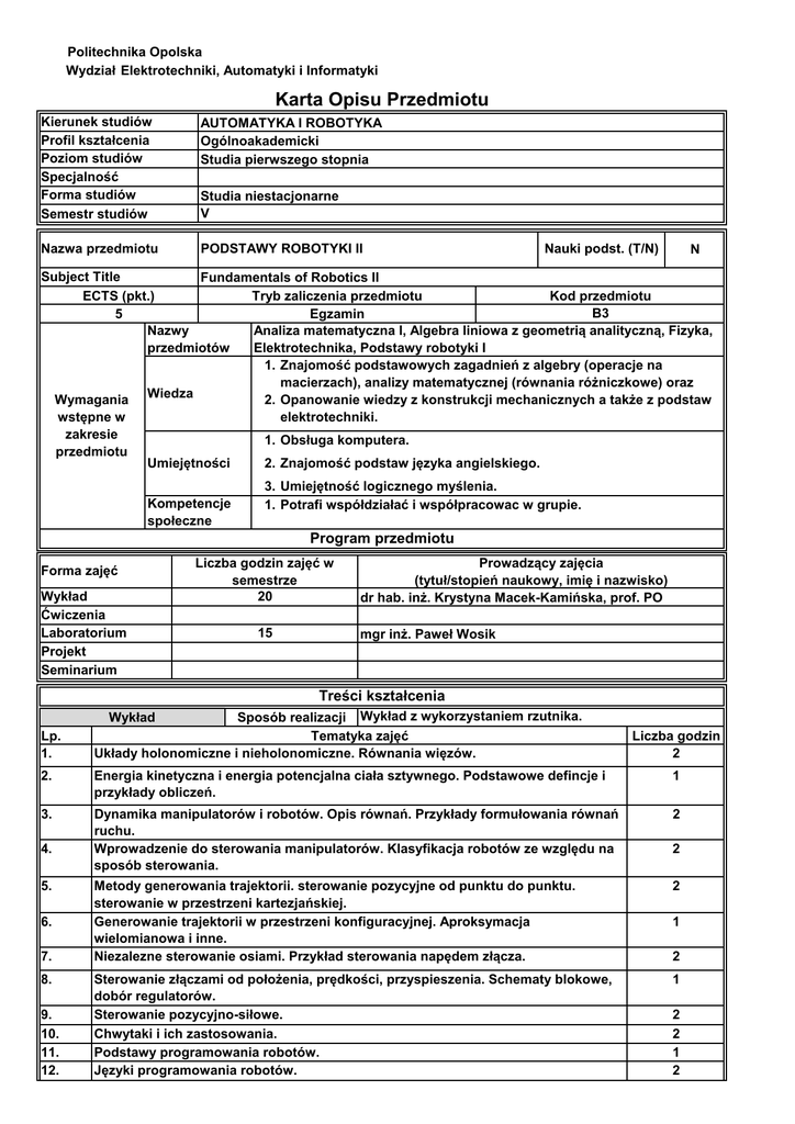 Politechnika Opolska Wydział Elektrotechniki, Automatyki i Informatyki Karta Opisu Przedmiotu Kierunek studiów Profil kształcenia Poziom studiów Specjalność Forma studiów Semestr studiów AUTOMATYKA I ROBOTYKA Ogólnoakademicki Studia pierwszego stopnia Nazwa przedmiotu PODSTAWY ROBOTYKI II Studia niestacjonarne V Nauki podst. (T/N) N Subject Title Fundamentals of Robotics II ECTS (pkt.) Tryb zaliczenia przedmiotu Kod przedmiotu B3 5 Egzamin Nazwy Analiza matematyczna I, Algebra liniowa z geometrią analityczną, Fizyka, przedmiotów Elektrotechnika, Podstawy robotyki I 1. Znajomość podstawowych zagadnień z algebry (operacje na macierzach), analizy matematycznej (równania różniczkowe) oraz 2. Opanowanie wiedzy z konstrukcji mechanicznych a także z podstaw Wymagania Wiedza elektrotechniki. wstępne w zakresie 1. Obsługa komputera. przedmiotu Umiejętności 2. Znajomość podstaw języka angielskiego. Kompetencje społeczne 3. Umiejętność logicznego myślenia. 1. Potrafi współdziałać i współpracowac w grupie. Program przedmiotu Forma zajęć Wykład Ćwiczenia Laboratorium Projekt Seminarium Liczba godzin zajęć w semestrze 20 15 Prowadzący zajęcia (tytuł/stopień naukowy, imię i nazwisko) dr hab. inż. Krystyna Macek-Kamińska, prof. PO mgr inż. Paweł Wosik Treści kształcenia Sposób realizacji Wykład z wykorzystaniem rzutnika. Tematyka zajęć Układy holonomiczne i nieholonomiczne. Równania więzów. Wykład Lp. 1. Liczba godzin 2 2. Energia kinetyczna i energia potencjalna ciała sztywnego. Podstawowe defincje i przykłady obliczeń. 1 3. Dynamika manipulatorów i robotów. Opis równań. Przykłady formułowania równań ruchu. Wprowadzenie do sterowania manipulatorów. Klasyfikacja robotów ze względu na sposób sterowania. 2 4. 5. 6. 7. 8. 9. 10. 11. 12. 2 Metody generowania trajektorii. sterowanie pozycyjne od punktu do punktu. sterowanie w przestrzeni kartezjańskiej. Generowanie trajektorii w przestrzeni konfiguracyjnej. Aproksymacja wielomianowa i inne. Niezalezne sterowanie osiami. Przykład sterowania napędem złącza. 2 Sterowanie złączami od położenia, prędkości, przyspieszenia. Schematy blokowe, dobór regulatorów. Sterowanie pozycyjno-siłowe. Chwytaki i ich zastosowania. Podstawy programowania robotów. Języki programowania robotów. 1 1 2 2 2 1 2 Liczba godzin zajęć w semestrze 20 Sposoby sprawdzenia zamierzonych Egzamin pisemno-ustny efektów kształcenia Laboratorium Sposób realizacji Zajęcia w laboratorium Podstaw Robotyki. Tematyka zajęć Lp. Liczba godzin 1. Zajęcia wprowadzające. Instruktaż stanowiskowy. 2 2. Tworzenie prostego stanowiska zrobotyzowanego w środowisku FANUC 3 Roboguide. 3. Programowanie off-line stworzonego stanowiska w środowiskuFANUC Roboguide. 3 4. Wprowadzenie do programowanie robotów FANUC ze sterownikiem R-30iA. 3 5. Definiowane narzędzia roboczego i praktyczne zastosowanie w programowaniu. 2 6. Zaliczenie przedmiotu. 2 Liczba godzin zajęć w semestrze 15 Kokokwium zaliczeniowe. Ustne odpytywanie. Projekty z Sposoby sprawdzenia zamierzonych programowania off-line. Realizacja zadań. efektów kształcenia 1. Ma wiedzę na temat dynamiki manipulatorów (W, L). Wiedza Efekty kształcenia dla przedmiotu - po zakończonym cyklu kształcenia Umiejętności Kompetencje społeczne 2. Ma wiedzę na temat sterowania manipulatorów (W, L). 3. Ma wiedzę na temat programowania manipulatorów (W, L). 1. Ma umiejętność projektowania prostych robotów składanych ze standardowych podzespołów (W, L). 2. 3. 1. Ma umiejętność implementacji podstawowego oprogramowania sterująego robotami (W, L). Ma umiejętność projektowania prostych układów sterowania robotami (W, L). Rozumie potrzebę ciągłego dokształcania się (W, L). 2. Ma świadomość odpowiedzialności za pracę własną oraz gotowość podporzadkowania się zasadom pracy w zespole i ponoszenia odpowiedzialności za wspólnie realizowane zadania (L). Metody dydaktyczne: Wykład informacyjny. Prezentacje multimedialne. Dyskusja dydaktyczna w ramach wykładu i laboratorium. Ćwiczenia laboratoryjne. Konsultacje Forma i warunki zaliczenia przedmiotu: Egzamin z wykładu, zaliczenie ćwiczeń laboratoryjnych na ocenę Literatura podstawowa: [1] MORECKI A., KNAPCZYK J., (red.): Podstawy robotyki. Teoria i elementy manipulatorów i robotów, WNT, 1999. [2] CRAIG J.: Wprowadzenie do robotyki. Mechanika i sterowanie, WNT, 1993. [3] SPONG H.W., VIDYASAGAR M.: Dynamika i sterowanie robotów, WNT, 1997. Literatura uzupełniająca: [1] SCIAVICCO L., SICILIANO B.: Modeling and Control of Robotic Manipulators, Springer, 2003. [2] KOZŁOWSKI K., DUTKIEWICZ P., WRÓBLEWSKI W.: Modelowanie i sterowanie robotów, PWN, 2003. [3] Dokumentcja programowania i uruchamiania robotów FANUC ze sterownikiem R-30iA. [4] Instrukcja laboratoryjna ABB Robot Studio. [5] Instrukcja laboratoryjna FANUC Roboguide. ______________ * niewłaściwe przekreślić ………………………………………………….. ………………………………………………………. (kierownik jednostki organizacyjnej/bezpośredni przełożony: (Dziekan Wydziału pieczęć/podpis pieczęć/podpis)