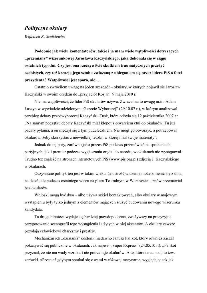 Polityczne okulary Wojciech K. Szalkiewicz Podobnie jak wielu komentatorów, takŜe i ja mam wiele wątpliwości dotyczących „przemiany” wizerunkowej Jarosława Kaczyńskiego, jaka dokonała się w ciągu ostatnich tygodni. Czy jest ona rzeczywiście skutkiem traumatycznych przeŜyć osobistych, czy teŜ kreacją jego sztabu związaną z ubieganiem się przez lidera PiS o fotel prezydenta? Wątpliwości jest sporo, ale… Ostatnio zwróciłem uwagę na jeden szczegół – okulary, w których pojawił się Jarosław Kaczyński w swoim orędziu do „przyjaciół Rosjan” 9 maja 2010 r. Nie ma wątpliwości, Ŝe lider PiS okularów uŜywa. Zwracał na to uwagę m.in. Adam Łaszyn w wywiadzie udzielonym „Gazecie Wyborczej” (29.10.07 r.), w którym analizował przebieg debaty przedwyborczej Kaczyński–Tusk, która odbyła się 12 października 2007 r.: „Na samym początku debaty Kaczyński miał kłopot z otwarciem etui do okularów. Tu juŜ padały pytania, a on męczył się z tym pudełeczkiem. Nie mógł go otworzyć, a potrzebował okularów, Ŝeby skorzystać z niewielkiej teczki, w której miał swoje materiały”. Jednak do tej pory, zarówno jako prezes PiS podczas przemówień na spotkaniach partyjnych, jak i premier podczas wygłaszania orędzi do narodu, w okularach nie występował. Trudno tez znaleźć na stronach internetowych PiS (www.pis.org.pl) zdjęcia J. Kaczyńskiego w okularach. Oczywiście polityk ten jest w takim wieku, Ŝe ostrość widzenia moŜe zmienić się z dnia na dzień, ale podczas ostatniego wiecu na placu Teatralnym w Warszawie – znów przemawiał bez okularów. Wnioski mogą być dwa – albo uŜywa szkieł kontaktowych, albo okulary w majowym wystąpieniu były tylko jednym z elementów mających słuŜyć budowaniu nowego wizerunku kandydata. Ta druga hipoteza wydaje się bardziej prawdopodobna, zwaŜywszy na precyzyjne przygotowanie scenografii tego wystąpienia i uŜytych w niej akcentów. A okulary zawsze przydają człowiekowi charyzmy i prestiŜu. Mechanizm ich „działania” odsłonił niedawno Janusz Palikot, który równieŜ zaczął pokazywać się publicznie w okularach. Jak napisał „Super Express” (24.05.10 r.): „Palikot przyznał, Ŝe nie ma wady wzroku i nie potrzebuje okularów. A te, które teraz nosi, to tzw. zerówki. »PrzecieŜ gdybym spotkał się z wami w róŜowej marynarce, wyglądając tak jak kiedyś, i mówiłbym, Ŝe jestem innym człowiekiem, dalibyście mi mniejszą szansę« – cynicznie tłumaczył”. Tak na marginesie – okulary mogą tez pełnić inną funkcję. Zgodnie z teorią mowy ciała (i potocznym mniemaniem) – „oczy są zwierciadłem duszy” między innymi z powodu tego, Ŝe nie moŜna nad nimi zapanować. Dlatego teŜ są one najbardziej „prawdomówną” częścią ciała człowieka. „Rozbiegany”, „błądzący” wzrok, czy teŜ rozszerzone lub zwęŜone źrenice to sygnały, z których moŜna wiele wyczytać – nie tak wcale dawno temu J. Kaczyński wspominał o „wilczych oczach” D. Tuska. Korzystają z tego m.in. zakochani, którzy patrząc sobie w oczy sprawdzają zaangaŜowanie partnerów, czy orientalni kupcy, którzy śledząc w oczach klientów zainteresowanie oferowanymi produktami. Aby zapobiegać „ujawnianiu prawdy przez oczy” stosuje się m.in. okulary, najlepiej ciemne. Oczywiście kreacja wizerunku kandydata na czas wyborów to tylko jeden z stałych elementów walki o elekcję. W trwającym obecnie „wyścigu” (chociaŜ zwaŜywszy na charakter kampanii – moŜna by raczej mówić o „spacerze”) do Pałacu Prezydenckiego okulary Kaczyńskiego z pewnością nie odegrają najistotniejszej roli. Ale warto pamiętać, Ŝe w tej walce liczy się kaŜdy element, kaŜdy drobiazg. Natomiast jednym z waŜniejszych elementów kampanii jest budowanie (i utrzymywanie na jak najwyŜszym poziomie) wiarygodności kandydata. Tę buduje się przez lata, a stracić ją moŜna w kilka minut. Wystarczy jedno zdarzenie, jeden gest, jedno słowo. Najlepszym przykładem jest to, często obecnie przywoływane – „Trzeba się było ubezpieczyć” – Włodzimierza Cimoszewicza z 1997 r.). Osobiście chciałbym wierzyć w szczerość przemiany Jarosława Kaczyńskiego. Jednak, dokonywana bez emocji (oraz sympatii czy antypatii politycznych) analiza jego wypowiedzi (nielicznych) i zachowań wiarę tę podwaŜają. A świeŜym „kwiatkiem w tym ogródku” są rewelacje (?) aktorki Anny Cugier-Kotki, które pojawiły się na blogu Piotra Tymochowicza, dotyczące jej roli – jako słynnej Pani Ani – w walce PiS-u o głosy przed ubiegłorocznymi wyborami do europarlamentu. Wprawdzie i w tym przypadku moŜna mieć sporo wątpliwości, ale… Wojciech K. Szalkiewicz