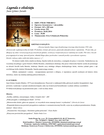 Legenda o złodzieju Juan Gómez-Jurado ISBN: 978-83-7508-869-4 Oprawa: broszurowa + skrzydełka Format: 143 x 205 mm Liczba stron: 552 Premiera: 26.02.2014 Cena: 39,90 Tłumaczenie: Ewa Urbańczyk-Piskorska KRÓTKO O KSIĄŻCE: „Dzwony katedry bijące tego dwudziestego trzeciego dnia kwietnia 1591 roku obwieszczały wypłynięcie floty do Indii. W dzielnicy Arenal, jak zawsze, panowała atmosfera fiesty i optymizmu. W tym roku, po dłużącej się zimie i towarzyszącym jej straszliwym głodzie, sewilczycy świętowali jeszcze radośniej niż zwykle. Pili wino z beczek przyciągniętych aż tutaj, śpiewali pieśni, składali Bogu ofiary pochwalne i zanosili prośby o powodzenie wyprawy. Dziwki i żebracy także robili dziś dobry interes [...]”. Po śmierci matki, która zmarła na dżumę, Sancho trafia do sierocińca, a następnie do pracy w tawernie. Nasłuchawszy się wcześniej od jednego z gości historii o Robin Hoodzie, szlachetnym złodzieju, bity przez właściciela Sancho ucieka do poznanego na ulicach Sewilli karła Bartola, złodzieja. Bartolo uczy młodego chłopca złodziejskiego fachu, wkrótce jednak ginie z rąk sewilskiego króla złodziei Monipodia. Sancho poprzysięga zemstę… Miłość, namiętność i zemsta – niezapomniana opowieść o chłopcu, w tajemniczy sposób ocalonym od śmierci, który dorósłszy, stanie się ostatnią nadzieją pokrzywdzonych… O AUTORZE: Juan Gómez-Jurado (Madryt, 1977) jest dziennikarzem. Pracował w redakcjach kilku głównych mediów hiszpańskich. Jego powieści, wydawane w ponad czterdziestu krajach, stały się światowymi bestsellerami i zyskały miliony czytelników. W Hollywood planuje się przeniesienie paru z nich na duży ekran. PRASA: „Szybka, ambitna, emocjonująca. Jedna z książek roku”. ABC „Pełna przygód, o zaskakującym finale”. El País „Mistrzowskie dzieło, gdzie nie spojrzeć, ze wszystkich stron emanuje kunszt i wyobraźnia”. Librería de Javier „Wspaniała historyczna powieść przygodowa osadzona w szesnastowiecznej Sewilli, czyta się za jednym posiedzeniem. Dzięki, mistrzu”. Maite Libros „Niesamowita i fascynująca. Absolutnie godna polecenia”. Punto Radio „Klasyczne powieścisko przygodowe”. Radio Onda Cero Sonia Draga Sp. z o.o., Pl. Grunwaldzki 8-10, 40-127 Katowice, Tel.: 327826477, 7826037, Fax: 032/ 2537728 Dział handlowy: Danuta Czarnowska, 693420384, [email protected] Promocja: Agnieszka Jedlińska, 695672067, [email protected] Redakcja: Katarzyna Procner-Chlebowska, 693520384, [email protected]
