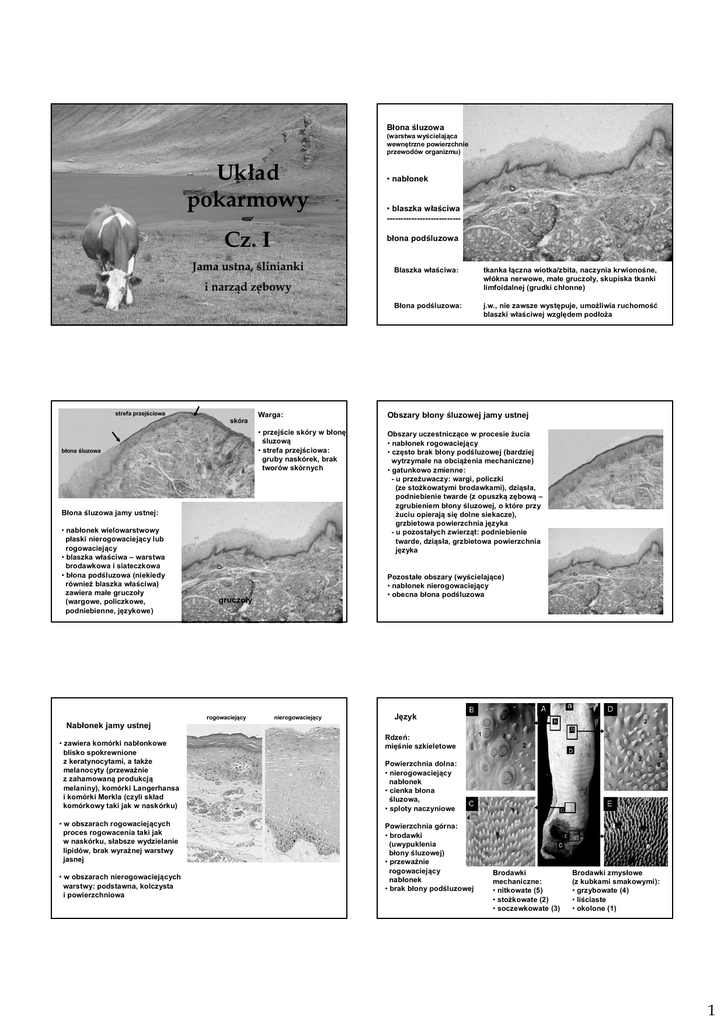Błona śluzowa (warstwa wyścielająca wewnętrzne powierzchnie przewodów organizmu) Układ pokarmowy Cz. I • nabłonek • blaszka właściwa --------------------------błona podśluzowa Jama ustna, ślinianki Blaszka właściwa: tkanka łączna wiotka/zbita, naczynia krwionośne, włókna nerwowe, małe gruczoły, skupiska tkanki limfoidalnej (grudki chłonne) Błona podśluzowa: j.w., nie zawsze występuje, umożliwia ruchomość blaszki właściwej względem podłoża i narząd zębowy strefa przejściowa skóra błona śluzowa Warga: Obszary błony śluzowej jamy ustnej • przejście skóry w błonę śluzową • strefa przejściowa: gruby naskórek, brak tworów skórnych Obszary uczestniczące w procesie żucia • nabłonek rogowaciejący • często brak błony podśluzowej (bardziej wytrzymałe na obciążenia mechaniczne) • gatunkowo zmienne: - u przeżuwaczy: wargi, policzki (ze stożkowatymi brodawkami), dziąsła, podniebienie twarde (z opuszką zębową – zgrubieniem błony śluzowej, o które przy żuciu opierają się dolne siekacze), grzbietowa powierzchnia języka - u pozostałych zwierząt: podniebienie twarde, dziąsła, grzbietowa powierzchnia języka Błona śluzowa jamy ustnej: • nabłonek wielowarstwowy płaski nierogowaciejący lub rogowaciejący • blaszka właściwa – warstwa brodawkowa i siateczkowa • błona podśluzowa (niekiedy również blaszka właściwa) zawiera małe gruczoły (wargowe, policzkowe, podniebienne, językowe) Pozostałe obszary (wyścielające) • nabłonek nierogowaciejący • obecna błona podśluzowa gruczoły rogowaciejący nierogowaciejący Język Nabłonek jamy ustnej • zawiera komórki nabłonkowe blisko spokrewnione z keratynocytami, a także melanocyty (przeważnie z zahamowaną produkcją melaniny), komórki Langerhansa i komórki Merkla (czyli skład komórkowy taki jak w naskórku) • w obszarach rogowaciejących proces rogowacenia taki jak w naskórku, słabsze wydzielanie lipidów, brak wyraźnej warstwy jasnej • w obszarach nierogowaciejących warstwy: podstawna, kolczysta i powierzchniowa Rdzeń: mięśnie szkieletowe Powierzchnia dolna: • nierogowaciejący nabłonek • cienka błona śluzowa, • sploty naczyniowe Powierzchnia górna: • brodawki (uwypuklenia błony śluzowej) • przeważnie rogowaciejący nabłonek • brak błony podśluzowej Brodawki mechaniczne: • nitkowate (5) • stożkowate (2) • soczewkowate (3) Brodawki zmysłowe (z kubkami smakowymi): • grzybowate (4) • liściaste • okolone (1) 1 Ogólna budowa brodawek Brodawki nitkowate Brodawki stożkowate Brodawki soczewkowate brodawki wtórne Brodawka pierwotna: uwypuklenie błony śluzowej • najliczniejsze u wszystkich zwierząt • ostro zakończone (jeden lub kilka „kolców” utworzonych przez silnie zrogowaciały nabłonek) • występują na całej powierzchni języka • nadają powierzchni języka szorstkość Brodawki wtórne: wpuklenia blaszki właściwej w obręb nabłonka Brodawki grzybowate • występują u psów, kotów i przeżuwaczy • kształt stożka • pokryte rogowaciejącym nabłonkiem • lokalizacja: tylna część języka, u przeżuwaczy również błona śluzowa policzków • występują u przeżuwaczy • okrągłe, spłaszczone • pokryte słabo rogowaciejącym nabłonkiem • lokalizacja: tylna część języka Brodawki liściaste Brodawki okolone kubki smakowe • rozszerzona część górna • pokryte nierogowaciejącym lub słabo rogowaciejącym nabłonkiem • na górnej powierzchni kilka kubków smakowych • lokalizacja: pomiędzy brodawkami nitkowatymi • nie występują u przeżuwaczy, szczątkowe u kotów • kształt fałdów zlokalizowanych na brzegach tylnej części języka • pokryte nierogowaciejącym nabłonkiem • trzy regularne brodawki wtórne • w nabłonku bocznych powierzchni liczne kubki smakowe • największe • otoczone głębokim rowkiem okołobrodawkowym • pokryte nierogowaciejącym lub słabo rogowaciejącym nabłonkiem • na górnej powierzchni liczne brodawki wtórne • na bocznych powierzchniach liczne kubki smakowe • lokalizacja: na granicy trzonu i korzenia języka otworek smakowy • komórki podstawne (macierzyste) otworek smakowy mikrokosmki /wypustki komórki typu 1,2 Pod brodawkami okolonymi i liściastymi leżą gruczoły von Ebnera (językowe tylne) • złożone gruczoły surowicze • leżą głęboko, między mięśniami języka • przewody uchodzą do rowka okołobrodawkowego i do rowków pomiędzy brodawkami liściastymi • produkują lipazę • oczyszczają i opłukują powierzchnie kubków smakowych komórki typu 3 • komórki zmysłowe (smakowe) typu 1, 2, 3 • zakończenia nerwowe Typ 1: (60 %) ciemna cytoplazma, mikrokosmki, ziarna wydzielnicze Typ 2: jasna cytoplazma, mikrokosmki, siateczka gładka, Typ 3: ciemna cytoplazma, grube wypustki szczytowe, pęcherzyki zawierające neuroprzekaźnik (ATP), kontakt z zakończeniami nerwowymi zakończenia nerwowe Kubek smakowy to beczułkowata grupa walcowatych komórek nabłonkowych wmontowana w otaczający nabłonek wielowarstwowy płaski. komórki podstawne Rozwój i różnicowanie komórek kubka: kom. podstawna → typ 1 → typ 2 → typ 3 Pojedyncze kubki występują również w nabłonku podniebienia i gardła 2 Jak działa kubek smakowy: Szczególne struktury języka 1. Związki chemiczne zawarte w pokarmie wiążą się z receptorami obecnymi w błonie komórkowej pokrywającej mikrokosmki/ wypustki. 2. Następuje otwarcie/zamknięcie kanałów jonowych lub aktywacja białek G – to powoduje aktywację komórek zmysłowych (otwarcie kanałów wapniowych, wzrost poziomu Ca) 3. Komórki typu 3 uwalniają neuroprzekaźnik z pęcherzyków (egzocytoza). 4. Nastepuje wzbudzenie sygnału we włóknie nerwowym i jego przekazanie do CSN. Jedna komórka – jeden smak Jeden kubek – wszystkie smaki Ślinianki (duże gruczoły ślinowe) • podjęzycze – wydłużona struktu