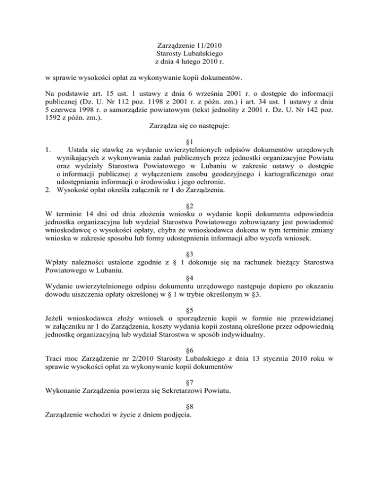Zarządzenie 11/2010 Starosty Lubańskiego z dnia 4 lutego 2010 r. w sprawie wysokości opłat za wykonywanie kopii dokumentów. Na podstawie art. 15 ust. 1 ustawy z dnia 6 września 2001 r. o dostępie do informacji publicznej (Dz. U. Nr 112 poz. 1198 z 2001 r. z późn. zm.) i art. 34 ust. 1 ustawy z dnia 5 czerwca 1998 r. o samorządzie powiatowym (tekst jednolity z 2001 r. Dz. U. Nr 142 poz. 1592 z późn. zm.). Zarządza się co następuje: §1 1. Ustala się stawkę za wydanie uwierzytelnionych odpisów dokumentów urzędowych wynikających z wykonywania zadań publicznych przez jednostki organizacyjne Powiatu oraz wydziały Starostwa Powiatowego w Lubaniu w zakresie ustawy o dostępie o informacji publicznej z wyłączeniem zasobu geodezyjnego i kartograficznego oraz udostępniania informacji o środowisku i jego ochronie. 2. Wysokość opłat określa załącznik nr 1 do Zarządzenia. §2 W terminie 14 dni od dnia złożenia wniosku o wydanie kopii dokumentu odpowiednia jednostka organizacyjna lub wydział Starostwa Powiatowego zobowiązany jest powiadomić wnioskodawcę o wysokości opłaty, chyba że wnioskodawca dokona w tym terminie zmiany wniosku w zakresie sposobu lub formy udostępnienia informacji albo wycofa wniosek. §3 Wpłaty należności ustalone zgodnie z § 1 dokonuje się na rachunek bieżący Starostwa Powiatowego w Lubaniu. §4 Wydanie uwierzytelnionego odpisu dokumentu urzędowego następuje dopiero po okazaniu dowodu uiszczenia opłaty określonej w § 1 w trybie określonym w §3. §5 Jeżeli wnioskodawca złoży wniosek o sporządzenie kopii w formie nie przewidzianej w załączniku nr 1 do Zarządzenia, koszty wydania kopii zostaną określone przez odpowiednią jednostkę organizacyjną lub wydział Starostwa w sposób indywidualny. §6 Traci moc Zarządzenie nr 2/2010 Starosty Lubańskiego z dnia 13 stycznia 2010 roku w sprawie wysokości opłat za wykonywanie kopii dokumentów §7 Wykonanie Zarządzenia powierza się Sekretarzowi Powiatu. §8 Zarządzenie wchodzi w życie z dniem podjęcia. Załącznik nr 1 do zarządzenia nr 11/2010 z dnia 4 lutego 2010 r. Koszty reprodukcji jednej strony. Rodzaj urządzenia Materiału kserokopiarka Papier ploter Papier Poświadczenie zgodności z oryginałem UZASADNIENIE format reprodukcji koszt reprodukcji [zł] A-4 1,00 A-3 1,00 A-2 10,50 A-1 12,00 A-1 do A-4 6,00 do zarządzenia nr 11/2010 z dnia 4 lutego 2010 r. w sprawie wysokości opłat za wykonywanie kopii dokumentów. W związku z potrzebą uregulowania zasad powielania dokumentów wynikających z art. 15 ust. 1 Ustawy o dostępie do informacji publicznej należało wprowadzić niniejsze zarządzenie według kosztów wyliczonych poniżej. Koszty materiałów do reprodukcji. Materiał konfekcjonowany w ryzach. Materiał do reprodukcji Papier kserograficzny Sztuk Cena brutto [ zł ] Koszt 1 kartki [ zł ] A-4 500 11,50 0,02 A-3 500 23,00 0,05 Materiał konfekcjonowany w rolkach. Materiał do reprodukcji Rozmiar rolki [szer./ dł ] Powierzchnia 1 rolki [m kw ] Koszt brutto [ zł ] Koszt 1m kw. Format Powierzchnia formatu [ m kw] Koszt jednostkowy [ zł ] Papier 0,594 / 175 103,95 76,71 0,74 A-2 0,25 0,18 A-1 0,50 0,37 Koszt robocizny. Płaca brutto [zł] Norma godzin pracy w miesiącu [ h ] Stawka godzinowa [ zł/h ] 2217,60 168 13,20 Rodzaj urządzenia Rodzaj i format odbitki Kserokopiarka Ploter Papier Papier Czas wykonania odbitki [min] Koszt robocizny [ zł ] A-4 2 0,44 A-3 2 0,44 A-2 8 1,76 A-1 10 2,20 Koszty amortyzacji urządzeń reprodukcyjnych. Rodzaj urządzenia Wartość początkowa [ zł ] Amortyzacja roczna [% ] Kwota rocznej raty amortyzacyjnej [zł] Ilość kopii w roku [szt ] Koszt amortyzacji odbitki [zł ] Kserokopiarka Nashuatec D422 29 976,62 14 4 196,73 42 000 0,10 Ploter HP DEsign Jet 500 16 024,70 14 2 243,46 400 5,61 Koszty energii elektrycznej. Rodzaj urządzenia Rodzaj odbitki Format odbitki Kserokopiarka papier A-4, A-3 ploter papier Pobór mocy [ kW ] Cena energii za 1 godz, [ zł ] Czas wykorzystania urządzenia. [min] Koszt energii/1 odbitkę 1,44 0,59 0,85 2 0,03 czuwanie 0,90 0,59 0,53 * 0,01 praca Cena 1 kWh [ zł ] A-2 0,15 0,59 0,09 8 0,01 A-1 0,15 0,59 0,09 10 0,02 *czas technologicznego czuwania urządzenia: 168 h / mies. x 12 mies.= 2016 h rocznie 42 000 odb./rocznie x 2 min. = 84 000 min = 1400 h 2016 h - 1400 h = 616 h czuwania 616 h czuwania x 0,53 zł / h = 326,48 zł 1162,26 zł : 42000 odb. = 0,01 zł Koszt materiałów eksploatacyjnych. Rodzaj urządzenia Materiał eksploatacyjny Cena brutto [ zł ] Wydajność [ szt.. ] Format Współczynnik formatu Koszt 1 odbitki Kserokopiarka Zestaw tonerów 671,00 19 000 A-4 1,0 0,04 A-3 2,0 0,07 Zestaw tuszy 529,48 A-2 0,5 0,53 A-1 1,0 1,06 Ploter 500 Koszty przeglądów, konserwacji i napraw urządzeń reprodukcyjnych. rodzaj urządzenia przewidywane koszty[ zł ] roczny nakład [ szt. ] koszt / 1 kopię [ zł ] kserokopiarka 1 650,00 42 000 0,04 ploter 1 000,00 400 2,50