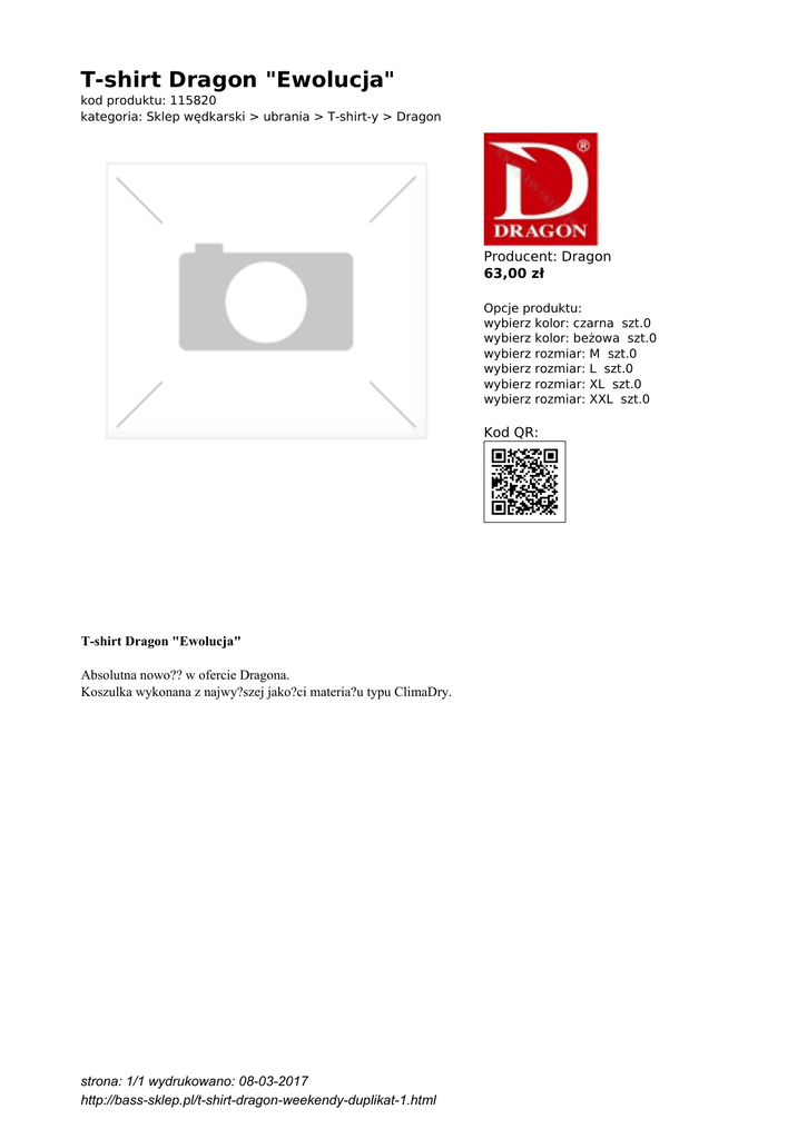 T-shirt Dragon "Ewolucja" kod produktu: 115820 kategoria: Sklep wędkarski > ubrania > T-shirt-y > Dragon Producent: Dragon 63,00 zł Opcje produktu: wybierz kolor: czarna szt.0 wybierz kolor: beżowa szt.0 wybierz rozmiar: M szt.0 wybierz rozmiar: L szt.0 wybierz rozmiar: XL szt.0 wybierz rozmiar: XXL szt.0 Kod QR: T-shirt Dragon "Ewolucja" Absolutna nowo?? w ofercie Dragona. Koszulka wykonana z najwy?szej jako?ci materia?u typu ClimaDry. strona: 1/1 wydrukowano: 08-03-2017 http://bass-sklep.pl/t-shirt-dragon-weekendy-duplikat-1.html