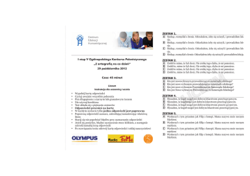 ZESTAW 1. A Siedząc, rozmyślał o Irenie. Odczekałem, żeby się uciszyli, i prowadziłem lekcję. B Siedząc, rozmyślał o Irenie. Odczekałem żeby się uciszyli, i prowadziłem lekcję. C Siedząc, rozmyślał o Irenie. Odczekałem, żeby się uciszyli i prowadziłem lekcję. D Siedząc, rozmyślał o Irenie. Odczekałem żeby się uciszyli i prowadziłem lekcję. I etap V Ogólnopolskiego Konkursu Polonistycznego „Z ortografią na co dzień” 29 października 2012 Czas: 45 minut Liceum Instrukcja dla uczennicy/ucznia ► ► ► ► ► ► ► ► ► ► ► Wypełnij kartę odpowiedzi Czytaj uważnie wszystkie polecenia Pisz długopisem z czarnym lub granatowym tuszem Nie używaj korektora Test składa się z piętnastu zestawów Odpowiedzi przenieś na kartę W każdym zestawie tylko jedna odpowiedź jest poprawna Poprawną odpowiedź zaznacz, zakreślając/zamalowując właściwą literę Staraj się nie popełniać błędów przy zaznaczaniu odpowiedzi Jeżeli się pomylisz, błędne zaznaczenie otocz kółkiem, a następnie zakreśl/zamaluj inną odpowiedź Po rozwiązaniu testu oderwij kartę odpowiedzi i oddaj nauczycielowi ZESTAW 2. A Zrobił to mimo, że był chory. Nie zrobię tego chyba, że mi pomożesz. B Zrobił to, mimo że był chory. Nie zrobię tego, chyba że mi pomożesz. C Zrobił to mimo, że był chory. Nie zrobię tego, chyba że mi pomożesz. D Zrobił to, mimo że był chory. Nie zrobię tego chyba, że mi pomożesz. M U ZESTAW 3. A Kto jest nowowybranym przewodniczącym samorządu szkolnego? B Kto jest nowo wybranym przewodniczącym samorządu szkolnego? C Kto jest nowo wybranym Przewodniczącym Samorządu Szkolnego? D Kto jest Nowo wybranym Przewodniczącym Samorządu Szkolnego? E C LI ZESTAW 4. A Słyszałem, że kogel-mogel jest dobrym lekarstwem przeciwgrypowym. B Słyszałem, że kogelmogel jest dobrym lekarstwem przeciwgrypowym. C Słyszałem, że kogel-mogel jest dobrym lekarstwem przeciw grypowym. D Słyszałem, że kogiel-mogiel jest dobrym lekarstwem przeciwgrypowym. ZESTAW 5. A Wyskoczył z tym pytaniem jak Filip z konopi. Mama nazywa mnie nocnym Markiem. B Wyskoczył z tym pytaniem jak fillip z konopi. Mama nazywa mnie nocnym markiem. C Wyskoczył z tym pytaniem jak Fillip z konopii. Mama nazywa mnie nocnym markiem D Wyskoczył z tym pytaniem jak filip z konopii. Mama nazywa mnie nocnym Markiem. łącznie. B „Napewno” piszemy na pewno łącznie. „Na prawdę” piszemy naprawdę rozdzielnie. C „Na pewno” piszemy na pewno rozdzielnie. „Na prawdę” piszemy na prawdę rozdzielnie. D „Napewno” piszemy na pewno łącznie. „Naprawdę” piszemy na prawdę łącznie. ZESTAW 7. A Nie waż się tego robić. Nawarzyłeś sobie piwa, to je wypij. Nie marz, że ci pomogę. B Nie warz się tego robić. Nawarzyłeś sobie piwa, to je wypij. Nie maż, że ci pomogę. C Nie waż się tego robić. Naważyłeś sobie piwa, to je wypij. Nie maż, że ci pomogę. D Nie warz się tego robić. Naważyłeś sobie piwa, to je wypij. Nie marz, że ci pomogę. M U E C ZESTAW 8. A Wjeżdżam na Sylwestra w góry. Tam, gdzie w zeszłym roku spędzałem An- LI drzejki i Mikołajki. B Wjeżdżam na sylwestra w góry. Tam, gdzie w zeszłym roku spędzałem Andrzejki i mikołajki. C Wjeżdżam na Sylwestra w góry. Tam, gdzie w zeszłym roku spędzałem andrzejki i Mikołajki. D Wjeżdżam na sylwestra w góry. Tam, gdzie w zeszłym roku spędzałem andrzejki i mikołajki. ZESTAW 9. A Rzężący rzęch stał w rozgrzanym od żarzącego słońca garażu. B Rzęrzący rzęch stał w rozgrzanym od rzarzącego słońca garażu. C Rzężący żęch stał w rozgżanym od żarzącego słońca garażu. D Żężący żęch stał w rozgżanym od rzażącego słońca garażu. ZESTAW 10. A Himeryczny hipohondryku! Za haniebny czyn nie dostaniesz holenderskich herbatników. B Chimeryczny hipochondryku! Za haniebny czyn nie dostaniesz holenderskich herbatników. C Himeryczny hipochondryku! Za chaniebny czyn nie dostaniesz cholenderskich herbatników. D Chimeryczny hipochondryku! Za haniebny czyn nie dostaniesz holenderskich cherbatników. ZESTAW 11. A Na ogół ta zasuwka pasuje do wszystkich typów drzwi. B Na ogół ta zasówka pasuje do wszystkich typuw drzwi. C Na ogół ta zasuwka pasuje do wszystkich typuw drzwi. D Na ogół ta zasówka pasuje do wszystkich typów drzwi. ZESTAW 12. A Chardy Henio harował przy produkcji inhalatorów. B Hardy Henio charował przy produkcji inhalatorów. C Hardy Henio harował przy produkcji inchalatorów. D Hardy Henio harował przy produkcji inhalatorów. M U E C ZESTAW 13. A Nie ma dla ciebie nadziei, jeżeli nie przeczytasz epopeii. B Nie ma dla ciebie nadziei, jeżeli nie przeczytasz epopei. C Nie ma dla ciebie nadzieji, jeżeli nie przeczytasz epopeji. D Nie ma dla ciebie nadziei, jeżeli nie przeczytasz epopeji. LI ZESTAW 14. A Próżny włóczęga okazał się tchórzem. B Prużny włóczęga okazał się tchórzem. C Próżny włuczęga okazał się tchórzem. D Próżny włóczęga okazał się tchurzem. ZESTAW 15. A Nie mogę cię zawieźć na dworzec. Nie mogę ugryźć tego jabłka. B Nie mogę cię zawieść na dworzec. Nie mogę ugryźć tego jabłka. C Nie mogę cię zawieźć na dworzec. Nie mogę ugryść tego jabłka. D Nie mogę cię zawieść na dworzec. Nie mogę ugryść tego jabłka. K A R TA OD P OW I E D Z I ............................................................................ imię ............................................................................ nazwisko ............................................................................ ............................................................................ nazwa szkoły ............................................................................ klasa, np. A, B, C PODPISZ SIĘ CZYTELNIE DRUKOWANYMI LITERAMI M U ODPOWIEDŹ 1 A B 2 A B C D C D 3 A B 4 A B C D C D 5 A B C D 6 7 A B C D A B C D 8 A B C D 9 A B C D 10 A B C D E C LI NUM
