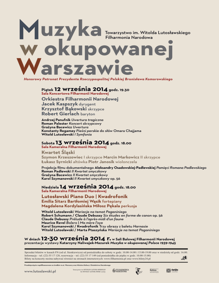 Towarzystwo im. Witolda Lutosławskiego Filharmonia Narodowa Honorowy Patronat Prezydenta Rzeczypospolitej Polskiej Bronisława Komorowskiego Piątek 12 września 2014 godz. 19.30 Sala Koncertowa Filharmonii Narodowej Orkiestra Filharmonii Narodowej Jacek Kaspszyk dyrygent Krzysztof Bąkowski skrzypce Robert Gierlach baryton Andrzej Panufnik Uwertura tragiczna Roman Palester Koncert skrzypcowy Grażyna Bacewicz Uwertura Konstanty Regamey Pieśni perskie do słów Omara Chajjama Witold Lutosławski I Symfonia Sobota 13 września 2014 godz. 18.00 Sala Kameralna Filharmonii Narodowej Kwartet Śląski Szymon Krzeszowiec I skrzypce Marcin Markowicz II skrzypce Łukasz Syrnicki altówka Piotr Janosik wiolonczela Projekcja filmu dokumentalnego Aleksandry Osadowskiej-Padlewskiej Pamięci Romana Padlewskiego Roman Padlewski II Kwartet smyczkowy Grażyna Bacewicz II Kwartet smyczkowy Karol Szymanowski II Kwartet smyczkowy op. 56 Niedziela 14 września 2014 godz. 18.00 Sala Kameralna Filharmonii Narodowej Lutosławski Piano Duo | Kwadrofonik Emilia Sitarz Bartłomiej Wąsik fortepiany Magdalena Kordylasińska Miłosz Pękala perkusja Witold Lutosławski Wariacje na temat Paganiniego Robert Schumann / Claude Debussy Six études en forme de canon op. 56 Claude Debussy Prélude à l'après-midi d'un faune Maurice Ravel Bolero | Ma mère l'oye Karol Szymanowski / Kwadrofonik Trzy obrazy z baletu Harnasie Witold Lutosławski / Marta Ptaszyńska Wariacje na temat Paganiniego 12-30 września 2014 r. w Sali Balowej Filharmonii Narodowej W dniach prezentacja wystawy Katarzyny Naliwajek-Mazurek Muzyka w okupowanej Polsce 1939-1945 Sprzedaż biletów w kasach FN (od ul. Sienkiewicza) od poniedziałku do soboty w godz. 10.00-14.00 i 15.00-19.00 oraz w niedzielę od godz. 16.00. Informacja – tel. (22) 55 17 128, rezerwacja – tel. (22) 55 17 149 (od poniedziałku do piątku w godz. 10.00-15.00) Bilety na koncerty można nabywać również na stronach internetowych: www.filharmonia.pl oraz www.bilety24.pl Przedsięwzięcie współfinansowane ze środków m.st. Warszawy oraz Ministra Kultury i Dziedzictwa Narodowego www.lutoslawski.pl