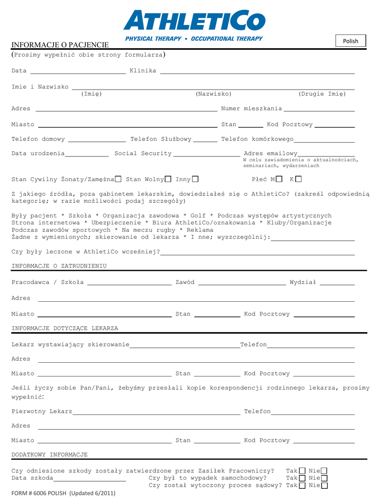 Polish INFORMACJE O PACJENCIE (Prosimy wypełnić obie strony formularza) Data Imie i Nazwisko Klinika (Imię) (Nazwisko) (Drugie Imię) Adres Numer mieszkania Miasto Stan Telefon domowy Data urodzenia Telefon Służbowy Social Security Stan Cywilny Żonaty/Zamężna Stan Wolny Kod Pocztowy Telefon komórkowego Adres emailowy W celu zawiadomienia o aktualnościach, seminariach, wydarzeniach Inny Płeć M K Z jakiego źródła, poza gabinetem lekarskim, dowiedziałeś się o AthletiCo? (zakreśl odpowiednią kategorię; w razie możliwości podaj szczegóły) Były pacjent * Szkoła * Organizacja zawodowa * Golf * Podczas występów artystycznych Strona internetowa * Ubezpieczenie * Biura AthletiCo/oznakowania * Kluby/Organizacje Podczas zawodów sportowych * Na meczu rugby * Reklama Żadne z wymienionych; skierowanie od lekarza * I nne; wyszczególnij: Czy były leczone w AthletiCo wcześniej? INFORMACJE O ZATRUDNIENIU Pracodawca / Szkoła Zawód Wydział Adres Miasto Stan Kod Pocztowy INFORMACJE DOTYCZĄCE LEKARZA Lekarz wystawiający skierowanie Telefon Adres Miasto Stan Kod Pocztowy Jeśli życzy sobie Pan/Pani, żebyśmy przesłali kopie korespondencji rodzinnego lekarza, prosimy wypełnić: Pierwotny Lekarz Telefon Adres Miasto Stan Kod Pocztowy DODATKOWY INFORMACJE Czy odniesione szkody zostały zatwierdzone przez Zasiłek Pracowniczy? Tak Data szkoda Czy był to wypadek samochodowy? Tak Czy został wytoczony proces sądowy? Tak FORM # 6006 POLISH (Updated 6/2011) Nie Nie Nie INFORMACJE O UBEZPIECZENIU Główna Firma Ubezpieczeniowa Imię i Nazwisko Posiadacza Ubezpieczenia Pokrewieństwo Numer Social Security Data Urodzenia Tel. do Ubezpieczenia Numer identyfikacyjny Numer Grupowy Drugorzędna Firma Ubezpieczeniowa Imię i Nazwisko Posiadacza Ubezpieczenia Pokrewieństwo Numer Social Security Data Urodzenia Tel. do Ubezpieczenia Numer identyfikacyjny Numer Grupowy UBEZPIECZENIE OD WYPADKÓW W PRACY Ubezpieczenie od Wypadków w Pracy Polisa Ubezpieczeniowa przez: (Nazwa Zakładu Pracy) Imię i Nazwisko Osoby Szacującej Świadczenia Imię i Nazwisko Pielęgniarki od Rehabilitacji Adwokat Tak Tel. Sprawa no. Tel. Fax Nie ZSADY FINANSOWE ATHLETICO • • • • Pacjenci z ubezpieczeniem zdrowotnym powinni pamiętać, że będą obciążeni opłatą za wyświadczone usługi, nie firma ubezpieczeniowa. W interesie naszych pacjentów będziemy sprawdzać pokrycie ubezpieczenia jak również będziemy zajmować się sprawozdaniem terapeutycznym; jakkolwiek, nie bierzemy odpowiedzialności za wynik. Jeśli opłata jest opóźniona, zmniejszona albo nastąpi odmowa opłaty, będzie Pan/i odpowiedzialny(a) za uregulowanie Pana(i) rachunku z naszą kasą. Wymagamy zawiadomienia o odwołaniu wizyty z 24 godzinnym wyprzedzeniem. Za niezastosowanie sie do przepisów, Pańskie konto będzie obciążone opłatą. ZGODA NA LECZENIE Pański podpis jest wymagany poniżej, żeby zezwolić na opiekę medyczną. Pański podpis także zezwala na wydanie informacji medycznych potrzebnych do rozpatrzenia roszczenia o świadczenia, pozwalając na ulokowanie świadczeń jeśli podanie o odszkodowanie zostało złożone, i do poświadczenia, że rozumie Pan/i powyższe zasady. Dodatkowy podpis o zgodę na leczenie jest wymagany od rodzica lub prawnego opiekuna pacjenta niepełnoletniego. Podpis Pacjenta Rodzic lub Opiekun Data / / Pełne imię i nazwisko Data HIPAA ZEZWOLENIE Zgodnie z procedurami HIPAA, zezwalam żeby poniższe osoby otrzymaly ustne informacje o rachunkach obciążających moje konto. Imię i Nazwisko/Pokrewieństwo Imię i Nazwisko/Pokrewieństwo FORM # 6006 POLISH (Updated 6/2011) Imię i Nazwisko/Pokrewieństwo POLISH HISTORIA ZDROWIA PACJENTA LECZONEGO AMBULATORYJNIE Proszę dokładnie odpowiedzieć na wszystkie pytania. Imię i nazwisko pacjenta: Wiek: Wzrost: Waga: Z jakim problemem przyszedł Pan/Pani dzisiaj do przychodni? Proszę wpisać datę (w przybliżeniu) pojawienia się obecnych symptomów: W tej chwili Pana/Pani symptomy: ZMNIEJSZYŁY SIĘ POGORSZYŁY SIĘ NIE ZMIENIŁY SIĘ Jakiemu leczeniu poddał się Pan/Pani w związku z obecnym problemem (zakreśl): Chiropraktyka Akupunktura Zastrzyki Rehabilitacja/Terapia Zajęciowa Inne: Czy korzystał Pan/Pani z rehabilitacji/terapii zajęciowej w ciągu ostatniego roku kalendarzowego? TAK NIE Proszę podać przybliżoną liczbę zajęc terapeutycznych, którym był Pan/Pani poddany w tym roku kalendarzowym Badania specjalistyczne przeprowadzone w związku z problemem i ich wyniki (zakreśl): Prześwietlenie rentgenem Scyntygrafia (skan) kości Rezonans magnetyczny (MRI) Tomografia komputerowa Inne: Czynność wypełniająca Pana/Pani dzień pracy (zakreśl): Siedzenie Dźwiganie (CT) Stanie Chodzenie Inne Zalecenia lekarskie dotyczące ograniczenia pracy: Lekka praca Bez ograniczeń Zwolnienie ZAJĘCIA WYKONYWANE DLA PRZYJEMNOŚCI: włączając sporty: Proszę podać nazwy wszystkich obecnie przyjmowanych lekarstw (tabletki, zastrzyki i/oraz plastry medyczne): ALERGIE: Proszę podać listę lekarstw, na które jest Pan/Pani uczulony: Proszę wymienić choroby oraz wszelkie zabiegi/operacje, które Pan/Pani przeszedł (proszę zaznaczyć, czy dotyczyły obecnego problemu) Czy w ostatnim miesiącu dokuczały Panu/Pani uczucia chandry, depresji lub beznadziei? TAK NIE Czy w ostatnim miesiącu stracił Pan/Pani zainteresowanie lub przestał czerpać przyjemność z wykonywania różnych rzeczy? TAK NIE Czy chciałby Pan/Pani zasięgnąć w związku z tym pomocy? TAK TAK, ALE NIE DZISIAJ NIE Czy jest jeszcze coś istotnego, o czym powinniśmy wiedzieć w związku z leczeniem? Czego Pan/Pani oczekuje po terapii? Jakim językiem się Pan/Pani posługuje? Czy zapewni Pan/Pani swojego tłumacza, jeśli nie jest to język angielski? 22. Wykres Ciała: Wykorzystując podane z boku symbole proszę zaznaczyć rejony na wykresie gdzie odczuwa Pan/Pani symptomy: Obecnie moje symptomy: PRZYCHODZĄ I ODCHODZĄ SĄ STAŁE ↓ O ║║ ≡ Ostry b