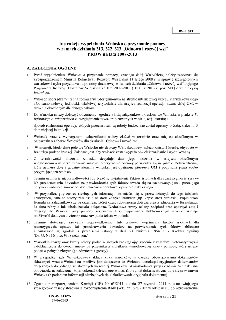 IW-1_313 Instrukcja wypełniania Wniosku o przyznanie pomocy w ramach działania 313, 322, 323 „Odnowa i rozwój wsi” PROW na lata 2007-2013 A. ZALECENIA OGÓLNE 1. Przed wypełnieniem Wniosku o przyznanie pomocy, zwanego dalej Wnioskiem, należy zapoznać się z rozporządzeniem Ministra Rolnictwa i Rozwoju Wsi z dnia 14 lutego 2008 r. w sprawie szczegółowych warunków i trybu przyznawania pomocy finansowej w ramach działania „Odnowa i rozwój wsi” objętego Programem Rozwoju Obszarów Wiejskich na lata 2007-2013 (Dz.U. z 2013 r, poz. 501) oraz niniejszą Instrukcją. 2. Wniosek sporządzany jest na formularzu udostępnionym na stronie internetowej urzędu marszałkowskiego albo samorządowej jednostki, właściwej terytorialnie dla miejsca realizacji operacji, zwaną dalej UM, w terminie określonym dla danego naboru. 3. Do Wniosku należy dołączyć dokumenty, zgodnie z listą załączników określoną we Wniosku w punkcie V. Informacja o załącznikach z uwzględnieniem wskazań zawartych w niniejszej Instrukcji. 4. Sposób rozliczania operacji, których przedmiotem są roboty budowlane został opisany w Załączniku nr 3 do niniejszej instrukcji. 5. Wniosek wraz z wymaganymi załącznikami należy złożyć w terminie oraz miejscu określonym w ogłoszeniu o naborze Wniosków dla działania „Odnowa i rozwój wsi”. 6. W sytuacji, kiedy dane pole we Wniosku nie dotyczy Wnioskodawcy, należy wstawić kreskę, chyba że w Instrukcji podano inaczej. Zalecane jest, aby wniosek został wypełniony elektronicznie i wydrukowany. 7. O terminowości złożenia wniosku decyduje data jego złożenia w miejscu określonym w ogłoszeniu o naborze. Złożenie wniosku o przyznanie pomocy potwierdza się na piśmie. Potwierdzenie, które zawiera datę i godzinę złożenia wniosku, jest opatrzone pieczęcią UM i podpisane przez osobę przyjmującą ten wniosek. 8. Termin usunięcia nieprawidłowości lub braków, wyjaśnienia faktów istotnych dla rozstrzygnięcia sprawy lub przedstawienia dowodów na potwierdzenie tych faktów uważa się za zachowany, jeżeli przed jego upływem nadano pismo w polskiej placówce pocztowej operatora publicznego. 9. W przypadku, gdy zakres niezbędnych informacji nie mieści się w przewidzianych do tego tabelach i rubrykach, dane te należy zamieścić na dodatkowych kartkach (np. kopie stron Wniosku, kopie stron formularzy załączników) ze wskazaniem, której części dokumentu dotyczą oraz z adnotacją w formularzu, że dana rubryka lub tabela została dołączona. Dodatkowe strony należy podpisać oraz opatrzyć datą i dołączyć do Wniosku przy pomocy zszywacza. Przy wypełnianiu elektronicznym wniosku istnieje możliwość dodawania wierszy oraz zawijania tekstu w polach. 10. Terminy dotyczące usuwania nieprawidłowości lub braków, wyjaśnienia faktów istotnych dla rozstrzygnięcia sprawy lub przedstawienia dowodów na potwierdzenie tych faktów obliczane i oznaczane są zgodnie z przepisami ustawy z dnia 23 kwietnia 1964 r. - Kodeks cywilny (Dz. U. Nr 16, poz. 93, z późn. zm.). 11. Wszystkie koszty oraz kwoty należy podać w złotych zaokrąglając zgodnie z zasadami matematycznymi z dokładnością do dwóch miejsc po przecinku z wyjątkiem wnioskowanej kwoty pomocy, którą należy podać w pełnych złotych (po odrzuceniu groszy). 12. W przypadku, gdy Wnioskodawca składa kilka wniosków, w okresie obowiązywania dokumentów składanych wraz z Wnioskiem możliwe jest dołączenie do Wniosku kserokopii oryginałów dokumentów dołączonych do jednego ze złożonych wcześniej Wniosków. Wnioskodawca przy składaniu Wniosku ma obowiązek, na załączonej kopii dokonać odręcznego wpisu, iż oryginał dokumentu znajduje się przy innym Wniosku (z podaniem informacji niezbędnych do zlokalizowania oryginału dokumentu). 13. Zgodnie z rozporządzeniem Komisji (UE) Nr 65/2011 z dnia 27 stycznia 2011 r. ustanawiającego szczegółowe zasady stosowania rozporządzenia Rady (WE) nr 1698/2005 w odniesieniu do wprowadzenia PROW_313/7/z 24-06-2013 Strona 1 z 21 procedur kontroli oraz do zasady wzajemnej zgodności w zakresie środków wsparcia rozwoju obszarów wiejskich, zwanym dalej Rozporządzeniem Komisji (UE) nr 65/2011) Wnioskodawca w dowolnym momencie po złożeniu wniosku o przyznanie pomocy może zwrócić się z pisemną prośbą o wycofaniu wniosku w całości lub w części. Jeżeli wnioskodawca został poinformowany o nieprawidłowościach w dokumentach lub o zamiarze przeprowadzenia kontroli na miejscu, w wyniku której następnie wykryto nieprawidłowości, wycofanie nie jest dozwolone w odniesieniu do części, których te nieprawidłowości dotyczą. Wycofanie wniosku w całości nie wywołuje żadnych skutków prawnych, powstaje więc sytuacja jakby wnioskodawca tego wniosku nie złożył. Natomiast wycofanie wniosku w części lub innej deklaracji (załącznika) sprawia, że wnioskodawca znajduje się w sytuacji sprzed złożenia odnośnych dokumentów lub ich części. 14. Przed złożeniem Wniosku należy upewnić się, czy: a) wniosek został podpisany i opieczętowany przez osobę reprezentującą Wnioskodawcę albo przez pełnomocnika w wyznaczonym do tego miejscu, b) wypełnione zostały wszystkie wymagalne pola Wniosku; c) załączone zostały wszystkie wymagane, dla danego rodzaju operacji, dokumenty (zgodnie z punktem V. Wniosku „Informacja o załącznikach”). 15. We Wniosku występują następujące rodzaje sekcji/pól: [SEKCJA OBOWIĄZKOWA] - sekcja obowiązkowa do wypełnienia przez Wnioskodawcę wpisanie odpowiednich danych lub zaznaczenie odpowiedniego pola, [SEKCJA OBOWIĄZKOWA O ILE DOTYCZY] – sekcję należy wypełnić, jeżeli Wnioskodawcy, [SEKCJA WYPEŁNIONA NA STAŁE] – sekcja nie podlegająca modyfikacjom, [POLE(A) OBOWIĄZKOWE] – pole(a) obowiązkowe do wypełnienia przez Wnioskodawcę wpisanie odpowiednich danych lub zaznaczenie odpowiedniego pola, [POLE WYPEŁNIA PRACOWNIK UM] – po