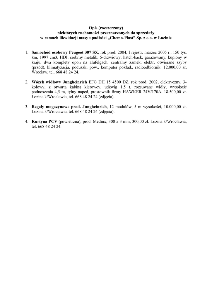 Opis (rozszerzony) niektórych ruchomości przeznaczonych do sprzedaży w ramach likwidacji masy upadłości „Chemo-Plast” Sp. z o.o. w Łozinie 1. Samochód osobowy Peugeot 307 SX, rok prod. 2004, I rejestr. marzec 2005 r., 150 tys. km, 1997 cm3, HDI, srebrny metalik, 5-drzwiowy, hatch-back, garażowany, kupiony w kraju, dwa komplety opon na alufelgach, centralny zamek, elektr. otwierane szyby (przód), klimatyzacja, poduszki pow., komputer pokład., radioodbiornik. 12.000,00 zł, Wrocław, tel. 668 48 24 24. 2. Wózek widłowy Jungheinrich EFG DH 15 4500 DZ, rok prod. 2002, elektryczny, 3kołowy, z otwartą kabiną kierowcy, udźwig 1,5 t, rozsuwane widły, wysokość podnoszenia 4,5 m, tylny napęd, prostownik firmy HAWKER 24V/170A. 18.500,00 zł. Łozina k/Wrocławia, tel. 668 48 24 24 (zdjęcia). 3. Regały magazynowe prod. Jungheinrich, 12 modułów, 5 m wysokości, 10.000,00 zł. Łozina k/Wrocławia, tel. 668 48 24 24 (zdjęcia). 4. Kurtyna PCV (powietrzna), prod. Mediux, 300 x 3 mm, 300,00 zł. Łozina k/Wrocławia, tel. 668 48 24 24.