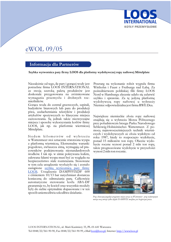 eWOL 09/05 Informacja dla Partnerów Szybka wytwornica pary firmy LOOS dla platformy wydobywczej ropy naftowej Mittelplate Niezale¿nie od tego, ile pary i gor¹cej wody jest potrzebne firma LOOS INTERNATIONAL ze swoj¹ szerok¹ palet¹ produktów jest doskonale przygotowana na zró¿nicowane wymagania przemys³u i drobnych rzemieœlników. Gor¹ca woda do central grzewczych, szpitali, budynków biurowych lub para do produkcji piwa, uszlachetniania tekstyliów i produkcji artyku³ów spo¿ywczych to klasyczne miejsca zastosowania. S¹ jednak tak¿e niezwyczajne miejsca i sposoby wykorzystania kot³ów firmy LOOS, jak np. na platformie wiertniczej Mittelplate. Siedem kilometrów od wybrze¿a w Wattenmeer stoi sztucznie stworzona wyspa z platform¹ wiertnicz¹. Ekstremalne warunki pogodowe, zw³aszcza zim¹, wymagaj¹ od pracowników podejmowania niestandardowych œrodków. I tak np. w zimie pokrywana lodem, zalewana falami wyspa musi byæ ze wzglêdu na bezpieczeñstwo stale rozmra¿ana. Stosowane w tym celu urz¹dzenie wys³u¿y³o siê i zosta³o zast¹pione szybk¹ wytwornic¹ pary firmy LOOS. Urz¹dzenie DAMPFFIXDF 600 z ciœnieniem 10/13 bar natychmiast dostarcza konieczn¹ do odmra¿ania parê. Ca³kowicie automatyczne sterowanie kot³a ABA-DF gwarantuje to, by kocio³ oraz wszystkie modu³y by³y do siebie optymalnie dopasowane i w ten sposób uniemo¿liwia szkodliwe dzia³anie. Przetarg na wykonanie robót wygra³a firma Witthohn i Faust z Freiburga nad £ab¹. Za poœrednictwem pobliskiej filii firmy LOOS Nord w Hamburgu zlecenie uda³o siê za³atwiæ szybko i sprawnie. Za tê jedyn¹ platformê wydobywcz¹ ropy naftowej u wybrze¿y Niemiec odpowiedzialna jest firma RWE Dea. Najwiêksze niemieckie z³o¿a ropy naftowej znajduj¹ siê u wybrze¿a Morza Pó³nocnego przy po³udniowym brzegu Parku Narodowego Schleswig-Holsteinisches Wattenmeer. Z pomoc¹ najnowoczeœniejszych technik wiertniczych i wydobywczych ze z³o¿a wydobyto od roku 1987, kiedy to rozpoczêto wydobycie, ponad 15 milionów ton ropy. Obecne wydobycie roczne wynosi ponad 2 mln ton ropy, tak¿e prognozowane wydobycie w przysz³oœci wynosi 2 mln ton rocznie. Przy s³onecznej pogodzie przyjemne miejsce pracy na Wattenmeer - przy wzburzonym morzu oraz mrozie tylko dziêki DAMPFIX mo¿liwa jest bezpieczna praca. LOOS INTERNATIONAL, ul. Marii Kazimiery 35, PL-01-641 Warszawa Tel 0048/22/561-90-90, Fax 0048/22/561-90-99, eMail [email protected], Internet http://www.loos.pl