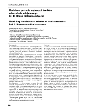 &ARM0RZEGL.AUK -ODELOWEPOSTACIEWYBRANYCHuRODKÌW ZNIECZULENIAMIEJSCOWEGO #Z))/CENABIOFARMACEUTYCZNA -ODELDRUGFORMULATIONSOFSELECTEDOFLOCALANAESTHETICS 0ART))"IOPHARMACEUTICALASSESSMENT -ONIKA"ALCERKIEWICZ%DMUND'RZEuKOWIAK 0ASCAL,E#ORRE-AJA2ATAJCZAK%NSELME!NNA7OLC +RZYSZTOF3TEFANKIEWICZ +ATEDRAI:AKAD&ARMACJI+LINICZNEJI"IOFARMACJI 5NIWERSYTET-EDYCZNYIM+AROLA-ARCINKOWSKIEGOW0OZNANIU ,ABORATOIREDE0HARMACIE'ALENIQUEET"IOPHARMACIE5NIVERSITÂDE2ENNES +ATEDRA'ENETYKII0ODSTAW(ODOWLI:WIERZT 5NIWERSYTET0RZYRODNICZYW0OZNANIU Streszczenie W ostatnim okresie podejmowane są liczne próby dotyczące poszukiwania bezpieczniejszych i skuteczniejszych leków, między innymi przez próby chemicznej syntezy czystych izomerów optycznych wcześniej poznanych substancji leczniczych. Podobny kierunek badań w grupie anestetyków lokalnych doprowadził do syntezy lewobupiwakainy i ropiwakainy. Dzięki mniejszej lipofilności oraz słabszemu powinowactwu do kanałów sodowych i potasowych mięśnia sercowego, substancje te utraciły cechy, które w przypadku związku macierzystego decydowały o jego wysokiej toksyczności. Z myślą o osiągnięciu bezpieczniejszej oraz efektywniejszej analgezji, jak dotąd badano wiele nowoczesnych form leku. Dobre rezultaty w badaniach przedklinicznych przyniosło wykorzystanie mikrosfer polimerowych. Wyniki tych badań sugerują, że uzyskanie efektu przedłużonego uwalniania leków inkorporowanych w mikrosferach pozwala na osiągnięcie przedłużonej analgezji oraz jednoczesne zmniejszenie ryzyka wystąpienia działań niepożądanych. W niniejszej pracy przeprowadzono badania mające na celu ocenę przebiegu procesów kinetycznych jakim podlega substancja lecznicza po zastosowaniu jej w modelowej postaci mikrosfer polimerowych. Doświadczenie z wykorzystaniem zwierząt doświadczalnych przeprowadzono w dwóch etapach. W I etapie badań, grupie zwierząt zakwalifikowanych do grupy kontrolnej podano domięśniowo roztwór chlorowodorku ropiwakainy. W II etapie badań celem określenia farmakokinetyki ropiwakainy uwolnionej z mikrosfer polimerowych, grupie zwierząt podano lek w równoważnej dawce w postaci iniekcji domięśniowej. Badaną substancję oznaczono w osoczu krwi królików zaadaptowaną i zwalidowaną metodą HPLC UV-VIS. Na podstawie przeprowadzonych oznaczeń oszacowano wartości wybranych parametrów farmakokinetycznych. Abstract Over the last years research in anaesthetic pharmacology have been focused on increasing safety of anaesthetics by synthesis of their optical isomers. Similar trend has been noticed with local anaesthetics leading to synthesis of levobupivacaine and ropivacaine. Due to decreased lipid solubility and lower affinity to sodium- potassiumchannels located in heart muscle, these drugs lost those properties, which, in case of the original compound, were responsible for its high toxicity. To achieve safer and more effective analgesia, up to now, many new drug formulations were evaluated. Good results in preclinical studies were obtained with polymer microspheres. Those results suggest that prolonged release of active substance form incorporated microspheres allows to achieve sustained analgesia and lower risk of adverse reactions. In our work we analysed the impact of ropivacaine administration in a form of model polymer microspheres on ropivacaine pharmacokinetic. In our two stage study we used animal model. In the first stage to our control group we administered solution of ropivacaine hydrochloride intramuscularly. In a second stage to establish pharmacokinetic of ropivacaine incorporated in polymer microspheres we administered the drug to a group of animals in an equivalent dose as an intramuscular injection. Concentration of ropivacaine in rabbit plasma was measured by validated and adapted HPLC with UV VIS detection and primary pharmacokinetic parameters were calculated. COPYRIGHT'RUPADR!2+WIECIÊSKIEGO)33. Uzyskane wyniki pozwoliły na stwierdzenie, że domięśniowe podanie ropiwakainy w postaci mikrosfer polimerowych wpływa na modyfikację procesów farmakokinetycznych badanej substancji leczniczej. Podanie leku w postaci mikrosfer polimerowych zmniejsza absorpcję do krążenia ogólnego oraz wydłuża proces eliminacji leku. Słowa kluczowe: mikrosfery, ropiwakaina, znieczulenie miejscowe, PLGA Wstęp Spośród środków znieczulenia miejscowego, najbardziej przydatna w niemal wszystkich rodzajach znieczulenia jest bupiwakaina (BP). Jej szczególne cechy farmakokinetyczno-farmakodynamiczne decydują o zastosowaniu BP w uśmierzaniu bólu porodowego, około- i pooperacyjnego oraz nowotworowego. Powszechną praktyką kliniczną jest stosowanie tego leku w postaci ciągłego znieczulenia zewnątrzoponowego. Wykonywane jest ono techniką powtarzalnych dawek frakcjonowanych lub ciągłego wlewu przez cewnik umieszczony w przestrzeni zewnątrzoponowej. Zarówno w pierwszym jak i drugim przypadku może jednak dojść do zagrażającego życiu podpajęczynówkowego lub donaczyniowego wstrzyknięcia zewnątrzoponowej dawki środka znieczulenia miejscowego [1]. Celem zmniejszenia ryzyka powikłań blokad centralnych z zastosowaniem BP, spośród których wymienia się również zwiększone zagrożenie infekcją bakteryjną oraz rzadziej występujące komplikacje neurologiczne, wciąż poszukuje się nowych, bezpieczniejszych metod znieczulenia [2, 3]. Dla ciągłej analgezji zewnątrzoponowej mogłoby to być podanie jednorazowej dawki środka znieczulenia miejscowego w postaci, która ograniczyłaby wchłanianie substancji leczniczej do krwiobiegu, zmniejszając w ten sposób ryzyko wystąpienia objawów działania kardio- i neurotoksycznego oraz wydłużając czas działania farmakologicznego leku [4, 5]. Realne zagrożenie pojawienia się objawów działania toksycznego w przebiegu znieczulenia BP, wynika z faktu znacznej toksyczności tego leku w porównaniu z innymi środkami znieczulenia miejscowego. Wzrost stężenie BP w osoczu po