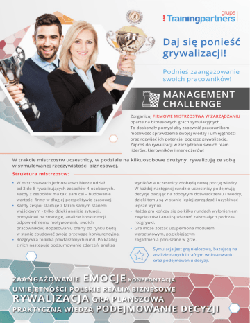 Daj się ponieść grywalizacji! Podnieś zaangażowanie swoich pracowników! MANAGEMENT CHALLENGE Zorganizuj FIRMOWE MISTRZOSTWA W ZARZĄDZANIU oparte na biznesowych grach symulacyjnych. To doskonały pomysł aby zapewnić pracownikom możliwość sprawdzenia swojej wiedzy i umiejętności oraz rozwijać ich potencjał poprzez grywalizację. Zaproś do rywalizacji w zarządzaniu swoich team liderów, kierowników i menedżerów! W trakcie mistrzostw uczestnicy, w podziale na kilkuosobowe drużyny, rywalizują ze sobą w symulowanej rzeczywistości biznesowej. Struktura mistrzostw: ▪ W mistrzostwach jednorazowo bierze udział od 3 do 8 rywalizujących zespołów 4-osobowych. Każdy z zespołów ma taki sam cel – budowanie wartości firmy w długiej perspektywie czasowej. ▪ Każdy zespół startuje z takim samym stanem wyjściowym - tylko dzięki analizie sytuacji, pomysłowi na strategię, analizie konkurencji, odpowiedniemu motywowaniu swoich pracowników, dopasowaniu oferty do rynku będą w stanie zbudować swoją przewagę konkurencyjną. ▪ Rozgrywka to kilka powtarzalnych rund. Po każdej z nich następuje podsumowanie zdarzeń, analiza ZAANGAŻOWANIE wyników a uczestnicy zdobędą nową porcję wiedzy. W każdej następnej rundzie uczestnicy podejmują decyzje bazując na zdobytym doświadczeniu i wiedzy, dzięki temu są w stanie lepiej zarządzać i uzyskiwać lepsze wyniki. ▪ Każda gra kończy się po kilku rundach wyłonieniem zwycięzców i analizą zdarzeń zaistniałych podczas rozgrywki. ▪ Gra może zostać uzupełniona modułem warsztatowym, pogłębiającym zagadnienia poruszane w grze. Symulacja jest grą nielosową, bazującą na analizie danych i trafnym wnioskowaniu oraz podejmowaniu decyzji. EMOCJE KONFRONTACJA UMIEJĘTNOŚCI POLSKIE REALIA BIZNESOWE RYWALIZACJA GRA PLANSZOWA PRAKTYCZNA WIEDZA PODEJMOWANIE DECYZJI Proponujemy 3 główne obszary tematyczne mistrzostw: ▪ MOTYWOWANIE I ZARZĄDZANIE ZESPOŁEM na bazie gry Leadership Simulation ▪ ZARZĄDZANIE FIRMĄ na bazie gry Management Simulation ▪ ZARZĄDZANIE FINANSAMI (finanse dla nie finansistów) na bazie gry Finance Simulation W poszczególnych grach zespoły mogą sprawdzić swoją wiedzę z zakresu: Leadership Simulation ▪ funkcje personalne firmy, realizowane przez liderów i menedżerów, ▪ działania personalne w obszarach komunikacji, planowania obsad, tworzenia efektywnych zespołów, ▪ motywowanie „bez finansów”, znajomość różnych czynników motywowania i ich zastosowanie w praktyce, ▪ koszty działań personalnych, ▪ wpływ działań personalnych na budowanie wartości przedsiębiorstwa. Management Simulation ▪ budowanie strategii i wdrażanie jej w życie, ▪ analiza rynku i konkurencji, ▪ przenoszenie strategii na cele operacyjne oraz na działania poszczególnych pracowników, ▪ reagowanie na dynamikę otoczenia konkurencyjnego, ▪ rozumienie rachunku wyników, ▪ wpływ właściwej strategii na budowanie wartości przedsiębiorstwa. Finance Simulation ▪ podstawowe pojęcia finansowe: płynność finansowa, amortyzacja, budżet, koszty, ▪ różnice pomiędzy funkcją finansową a funkcją rachunkową firmy, ▪ wpływ decyzji menedżerów na finanse przedsiębiorstwa, ▪ praca z rachunkiem wyników i wskaźnikami ekonomicznymi, ▪ wpływ właściwego zarządzania finansami na budowanie wartości firmy. Dlaczego gry symulacyjne? ▪ Konstrukcja gier powoduje że uczestnicy muszą aktywnie działać i doświadczają efektów swoich decyzji. ▪ Gry bardzo wiernie odzwierciedlają rzeczywistość biznesową. ▪ Angażują emocjonalnie uczestników. ▪ Rozgrywka przebiega powtarzalnymi etapami, uczestnicy mają szansę na podejmowanie coraz trafniejszych decyzji i osiągania coraz lepszych wyników. ZORGANIZUJ FIRMOWE MISTRZOSTWA ZARZĄDZANIA O PUCHAR TWOJEJ FIRMY 1 dzień / 12 – 32 uczestników Skontaktuj się z nami i poznaj szczegóły: [email protected] tel. 32 332 74 30
