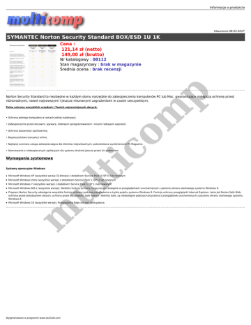 Informacje o produkcie Utworzono 08-03-2017 SYMANTEC Norton Security Standard BOX/ESD 1U 1K Cena : 121,14 zł (netto) 149,00 zł (brutto) m p Nr katalogowy : 08112 Stan magazynowy : brak w magazynie Średnia ocena : brak recenzji Norton Security Standard to niezbędne w każdym domu narzędzie do zabezpieczenia komputerów PC lub Mac, gwarantujące najlepszą ochronę przed różnorodnymi, nawet najnowszymi i jeszcze nieznanymi zagrożeniami w czasie rzeczywistym. Pełna ochrona wszystkich urządzeń i Twoich najcenniejszych danych: • Ochrona jednego komputera w ramach jednej subskrypcji. • Zabezpieczenie przed wirusami, spyware, złośliwym oprogramowaniem i innymi rodzajami zagrożeń. • Bezpieczeństwo transakcji online. ti co • Ochrona tożsamości użytkownika. • Najlepiej oceniana usługa zabezpieczająca dla klientów indywidualnych, potwierdzona wyróżnieniami PC Magazine. • Alarmowanie o niebezpiecznych aplikacjach dla systemu Android jeszcze przed ich pobraniem. Wymagania systemowe Systemy operacyjne Windows Microsoft Windows XP (wszystkie wersje 32-bitowe) z dodatkiem Service Pack 3 (SP 3) lub nowszym ● Microsoft Windows Vista (wszystkie wersje) z dodatkiem Service Pack 1 (SP 1) lub nowszym ● Microsoft Windows 7 (wszystkie wersje) z dodatkiem Service Pack 1 (SP 1) lub nowszym ● Microsoft Windows 8/8.1 (wszystkie wersje). Niektóre funkcje ochrony mogą nie być dostępne w przeglądarkach uruchamianych z poziomu ekranu startowego systemu Windows 8. ● Program Norton Security udostępnia wszystkie funkcje ochrony podczas przeglądania w trybie pulpitu systemu Windows 8. Funkcje ochrony przeglądarki Internet Explorer, takie jak Norton Safe Web, ochrona przed wyłudzaniem danych, ochrona przed oszustwami, Safe Search i Identity Safe, są niedostępne podczas korzystania z przeglądarek uruchomionych z poziomu ekranu startowego systemu Windows 8. Microsoft Windows 10 (wszystkie wersje). Przeglądarka Edge nie jest obsługiwana. m ● ul ● Wygenerowano w programie www.oscGold.com