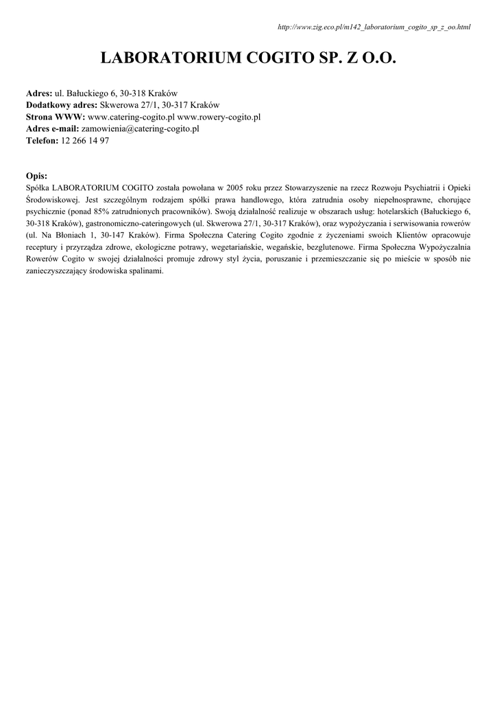 http://www.zig.eco.pl/m142_laboratorium_cogito_sp_z_oo.html LABORATORIUM COGITO SP. Z O.O. Adres: ul. Bałuckiego 6, 30-318 Kraków Dodatkowy adres: Skwerowa 27/1, 30-317 Kraków Strona WWW: www.catering-cogito.pl www.rowery-cogito.pl Adres e-mail: [email protected] Telefon: 12 266 14 97 Opis: Spółka LABORATORIUM COGITO została powołana w 2005 roku przez Stowarzyszenie na rzecz Rozwoju Psychiatrii i Opieki Środowiskowej. Jest szczególnym rodzajem spółki prawa handlowego, która zatrudnia osoby niepełnosprawne, chorujące psychicznie (ponad 85% zatrudnionych pracowników). Swoją działalność realizuje w obszarach usług: hotelarskich (Bałuckiego 6, 30-318 Kraków), gastronomiczno-cateringowych (ul. Skwerowa 27/1, 30-317 Kraków), oraz wypożyczania i serwisowania rowerów (ul. Na Błoniach 1, 30-147 Kraków). Firma Społeczna Catering Cogito zgodnie z życzeniami swoich Klientów opracowuje receptury i przyrządza zdrowe, ekologiczne potrawy, wegetariańskie, wegańskie, bezglutenowe. Firma Społeczna Wypożyczalnia Rowerów Cogito w swojej działalności promuje zdrowy styl życia, poruszanie i przemieszczanie się po mieście w sposób nie zanieczyszczający środowiska spalinami.